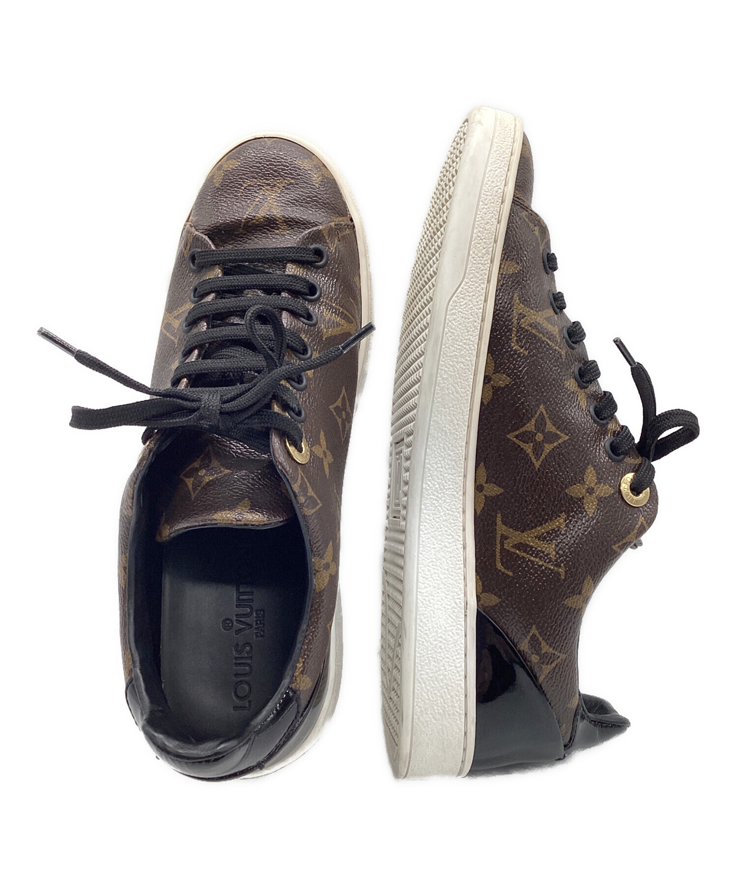 | スタッフコメント | LOUIS VUITTON(ルイ ヴィトン)フロントローライン ルイヴィトンの代名詞とも呼べる「モノグラムキャンバス」がアッパーに施された王道デザインのスニーカー。 ヒール部や紐にワンポイントでブラックを採用しており、上品で大人びた印象の一足です。 |