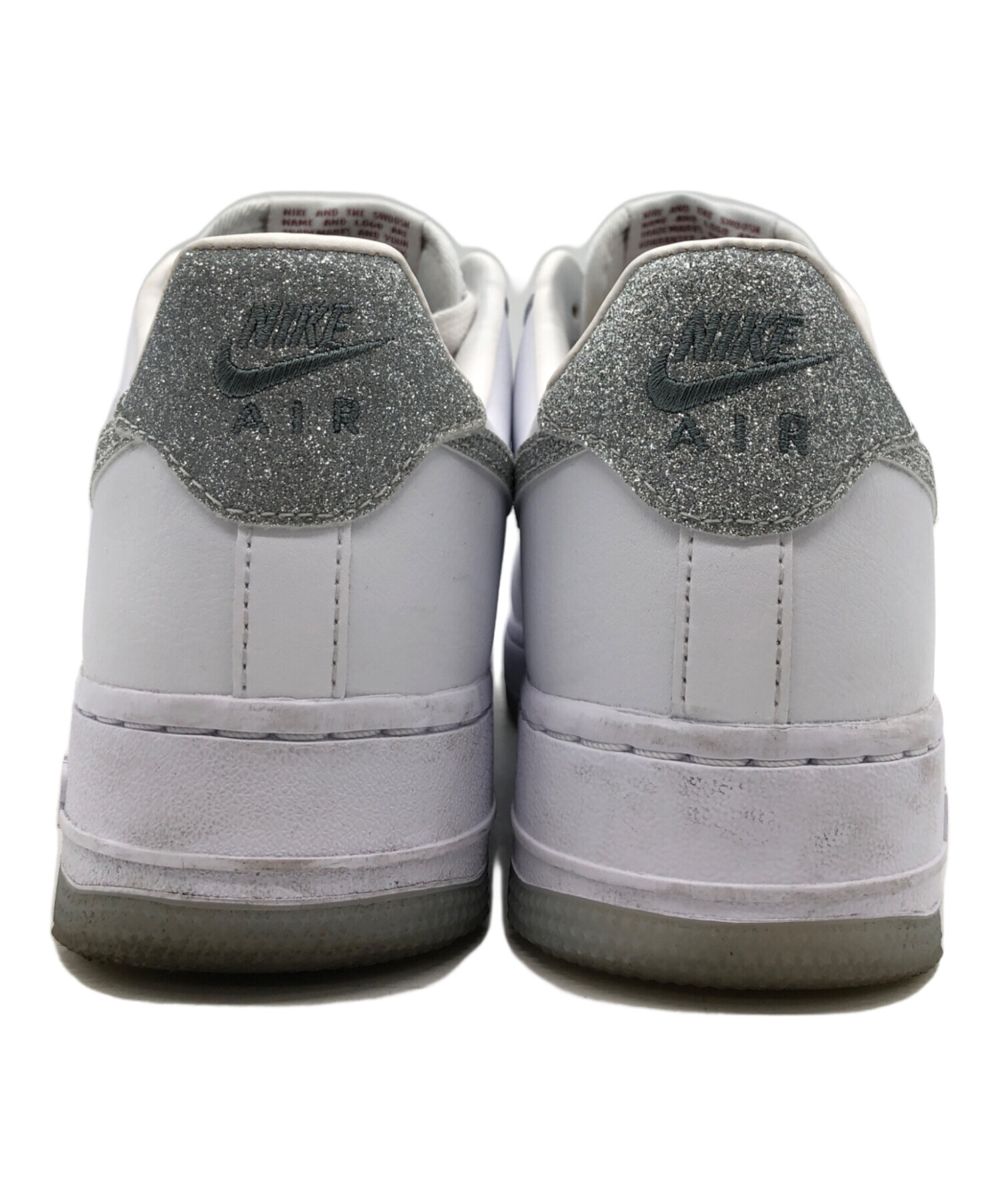 | スタッフコメント | ナイキのエアフォース1のスニーカーです。レディースはもちろんメンズでもご使用できます。側面のロゴや甲の部分にはシルバーにラメ仕様を施しており、足元を一目引く一品となっております。使用感はありますがまだまだ使用できる一品です。 |