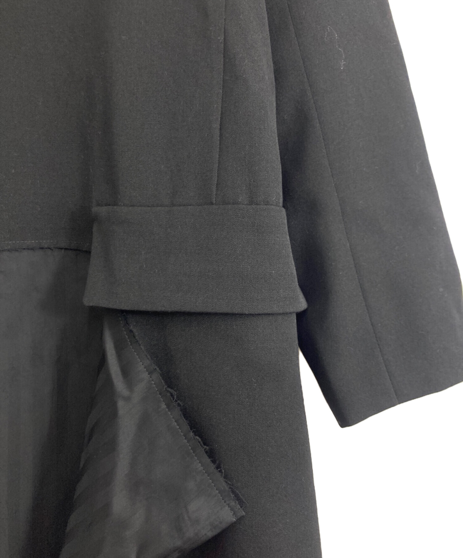 | スタッフコメント | 仕上げ工程で織物に軽くシワ等をつけ、片側の生地が剥がれてめくれているようなデザインが特徴的なロングジャケットです。 |