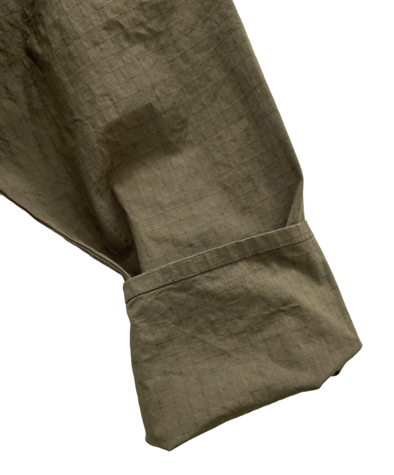| スタッフコメント | こちらのアイテムはリップストップ生地の採用により、非常に軽量でありながら生地が裂けてもそれ以上の進行を防ぐ圧倒的な耐久性を実現しています。さらにガーメントダイ(製品染め)が施されているため、リップストップ特有の格子模様の凹凸に沿って染料が深く入り込み、無機質なテクニカル素材でありながら奥深い立体感と独特の光沢感を放っています。 |