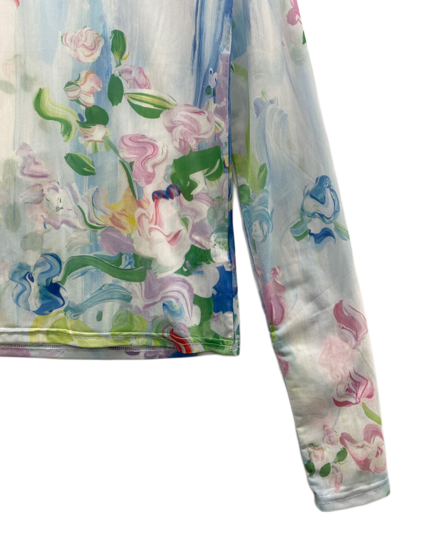 | スタッフコメント | このシャツの最大の魅力は、澄んだブルーに可憐な花々が浮かび上がるような繊細なプリントデザインにあります。シアー素材を採用することで、肌がうっすらと透け、花柄が体に溶け込むような独特のニュアンスが生まれます。POPPYらしい「ワクワクを形にする」デザインが反映された一着です。 |