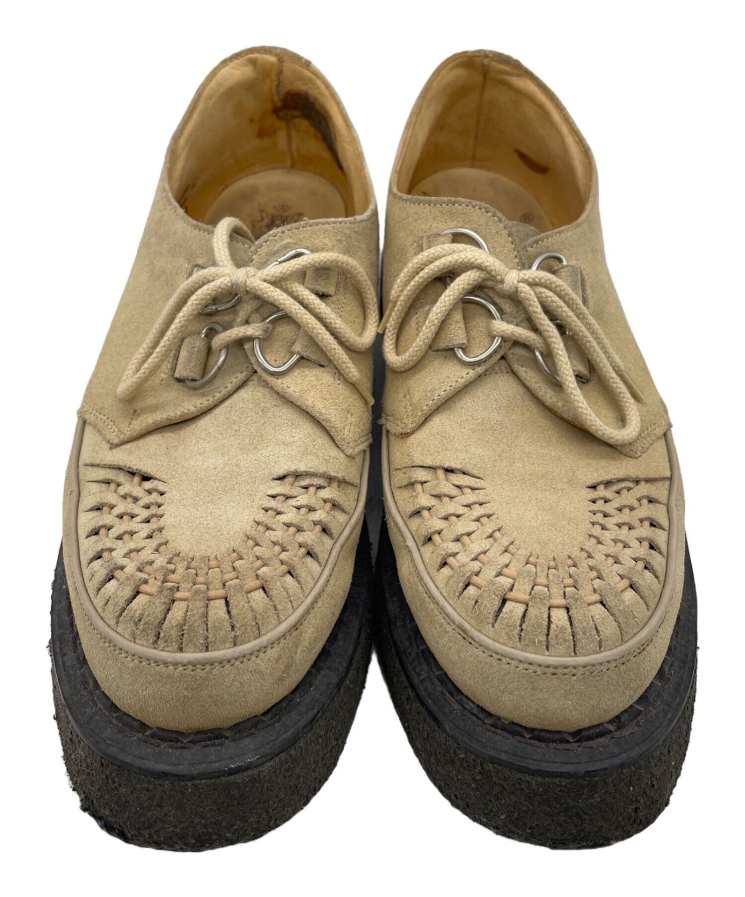 スタッフコメント このモデルの最大の特徴は、アッパーにあしらわれた編み込みのデザインにあります。この複雑な編み込みが無骨なラバーソールに繊細な装飾性を加え、ロックな激しさの中にも英国らしい気品を感じさせてくれます。また、甲の部分には、機能美とパンクな意匠を両立させるジョージコックスを象徴するアイコニックなDリングが備わっています。