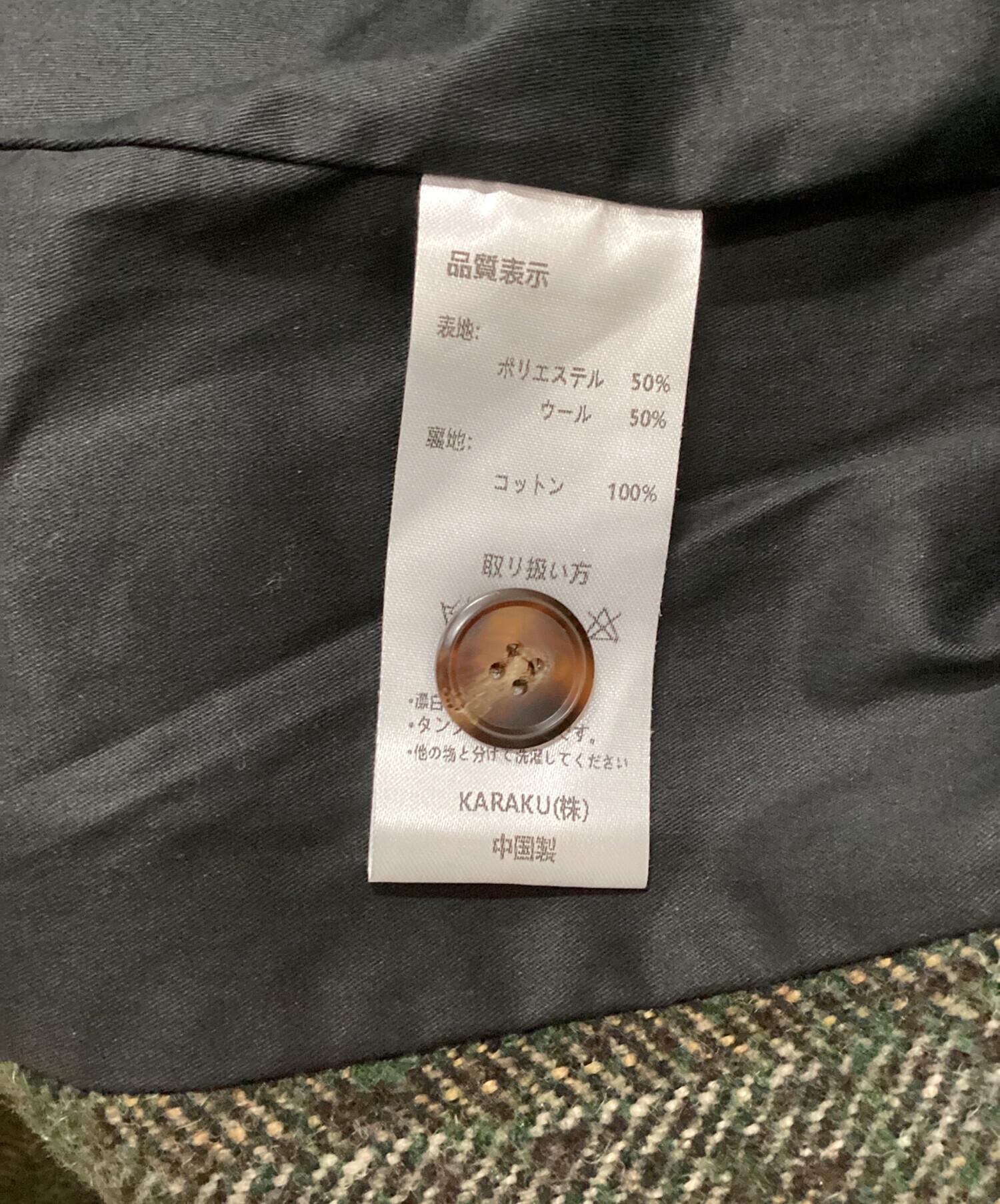 | 素材 | 表地: ポリエステル 50% ウール 50% 裏地: コットン 100% |