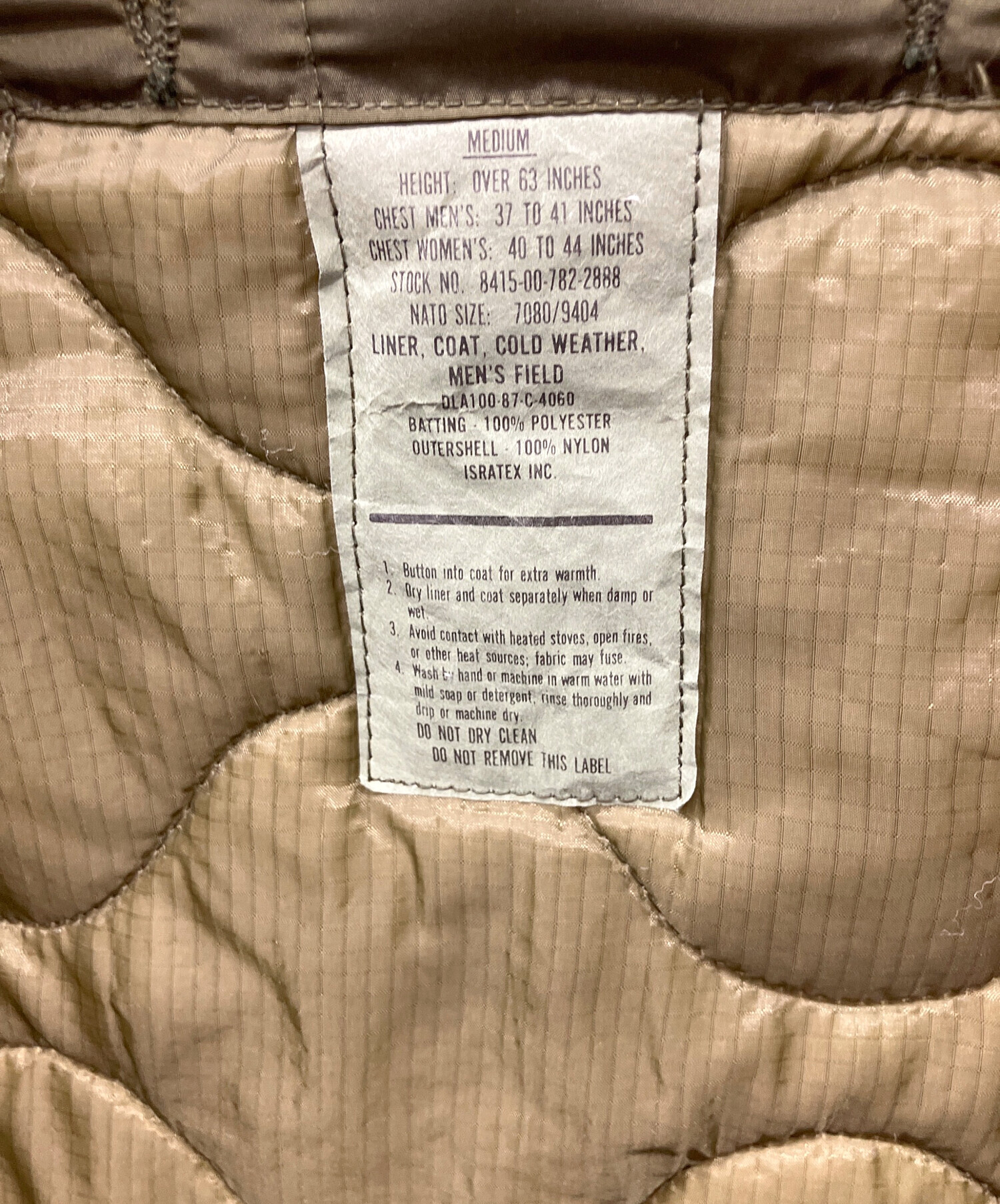 | スタッフコメント | 米軍実物の コールドウェザーコート用ライナー(中綿入りインナー)で、主に M-65 フィールドジャケット 等の保温補強用として使用されるアイテムです。NSN(ナショナル・ストック・ナンバー)付きの正規供給品で、サプライチェーン管理番号 8415-00-782-2888 として軍需品リストに登録されています。 |
