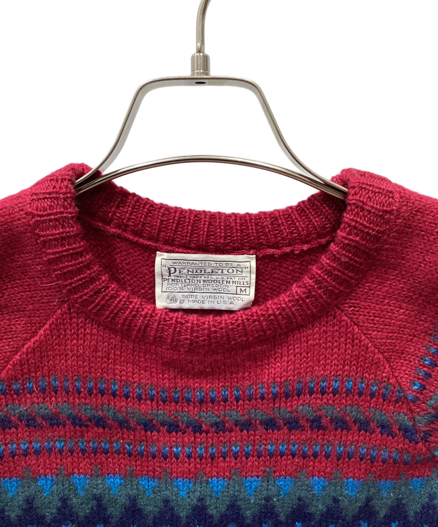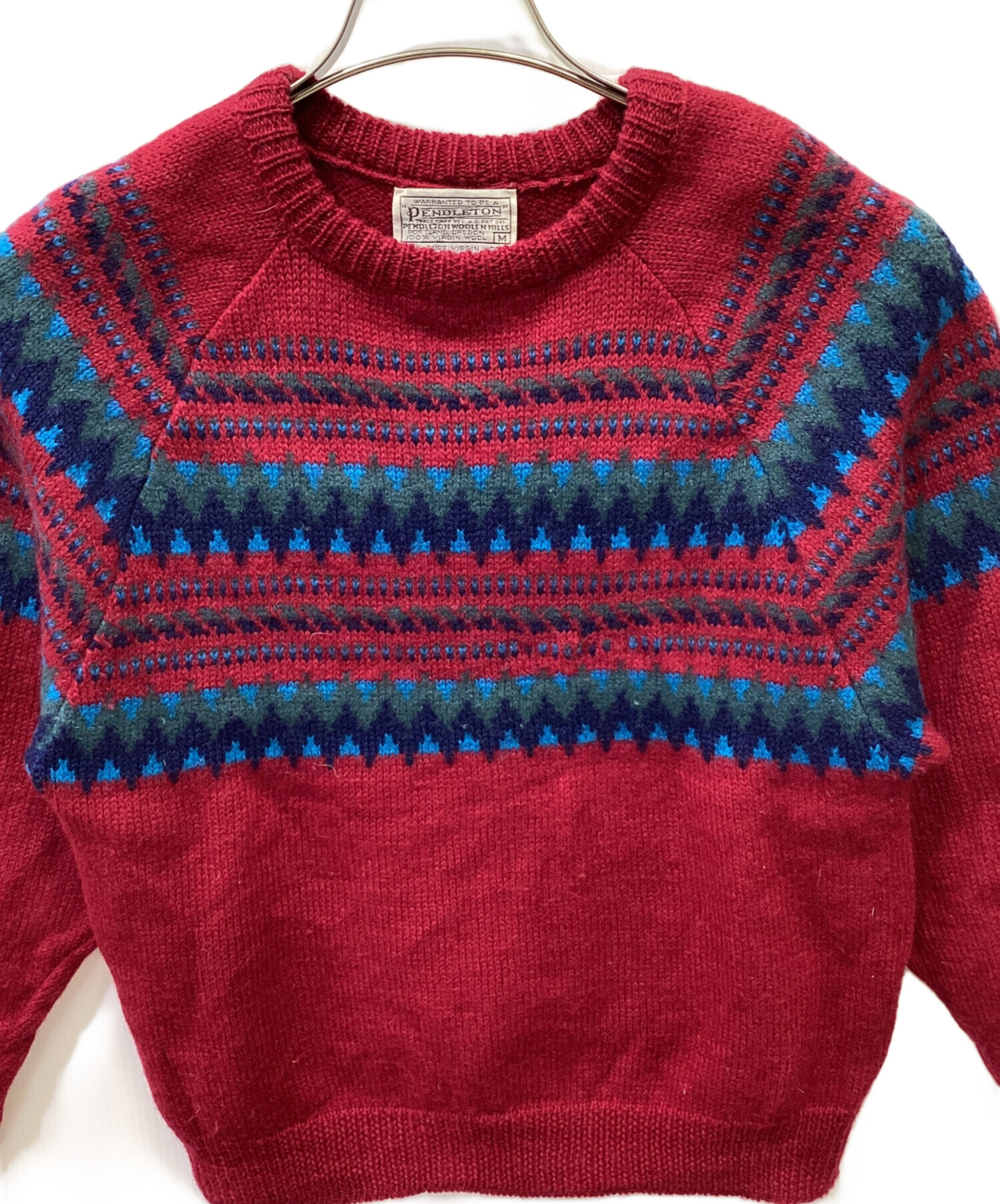 | スタッフコメント | PENDLETONの70’s ノルディックウールセーターです。 バージンウールを使用しているので柔らかく肌触りもいいセーターで くすんだレッドにノルディック柄が目を惹く1着です。 |