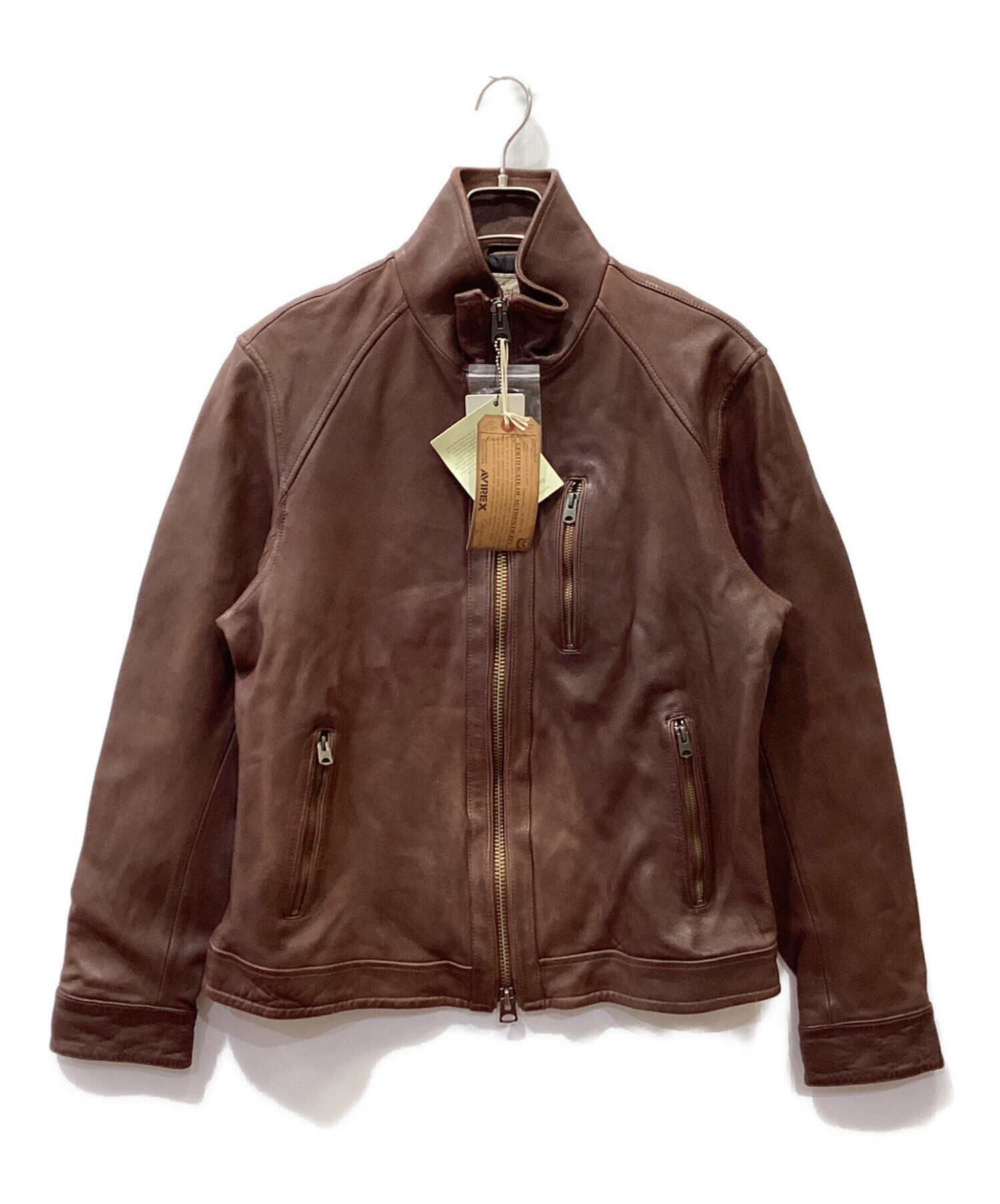 | スタッフコメント | AVIREXのシングルライダースジャケットです。 羊革なので柔らかくサラッとした肌触りで、伸縮性もあるので着心地の良いライダースです。ブラウンカラーがアメカジな印象でデニムに合わせるだけで、かっこよく着こなしていただけます。 |