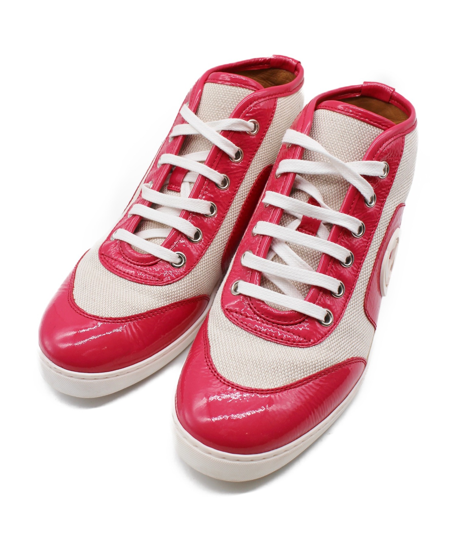 【スタッフコメント】エナメルとキャンバス素材のコンビスニーカーです。サイドにあしらわれたインターロッキングGマークがポイントの一足です。