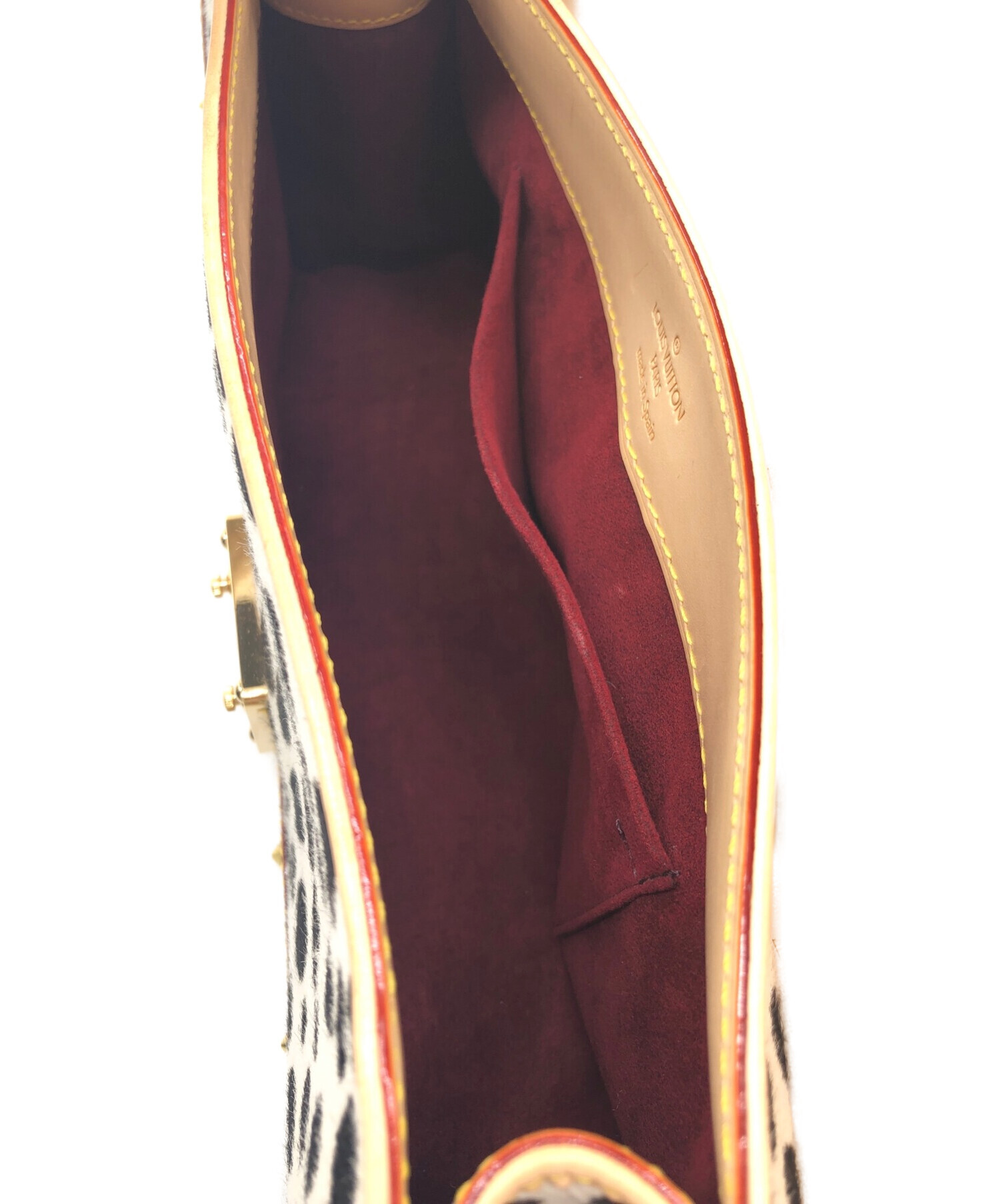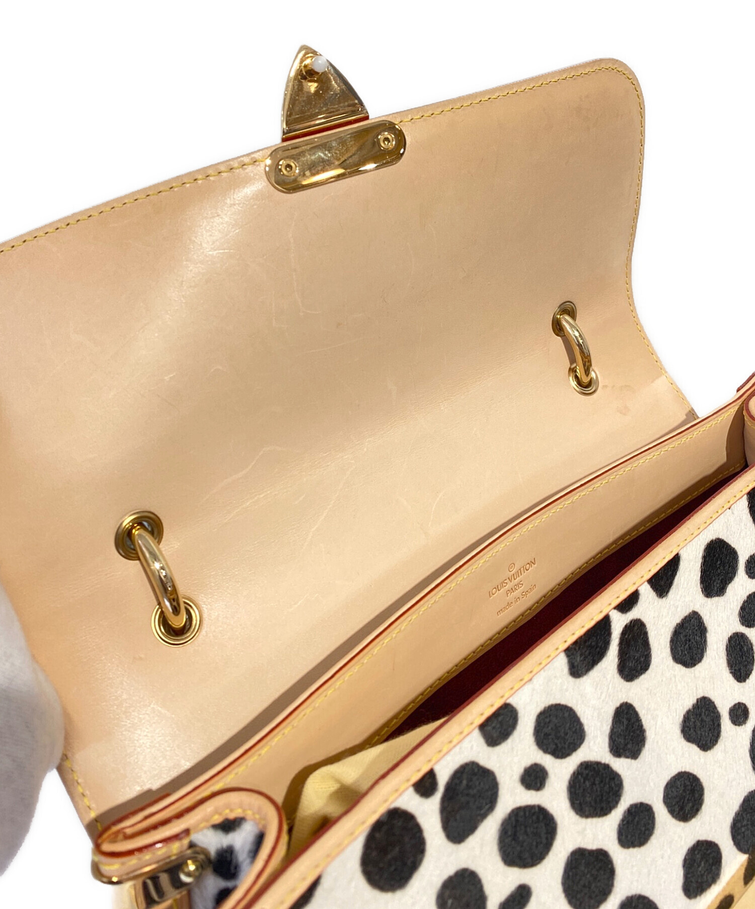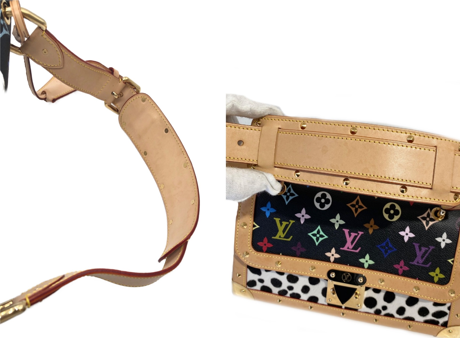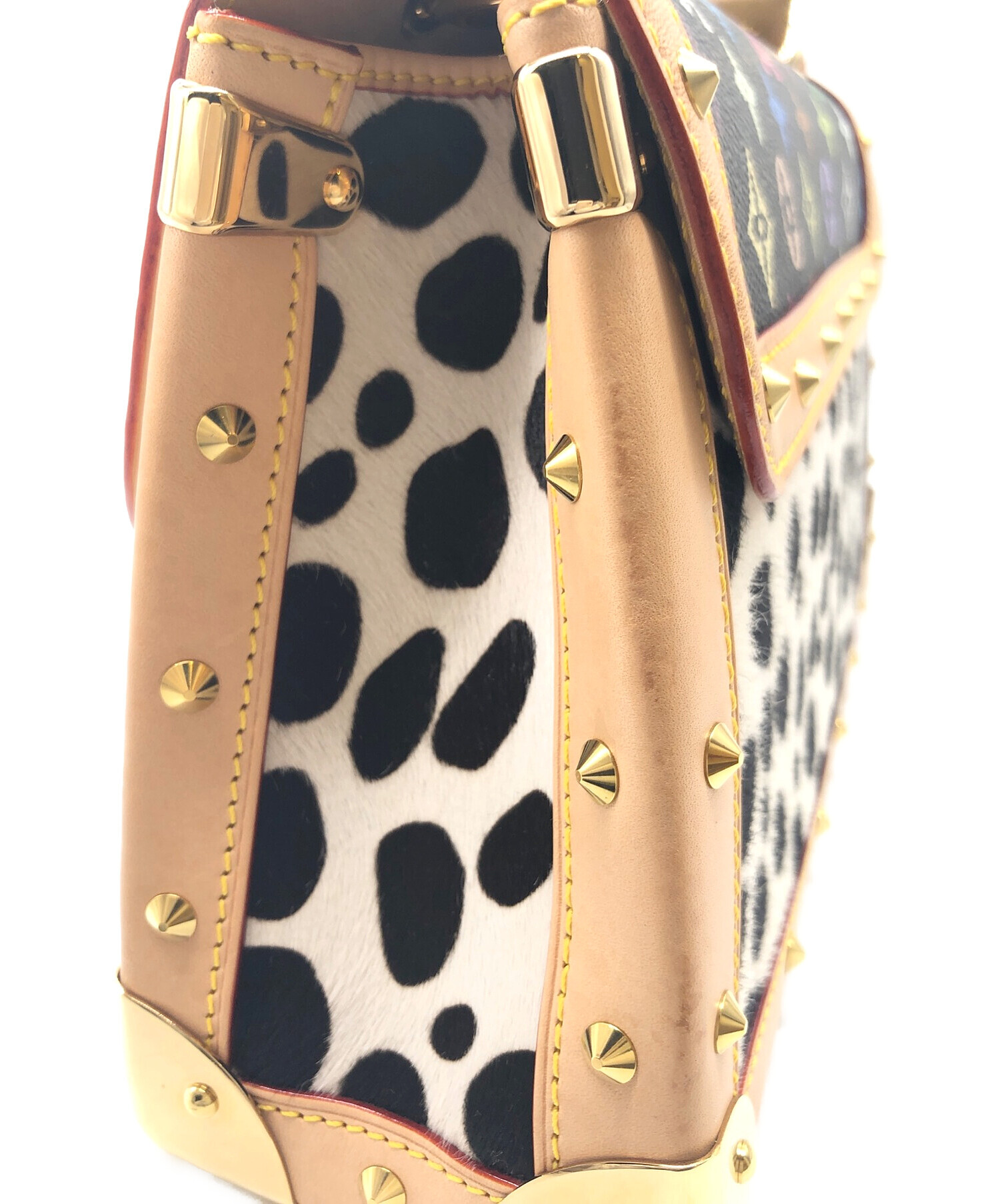 | スタッフコメント | カラフルなカラーリングのモノグラムキャンバスにダルメシアン柄のハラコの組み合わせが個性的なショルダーバッグです。角の金具やピラミッドスタッズのコンビにより高級感のある仕上がりとなっております。 |