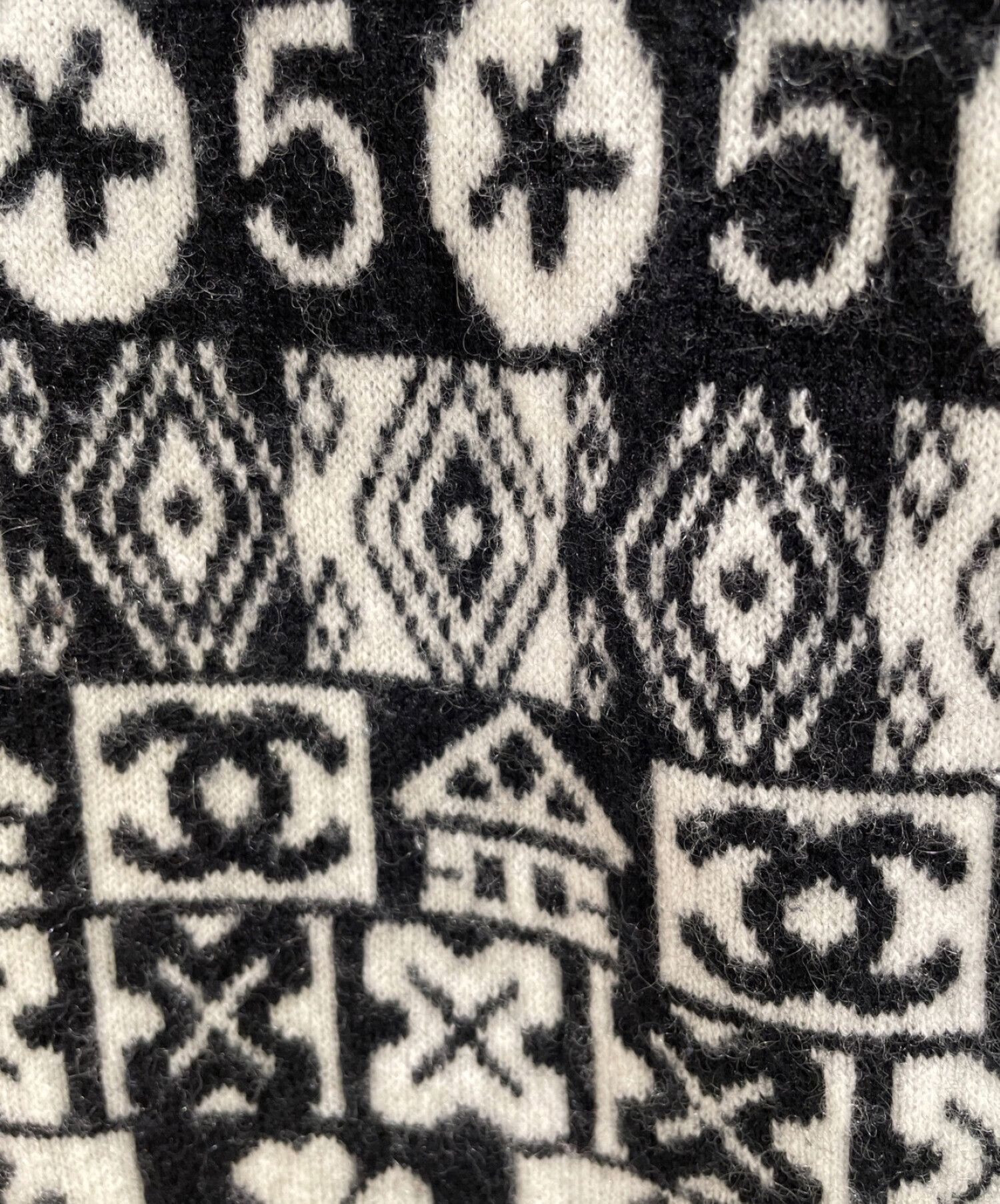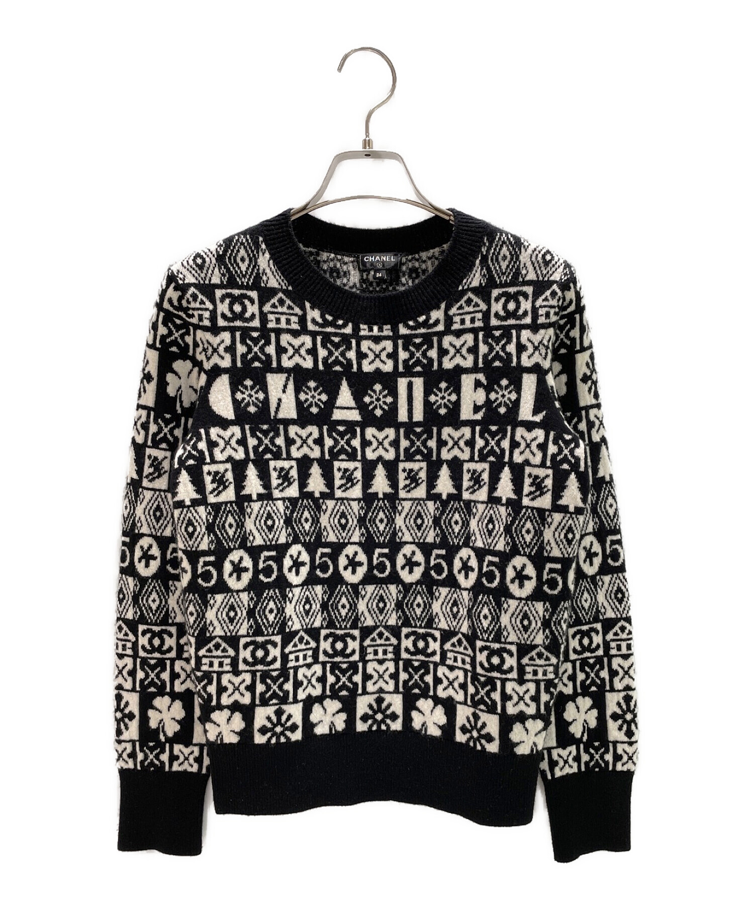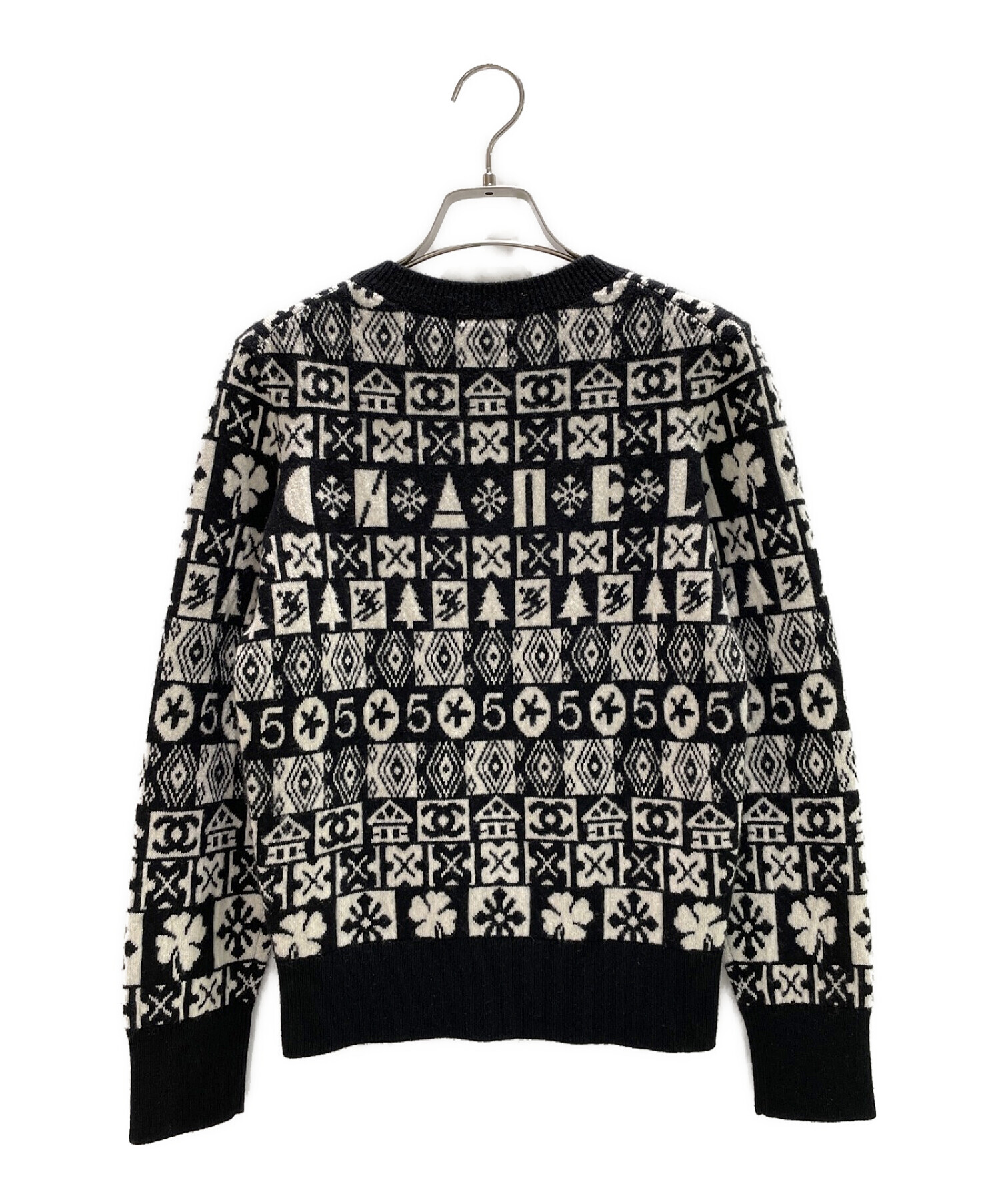 | スタッフコメント | ホワイト×ブラックのカラーコンビと、ココマークをはじめとするシャネルを象徴する柄が特徴的なクルーネックニットになります。全体的にキュートな印象に仕上がっています。カシミア100%素材で、着心地も上質です。タイトなシルエットで、一枚でも、インナーとしても活躍するアイテムです。 |