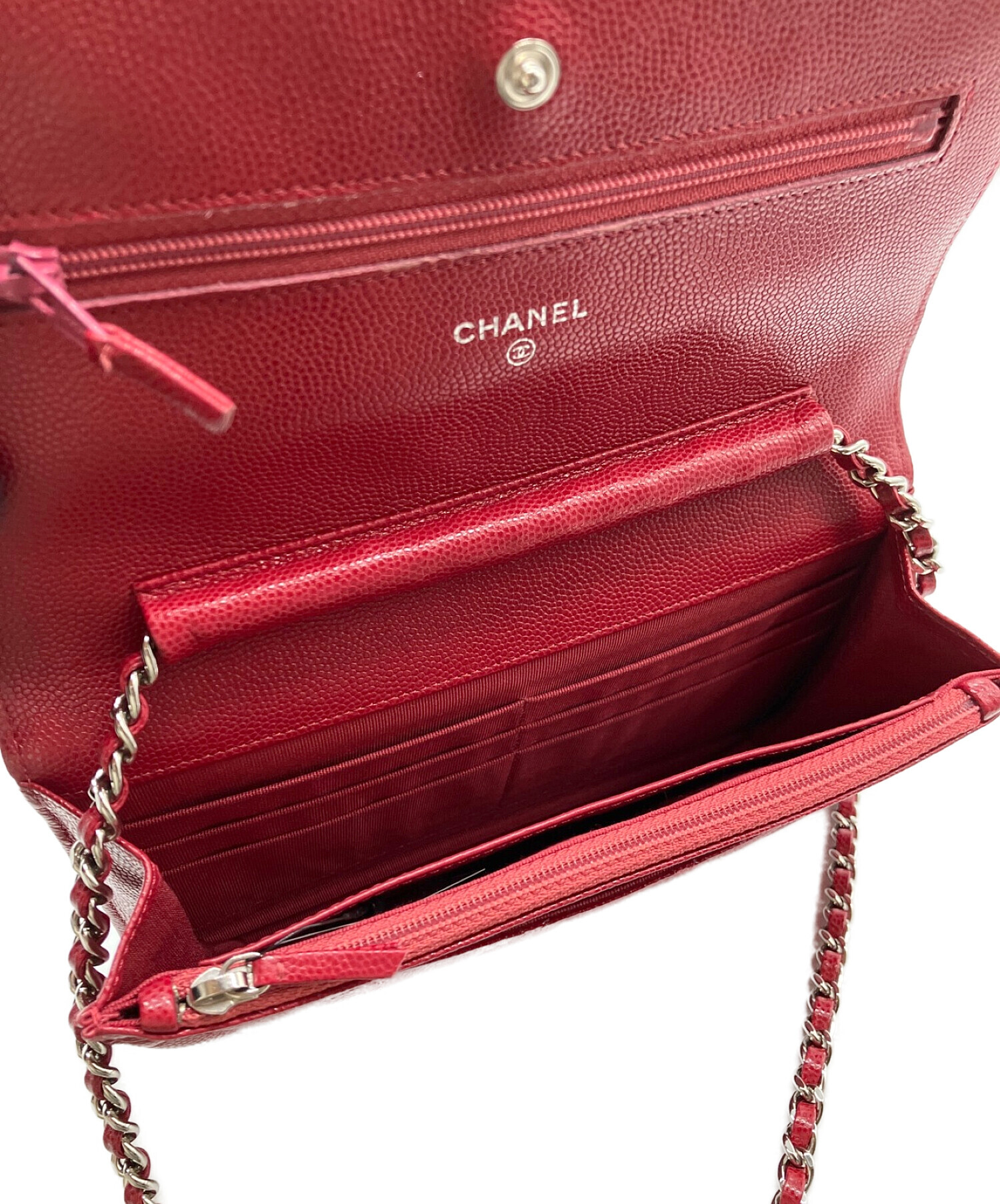 | スタッフコメント | CHANELのチェーンウォレットでございます。フロントのココマークと赤色のキャビアスキンが特徴です。メインのフリースペースが大きい作りとなっているため、紙幣など十分なゆとりをもって収納いただけます。 |