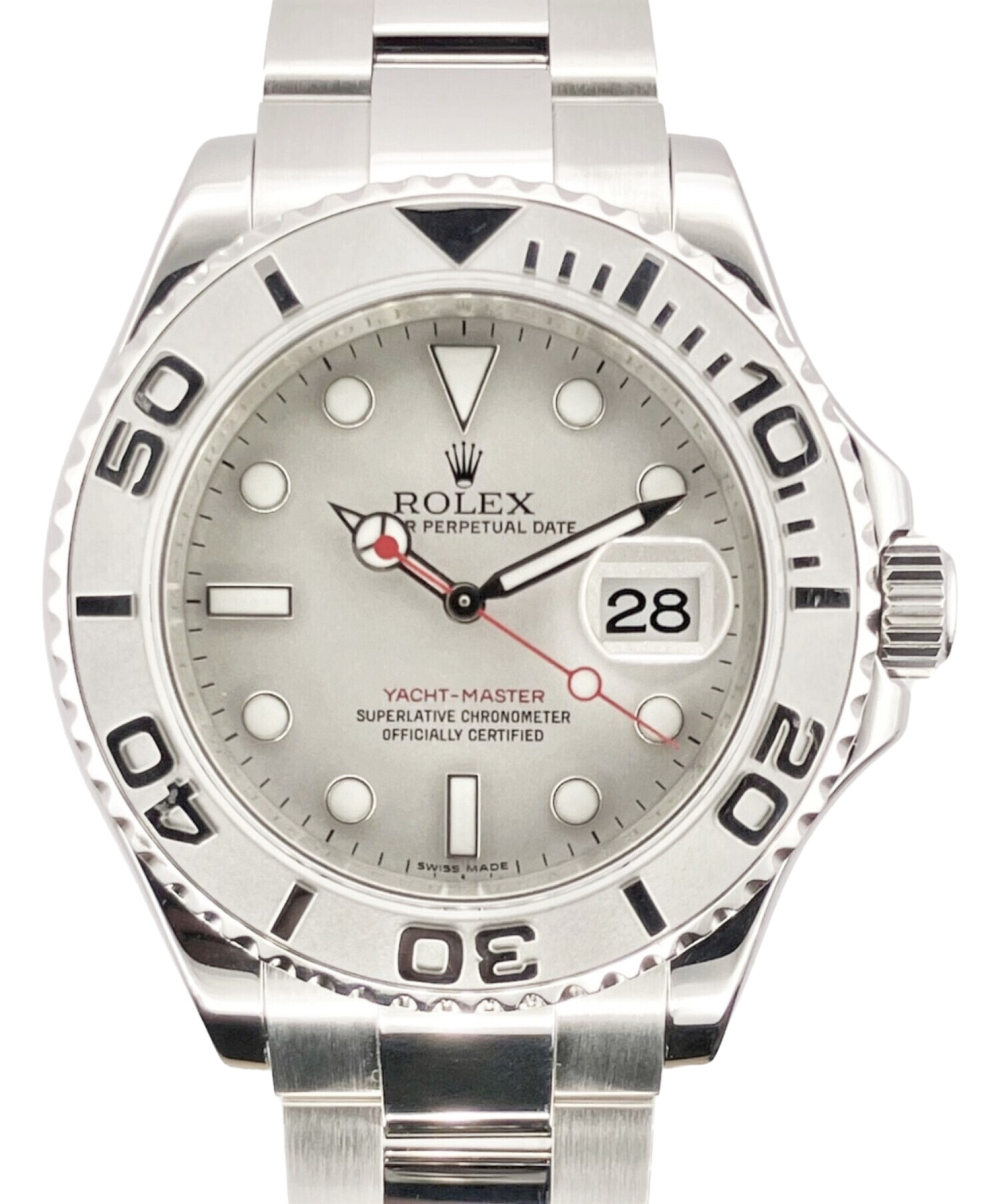| スタッフコメント | ロレックスのスポーツモデル、ヨットマスターのロレジウムでございます。ラインの中でも人気なこのモデルは、両方向回転ベゼルとグレーの文字盤にプラチナを使用しております。サンブラスト加工を施したベゼルは、少しザラザラとした質感が特徴的で、シルバーカラーの文字盤が落ち着いた雰囲気と高級感を演出しています。また現在は廃盤となっており、希少価値の高いアイテムといえます。 |
