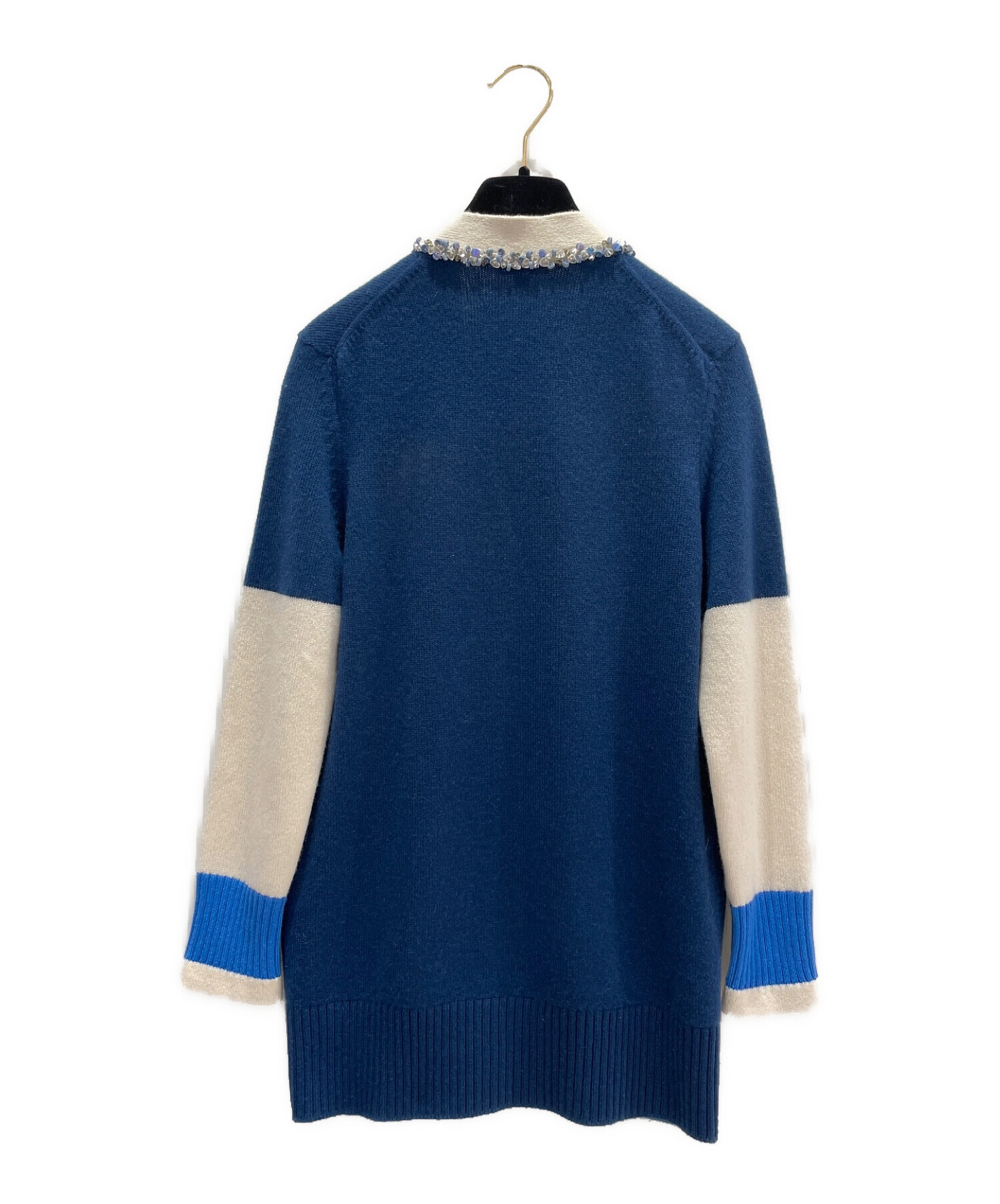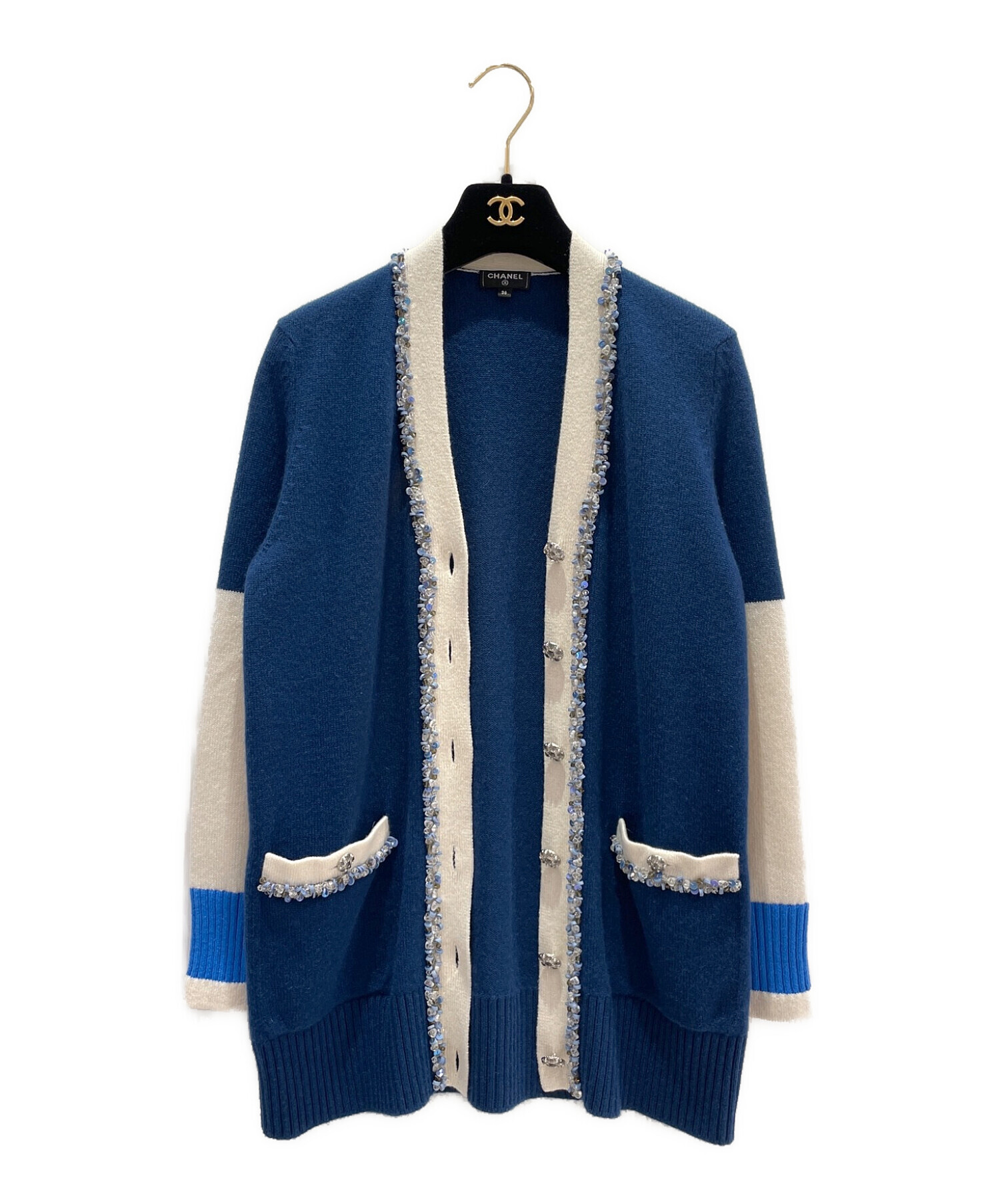 | スタッフコメント | パイピングに沿ってあしらわれたブルーのスパンコールとクリアビジューが印象的なCHANELのカシミヤロングカーディガンでございます。スクール風のベーシックなシルエットとビジューの華やかさのギャップが、カジュアルもモードもハイセンスにまとめてくれます。 |