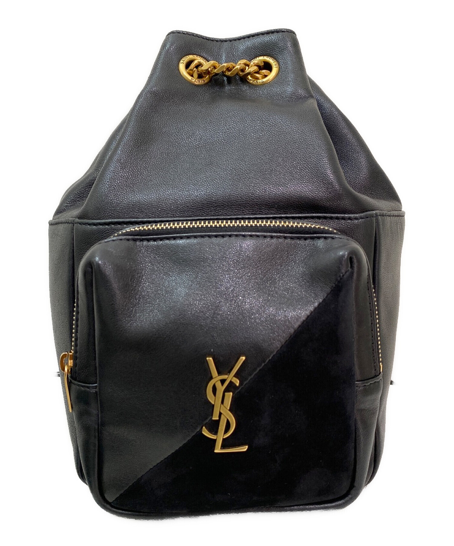 | スタッフコメント | 滑らかなレザーで作られた、Saint Laurent Parisのミニバックパックになります。フロントポケットはスウェードと切り替えが施され、YSLのメタルロゴがアイコニックな印象です。ゴールドチェーンと組み合わせたストラップは、ベルトで調節可能な仕様になっています。 |