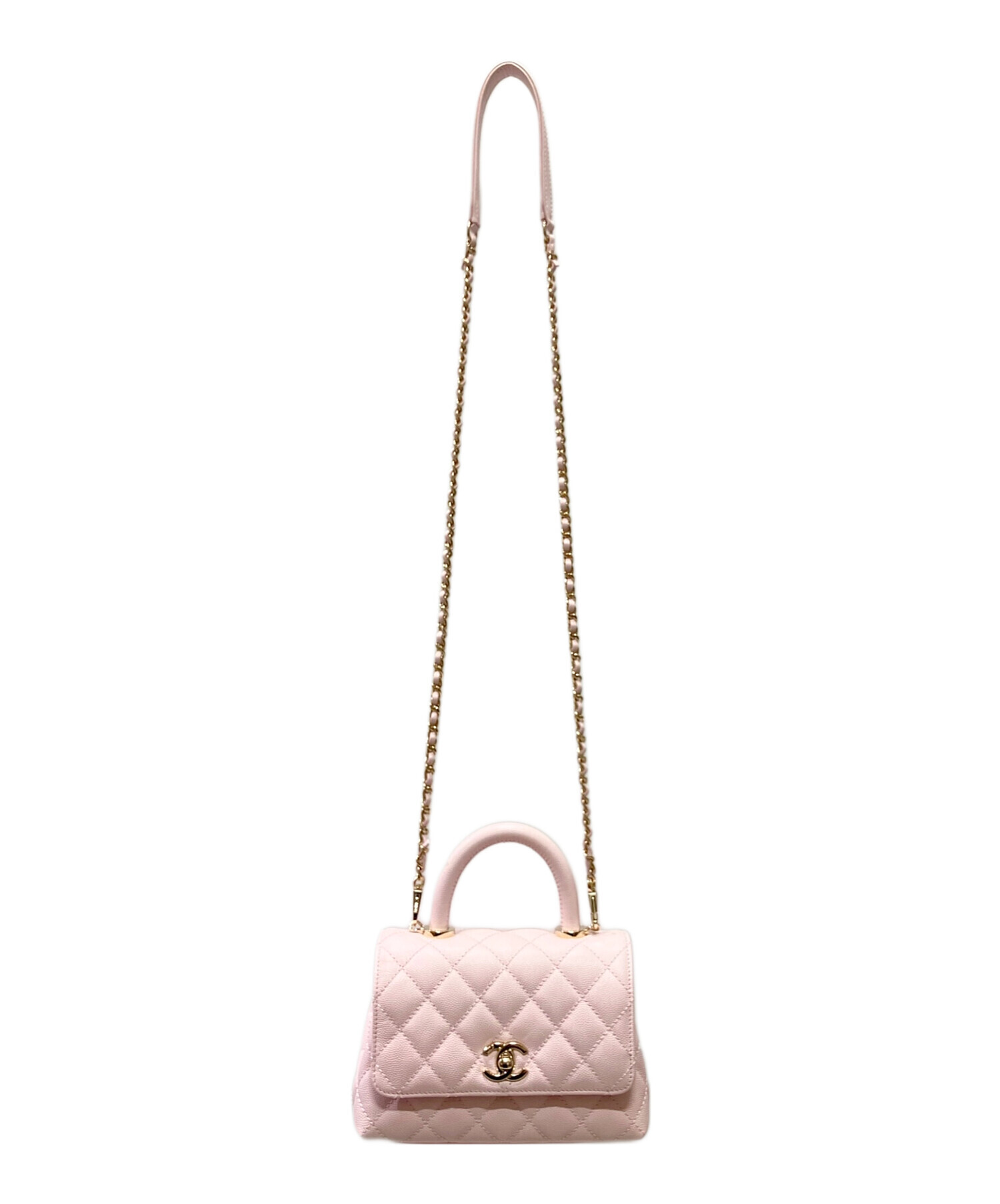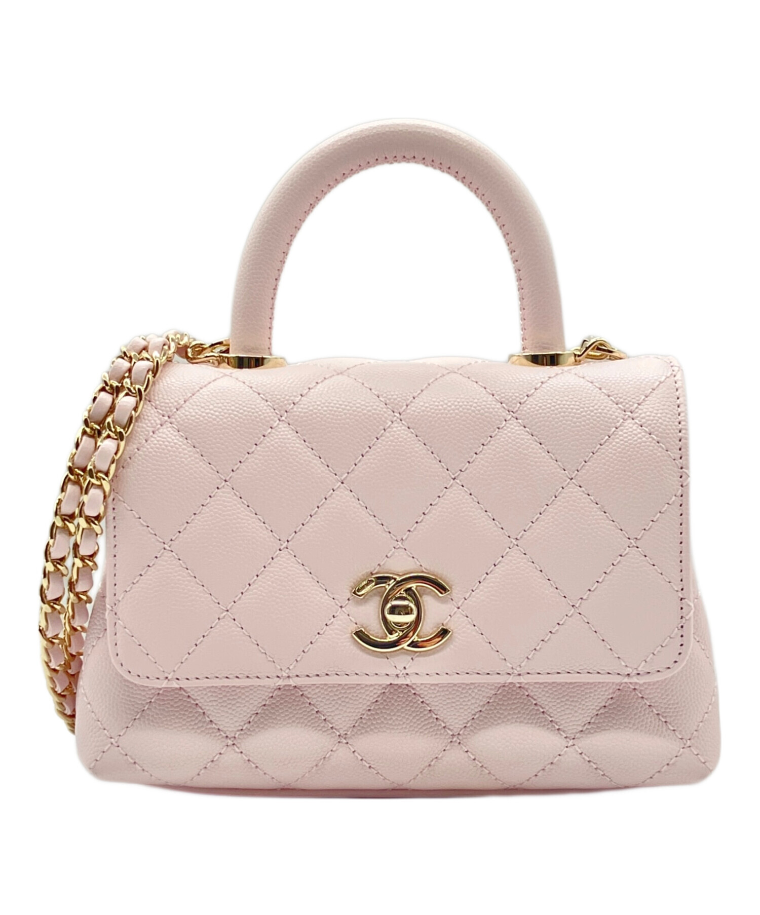| スタッフコメント | ミニマルなサイズ感で人気の、CHANELのココハンドルでございます。素材には定番人気のキャビアスキンを使用しており、耐久性と上品な光沢感が魅力です。また、柔らかで明るいピンクカラーはコーディネートに彩りを与え、華やかなスタイルに仕上げてくれます。2WAY仕様ですので、ハンドバッグとしてもショルダーバッグとしても万能にお使いいただけます。 |