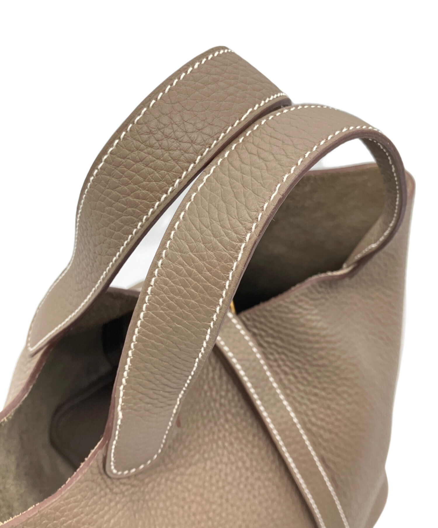 | スタッフコメント | 定番人気のハンドバッグであるピコタンロックでございます。サイズはPMとなっており、コンパクトながらにも財布やコスメ等の必需品を難なく収納可能な点が魅力的です。また、素材にはトリヨンクレマンスを使用している為、その特有のシボ感によりダメージが目立ちにくく耐久性に優れております。落ち着きのあるエトゥープカラーで様々なシーンで活躍するオススメのアイテムです。 |