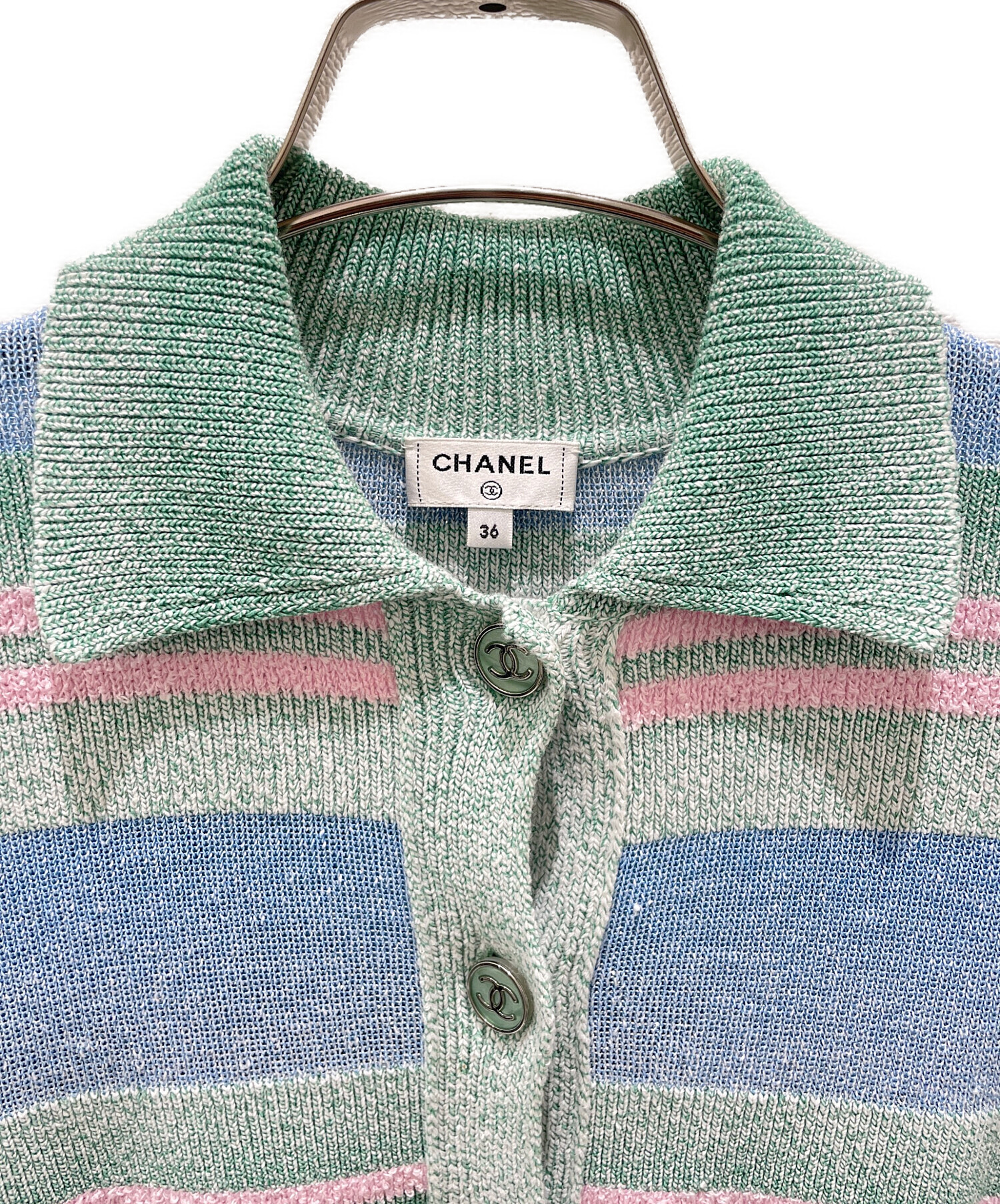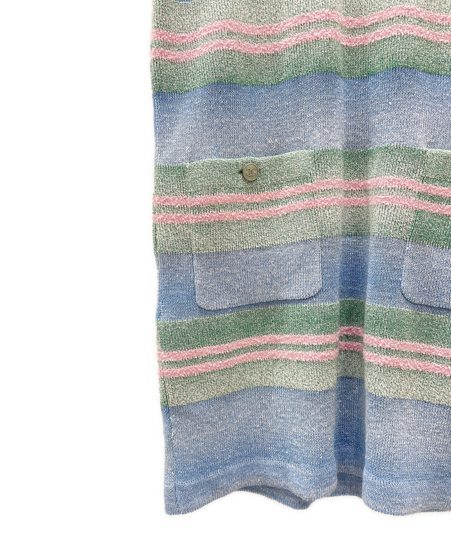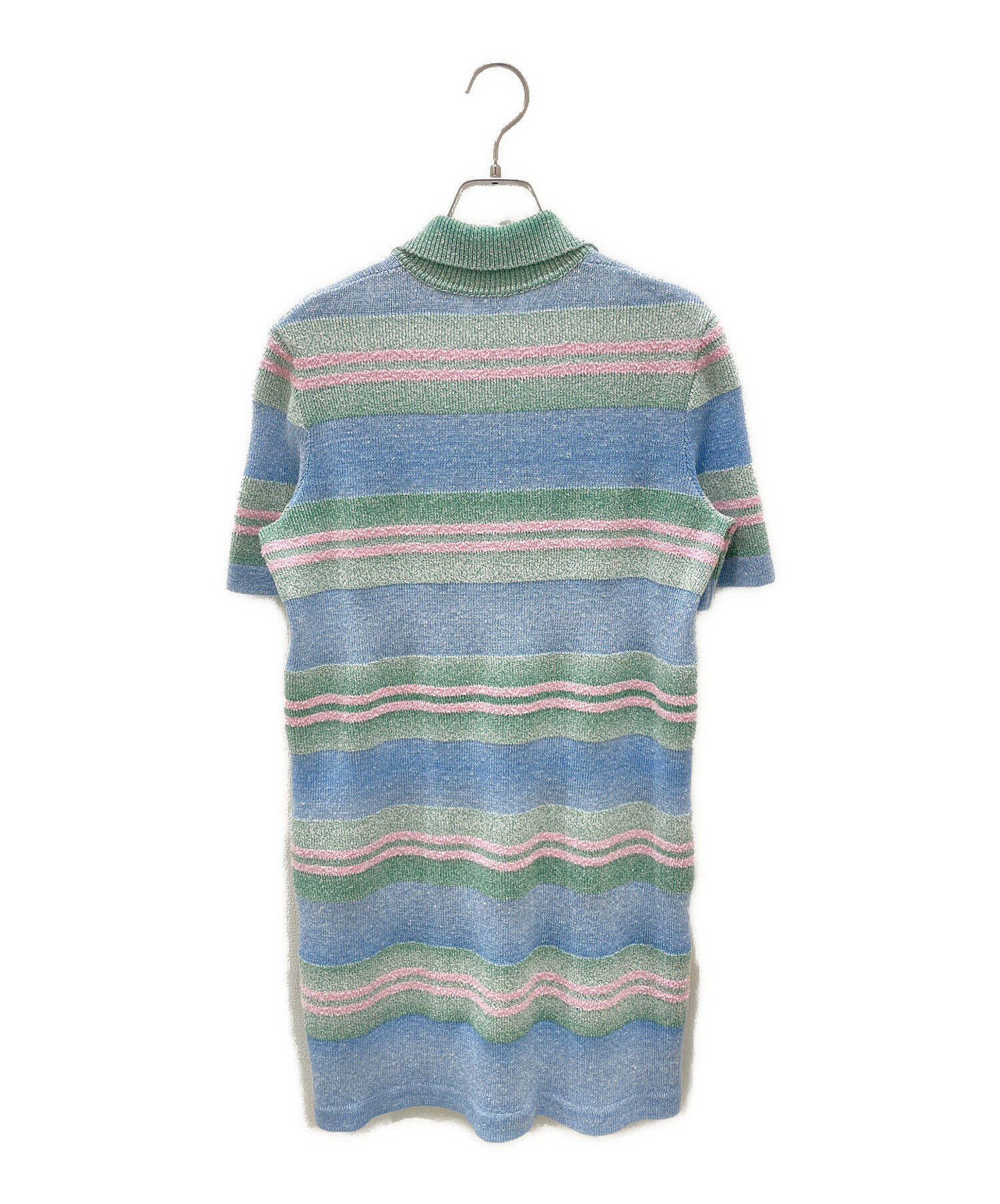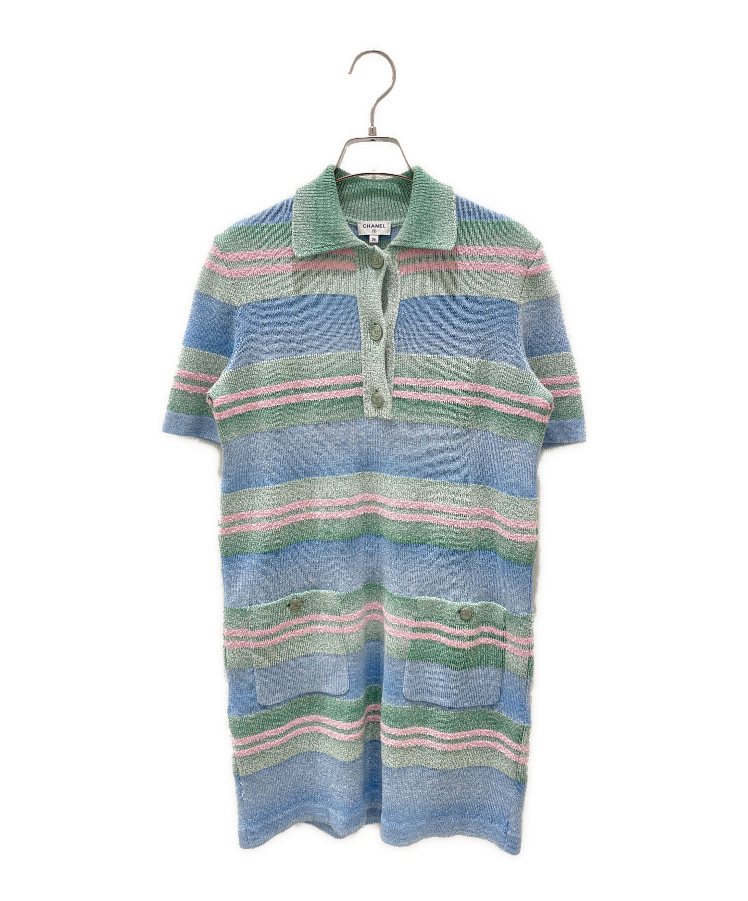 スタッフコメント こちらはCHANELのボーダーニットポロワンピースでございます。生地全体が光を反射しキラキラとかがやいてくれるため、コーデの主役となってくれます。