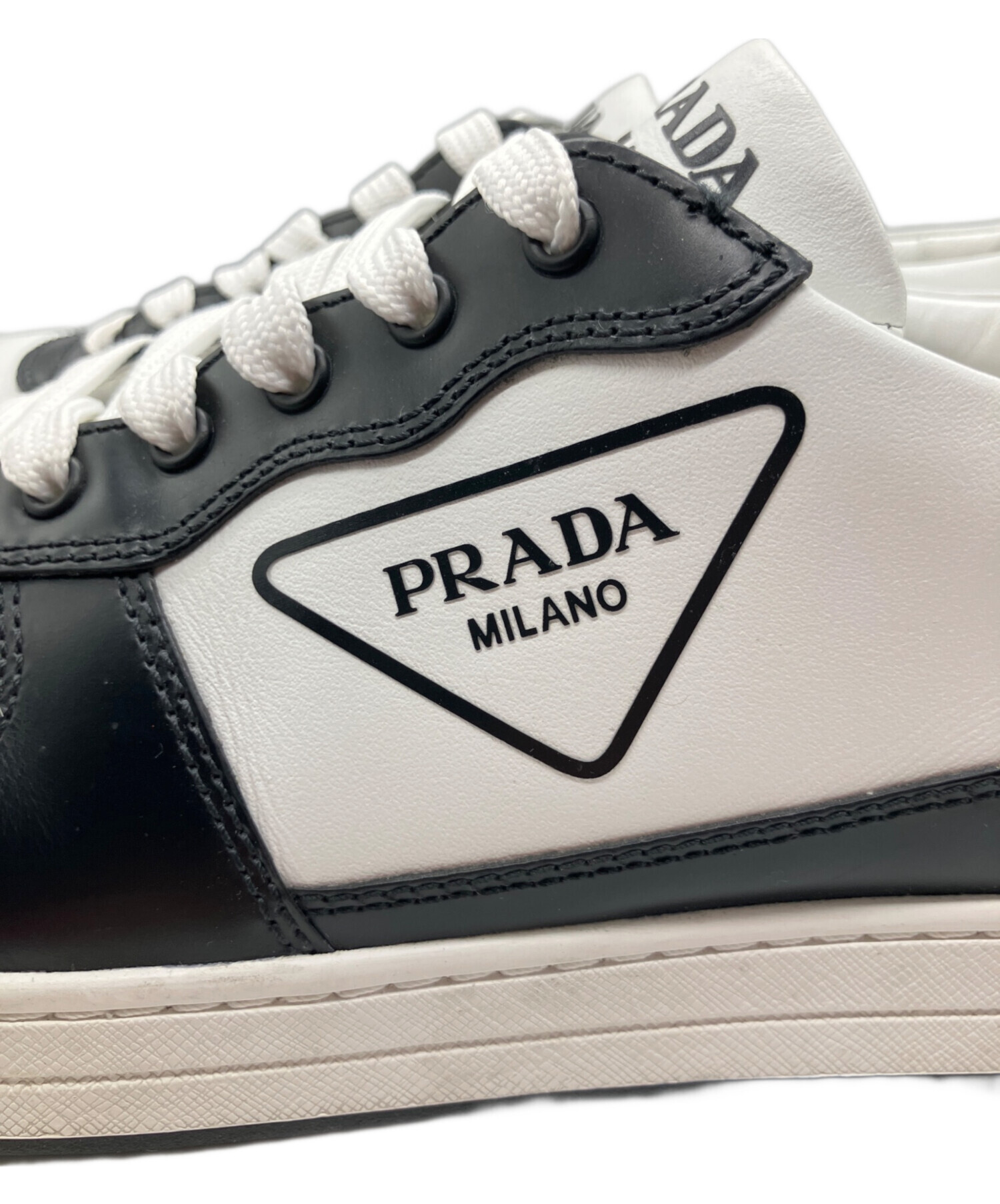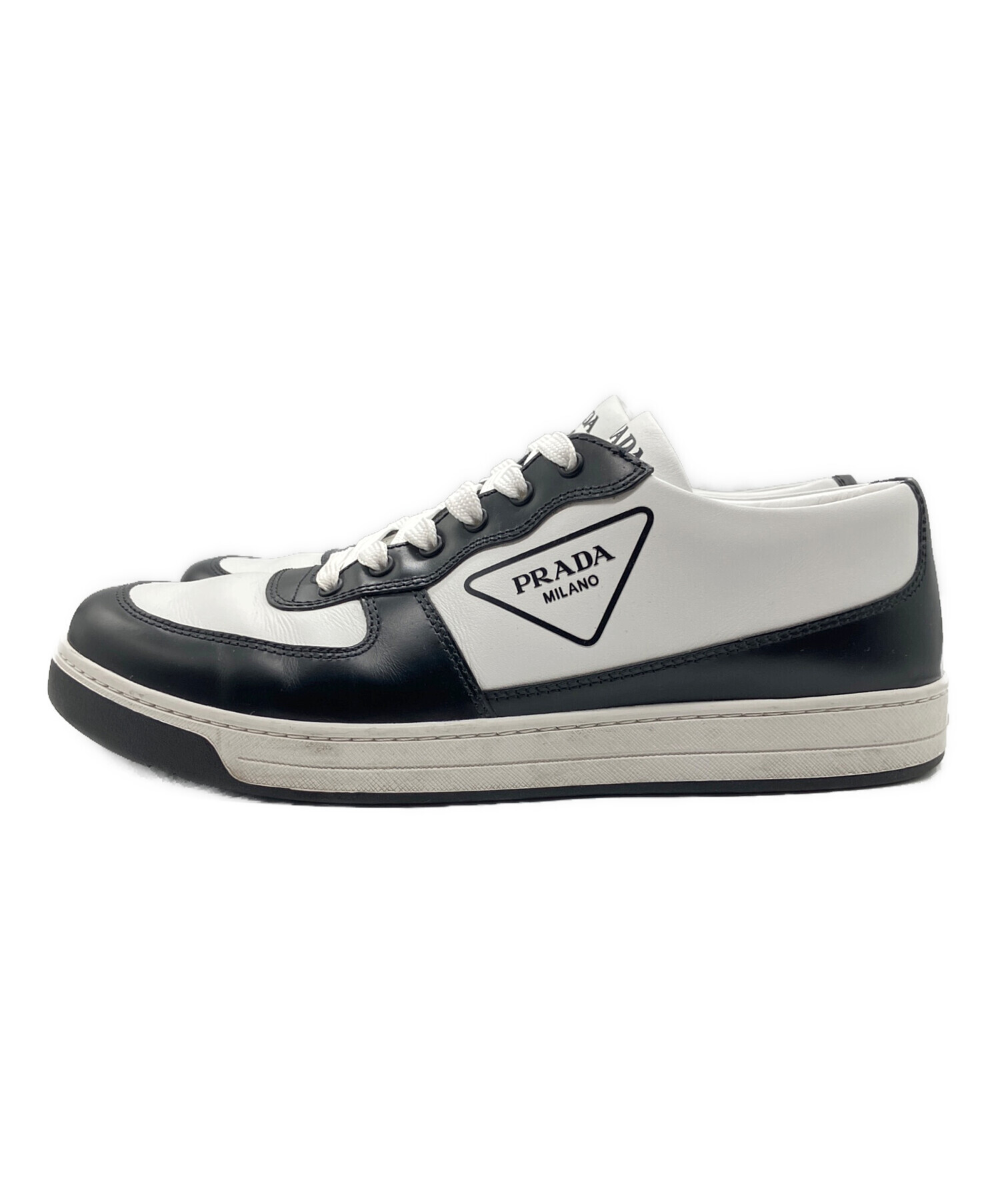 • PRADA(プラダ)PRADA (プラダ) トライアングルロゴスニーカー/ローカットスニーカー ホワイト×ブラック サイズ:7 1/2の古着・服飾アイテム ソールに汚れ有