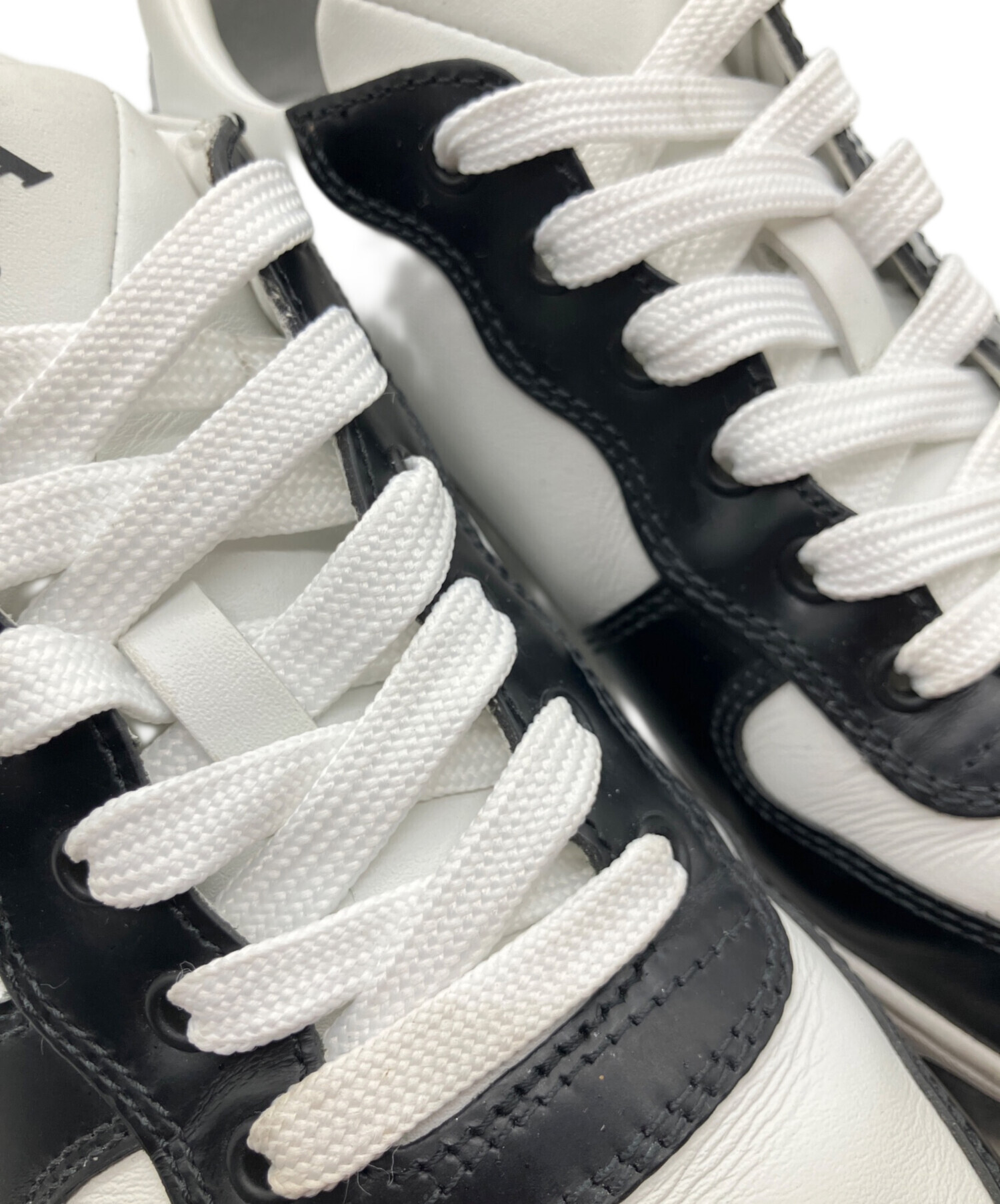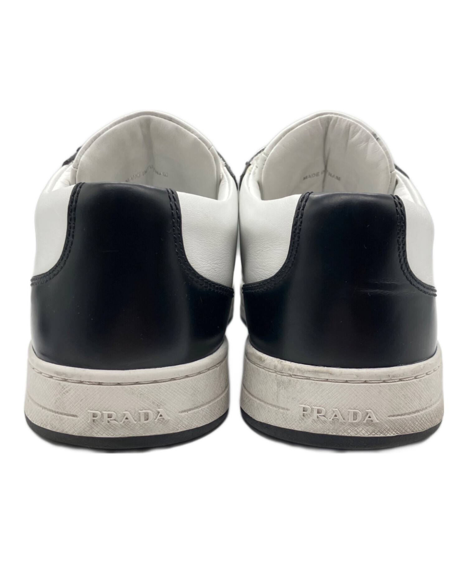 • PRADA(プラダ)PRADA (プラダ) トライアングルロゴスニーカー/ローカットスニーカー ホワイト×ブラック サイズ:7 1/2の古着・服飾アイテム 右足タン部分に汚れ有