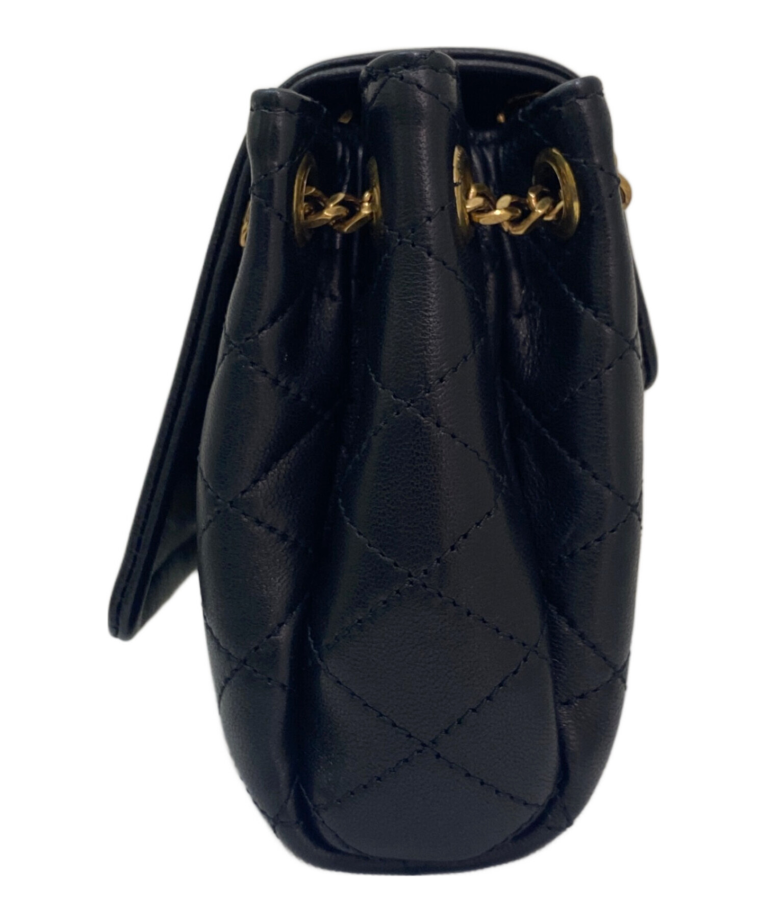スタッフコメント 柔らかなブラックのラムスキンにダイヤ状のステッチが施された華やかなマテリアルにゴールド金具がマッチし、コンパクトながら存在感を放ちます。ストラップを調整することでスタイルを変えてお持ちいただけます。