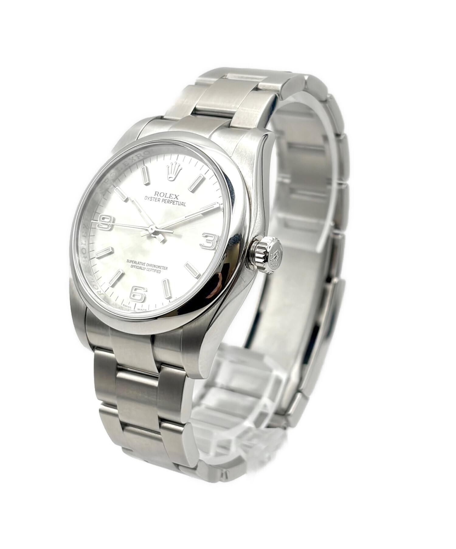 | スタッフコメント | ROLEXのオイスターパーペチュアルでございます。シルバー文字盤が光を柔らかく反射し、清潔感と上品さを兼ね備えた佇まいが魅力でございます。視認性に優れた洗練されたフェイスと堅牢なケース構造により、日常使いにも安心感のある一本でございます。 |