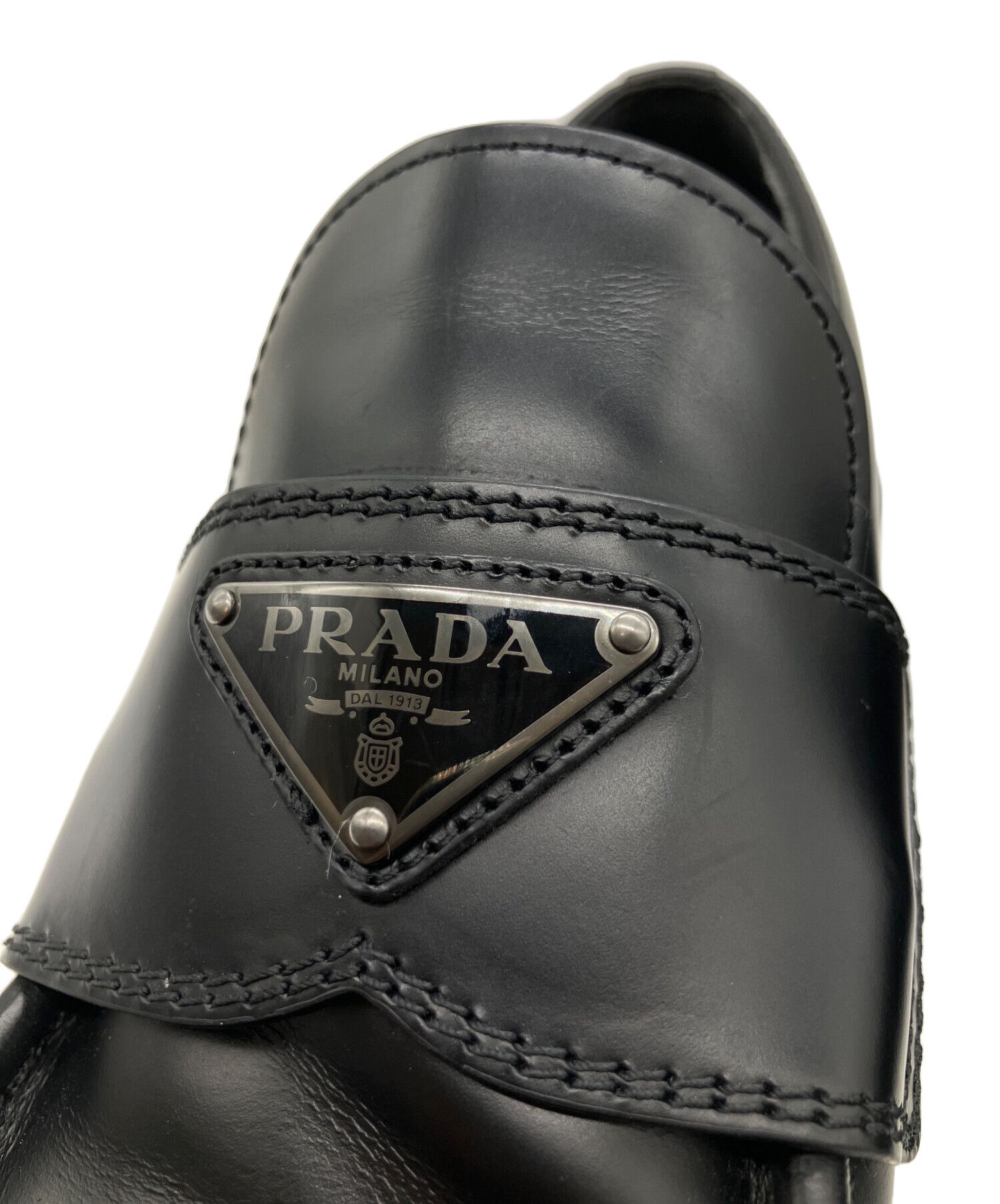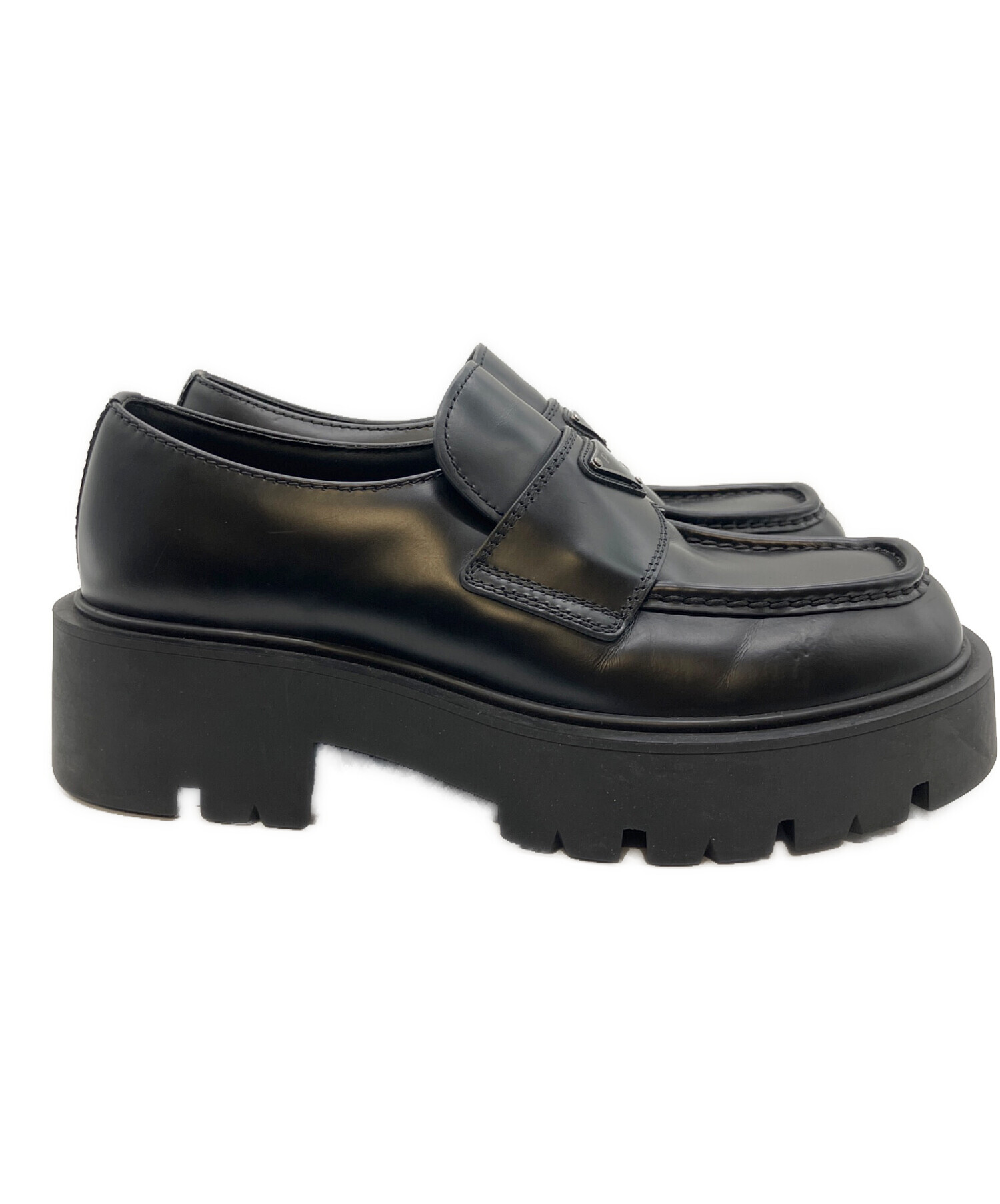 • PRADA(プラダ)PRADA (プラダ) モノリスブラッシュドレザーローファー ブラック サイズ:7〜8の古着・服飾アイテム 右足三角プレートプレート若干の汚れ有