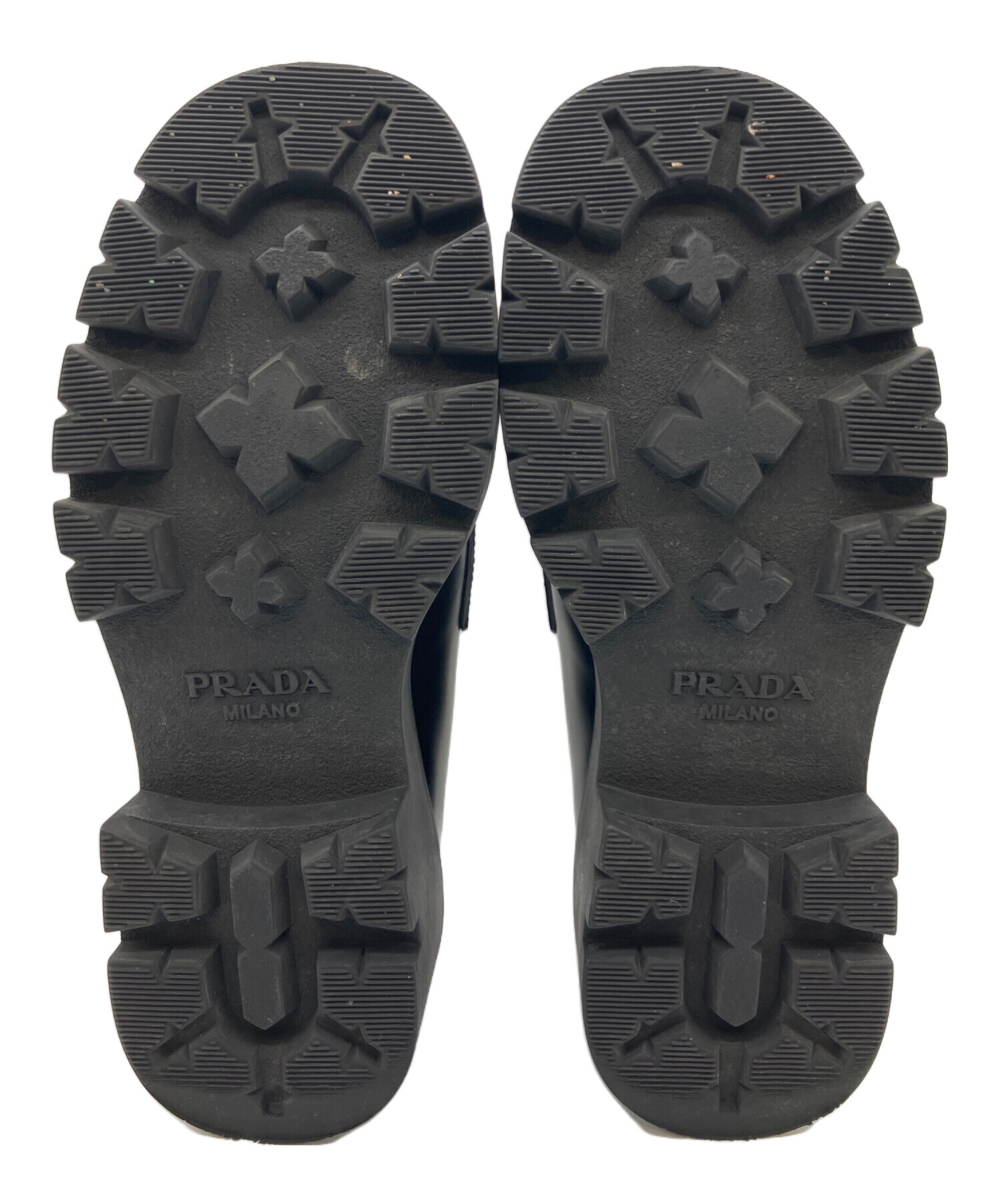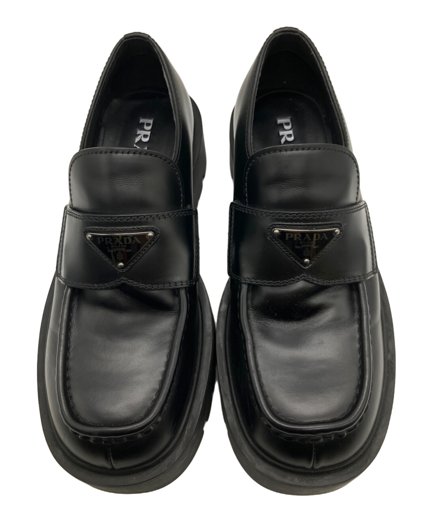 • PRADA(プラダ)PRADA (プラダ) モノリスブラッシュドレザーローファー ブラック サイズ:7〜8の古着・服飾アイテム ソール汚れ有