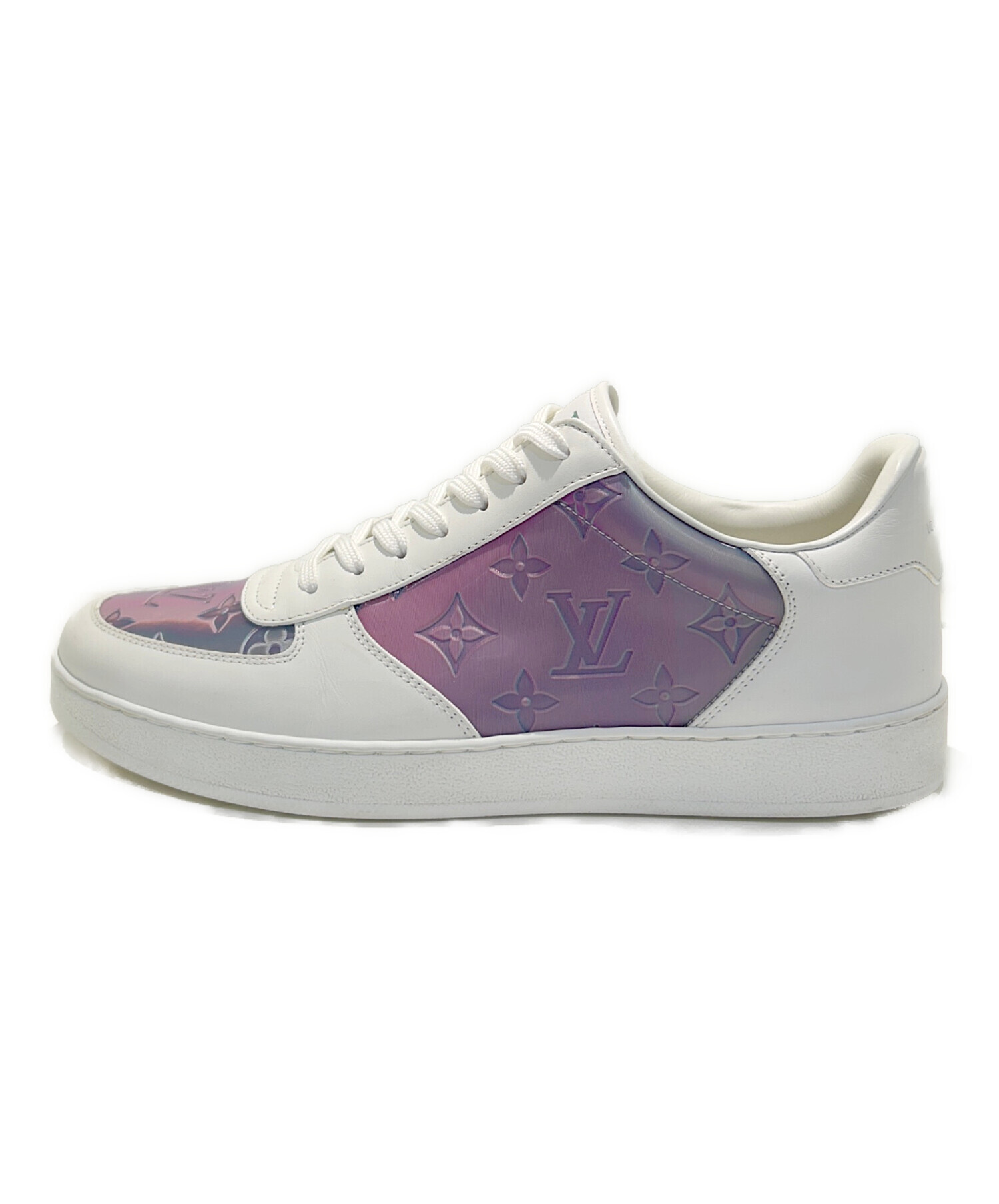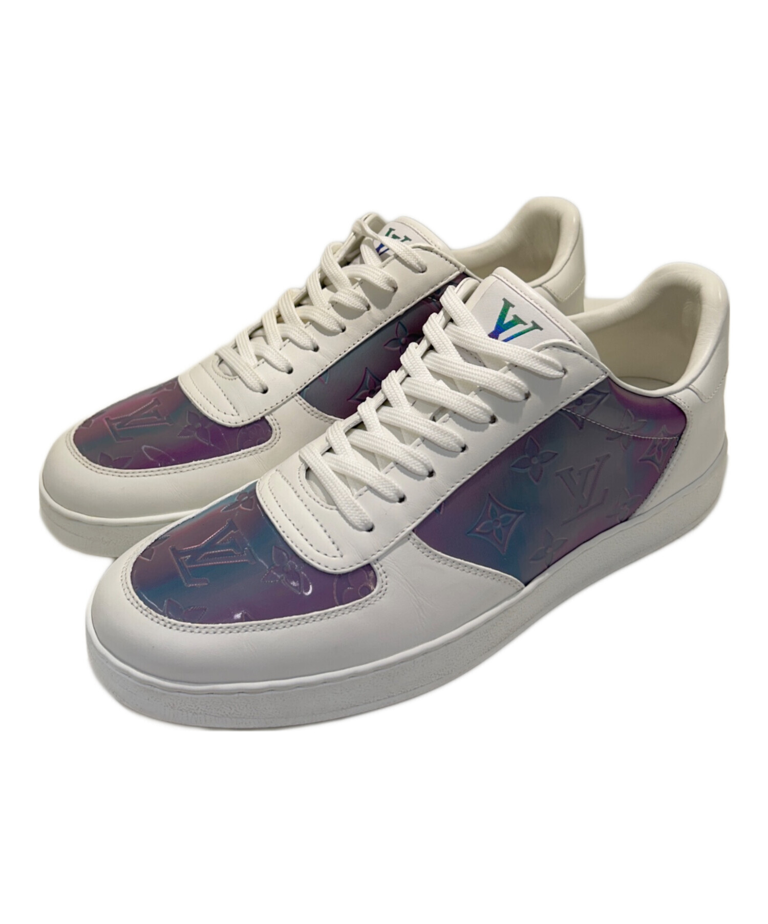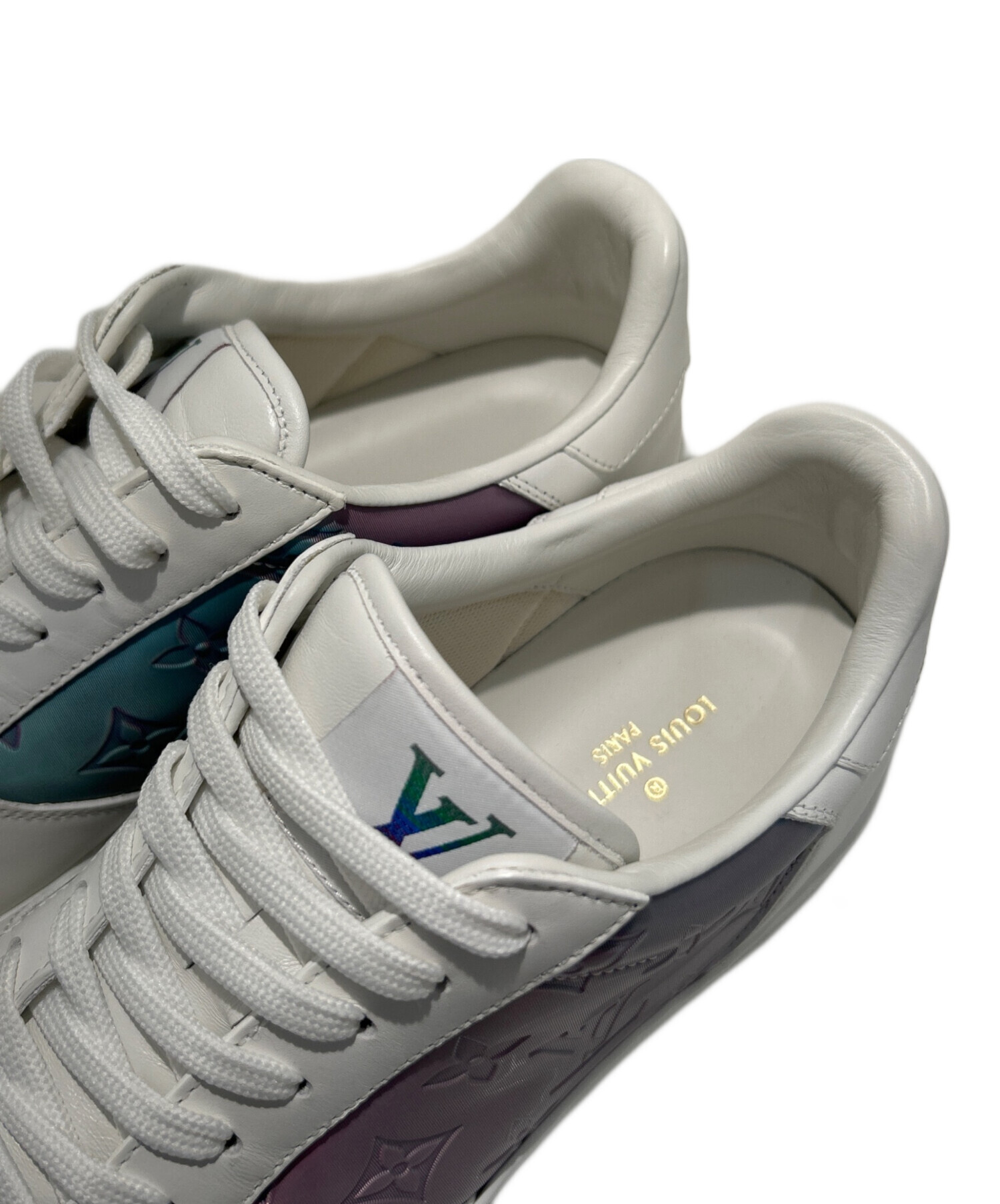 | スタッフコメント | アッパーには、光沢のあるパープル〜ブルー系グラデーションカラーのモノグラムパターンが施されており、サイドとトゥ部分で存在感を放ちます。ベースはホワイトレザーで、都会的で洗練された印象を与えるデザイン。 |