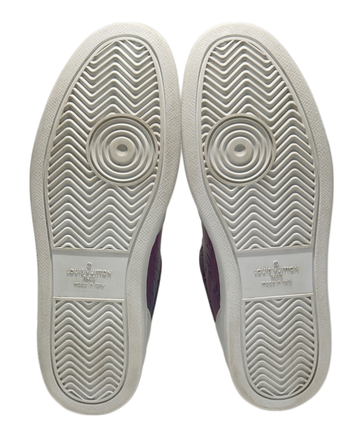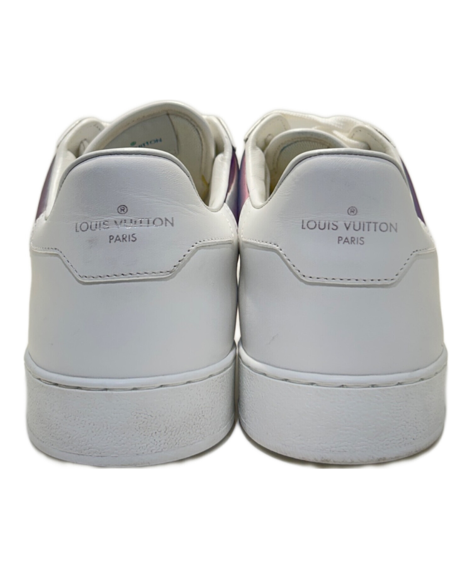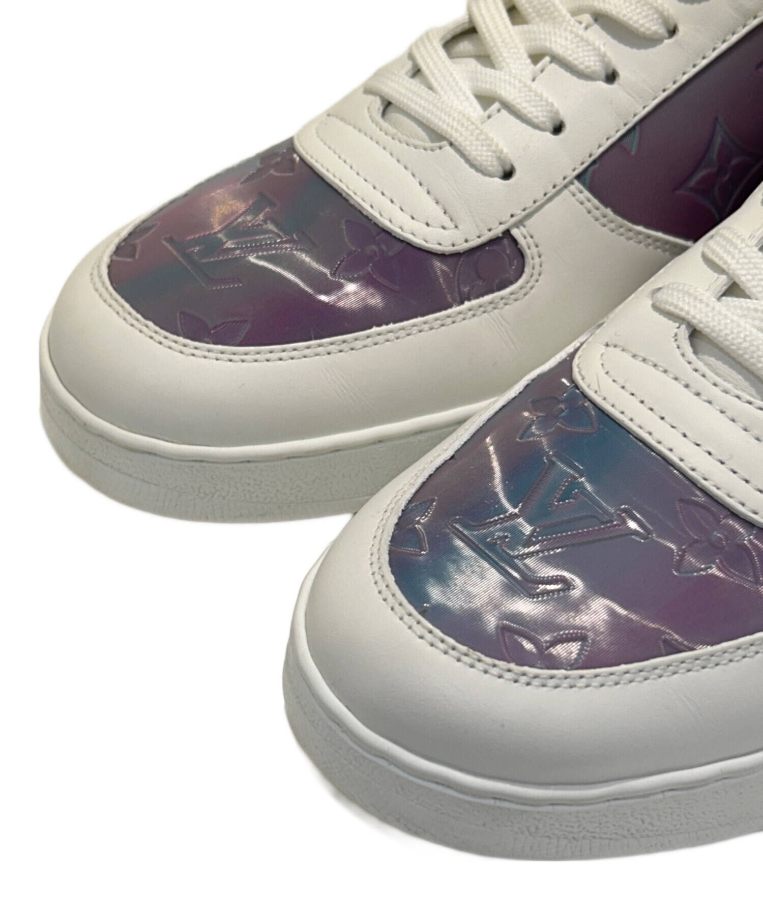 | スタッフコメント | アッパーには、光沢のあるパープル〜ブルー系グラデーションカラーのモノグラムパターンが施されており、サイドとトゥ部分で存在感を放ちます。ベースはホワイトレザーで、都会的で洗練された印象を与えるデザイン。 |
