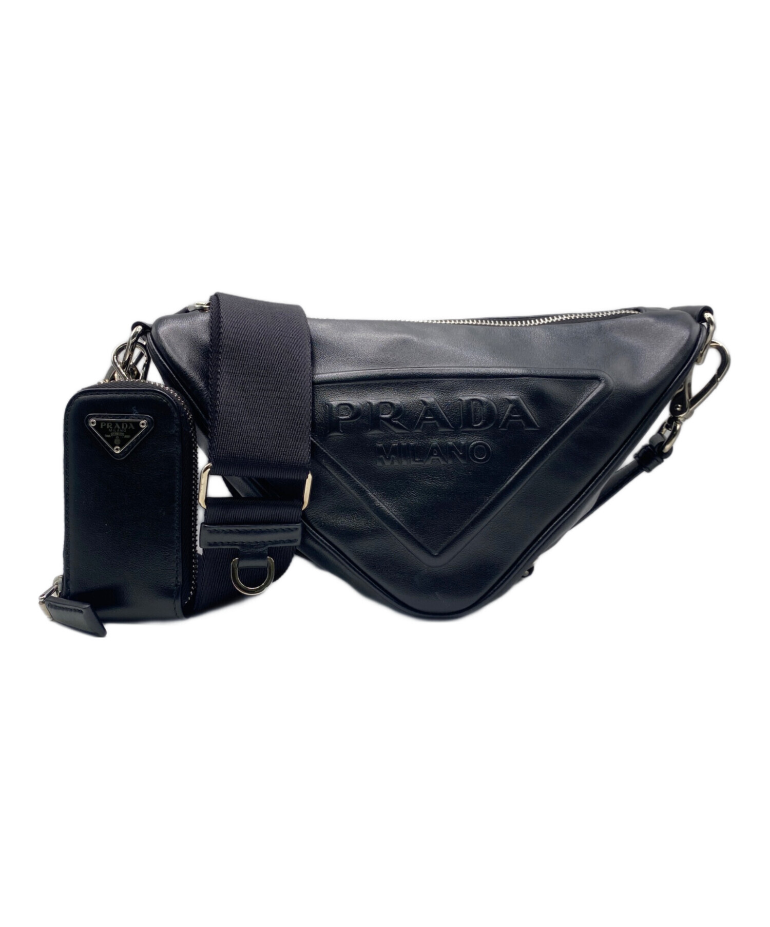 | スタッフコメント | プラダの伝統を感じさせるアイコニックなトライアングルのフォルムが特徴のショルダーバッグでございます。クラシックなブラックレザーをベースに、フロントにはエンボスロゴが煌めき、ミニマルながらも存在感のある一品です。調節・取り外し可能なショルダーストラップにより、スタイルに応じて持ち方を変えられ、モードにもラグジュアリーにも、映える使い勝手の良いアイテムです。 |