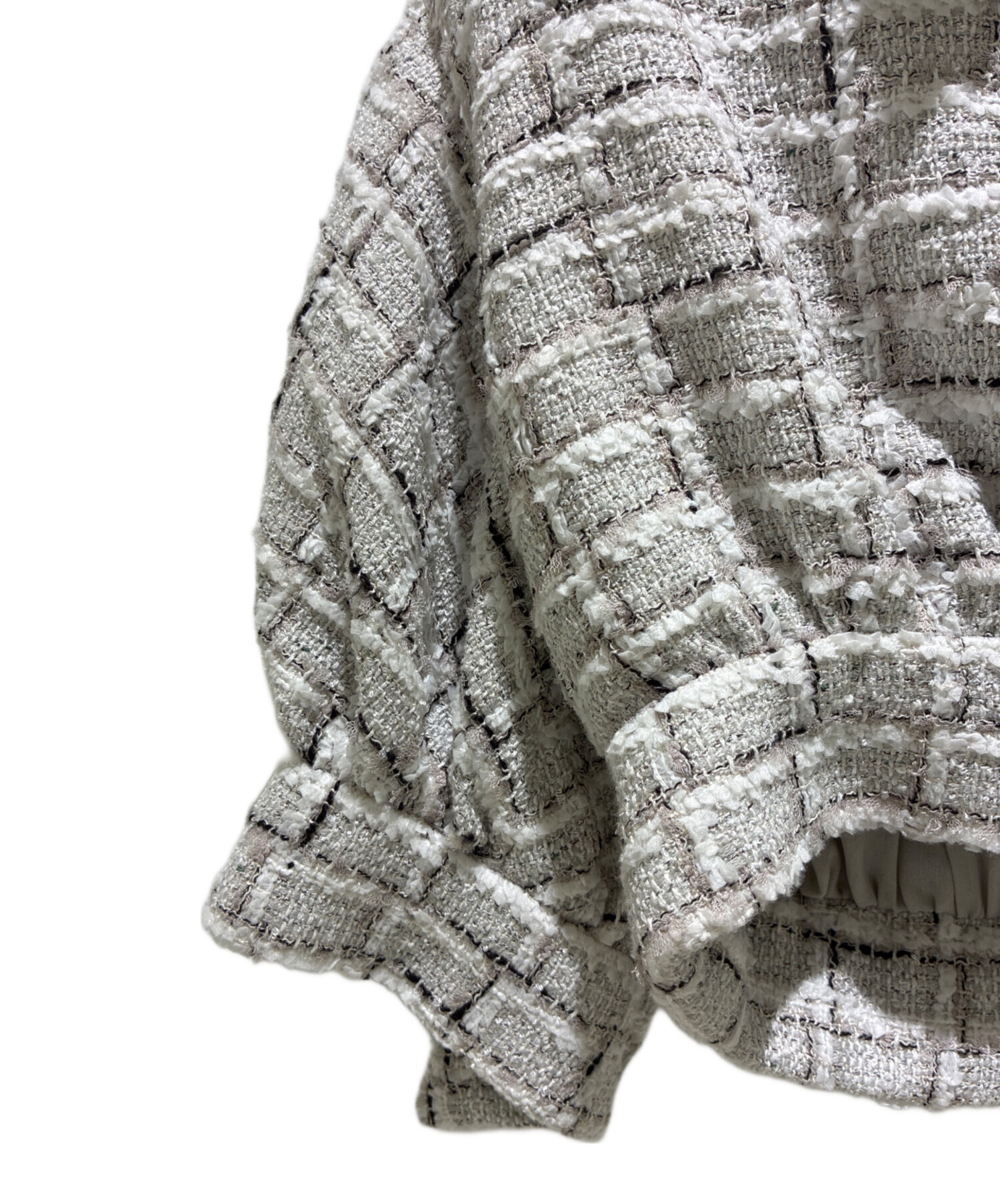 | スタッフコメント | クロップドシルエットが特徴的なショートジャケットでございます。ブランド特有のシャネルツイード生地によって、より上品な雰囲気を演出してくれます。シンプル無垢なホワイトとグレーのカラーパターンによって様々なコーデに合わせやすい点も魅力的なアイテムです。ワンピースとの相性が良いアイテムになっています。 |