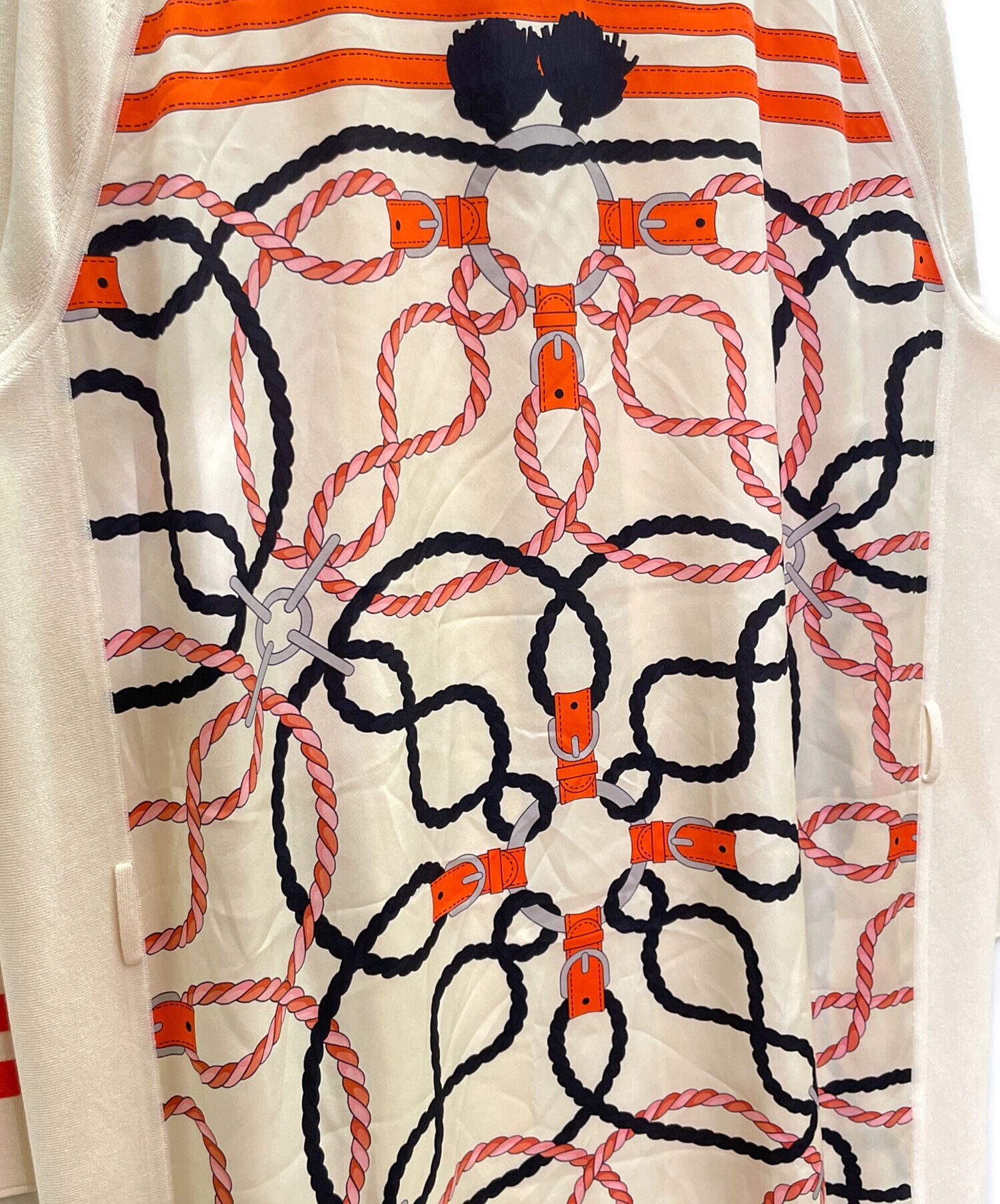 | スタッフコメント | スカーフ風シルク切替が特徴のエルメスのツイルレーヌカーディガンでございます。シルク100%のため、独自の自然な光沢感があり、品のある美しさを演出します。とてもなめらかで極上の着心地となっています。 |
