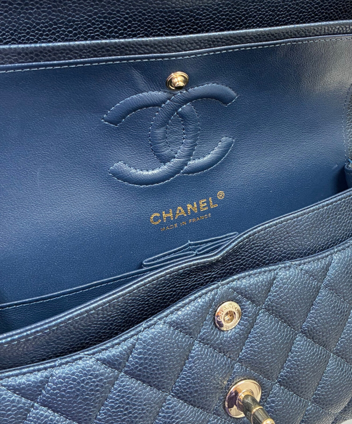 | スタッフコメント | Chanel(シャネル)のマトラッセ23 キャビアスキンは、上品なキルティングデザインと柔らかなキャビアレザーが特徴のハンドバッグです。コンパクトながら収納力があり、チェーンストラップでショルダーとしても使用可能。メタリックネイビーが様々なコーデと合わせやすく、デイリーからフォーマルまで幅広いシーンで活躍する逸品です。 |