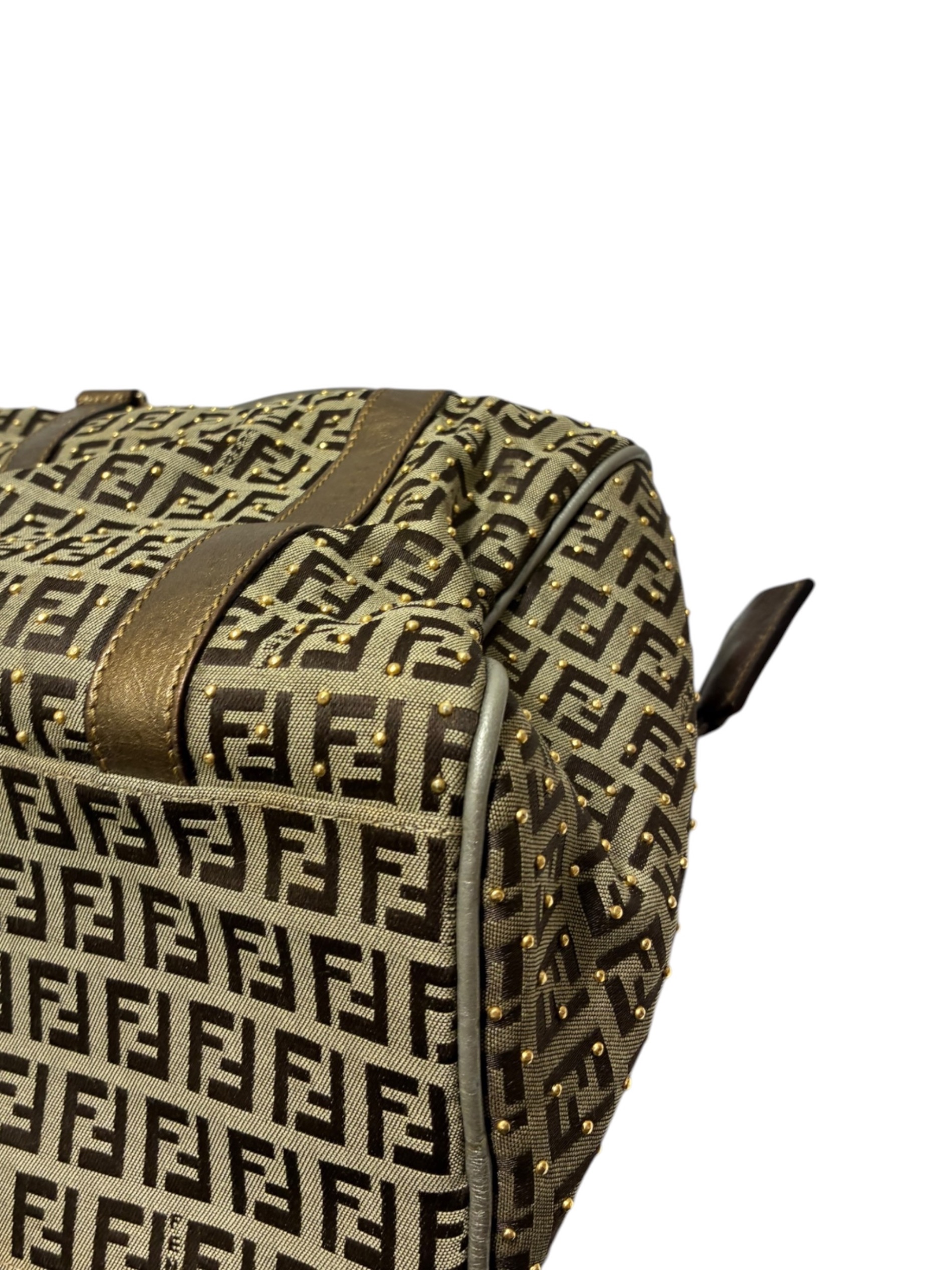 | スタッフコメント | FENDI(フェンディ)のスタッズミニボストンバッグです。ベージュ×ゴールドの配色にゴールドのスタッズがアクセントとなり、上品さと遊びごごろを両立したデザインになっております。軽量なキャンバス素材で扱いやすく、日常使いからお出かけまで幅広く対応する実用的な一品です。 |