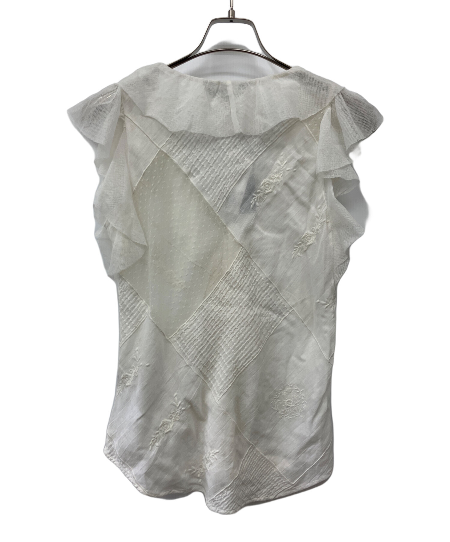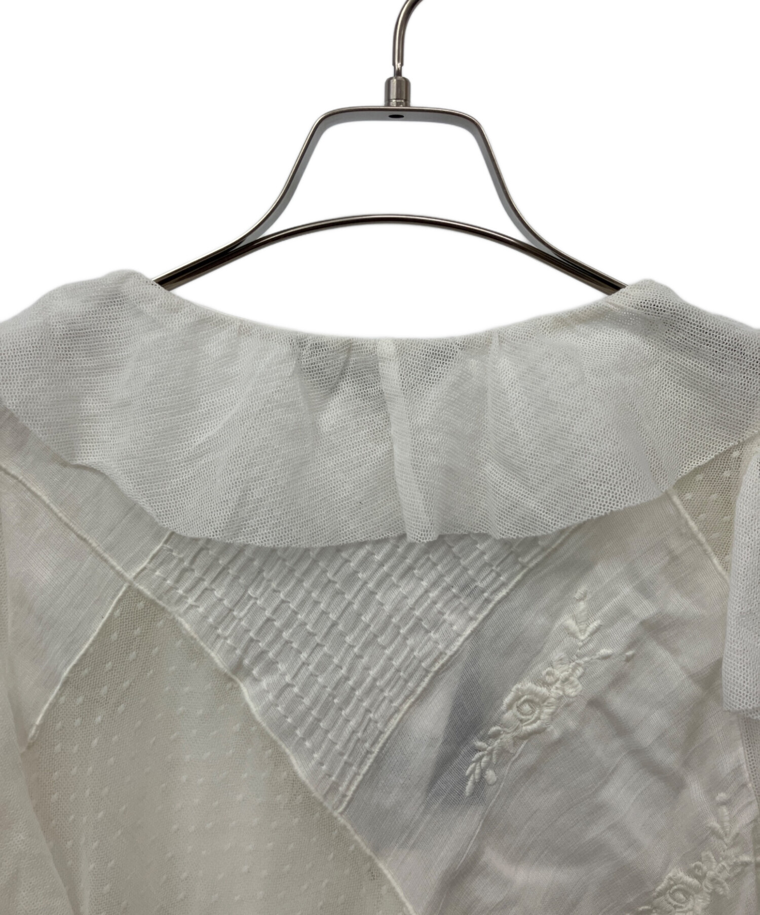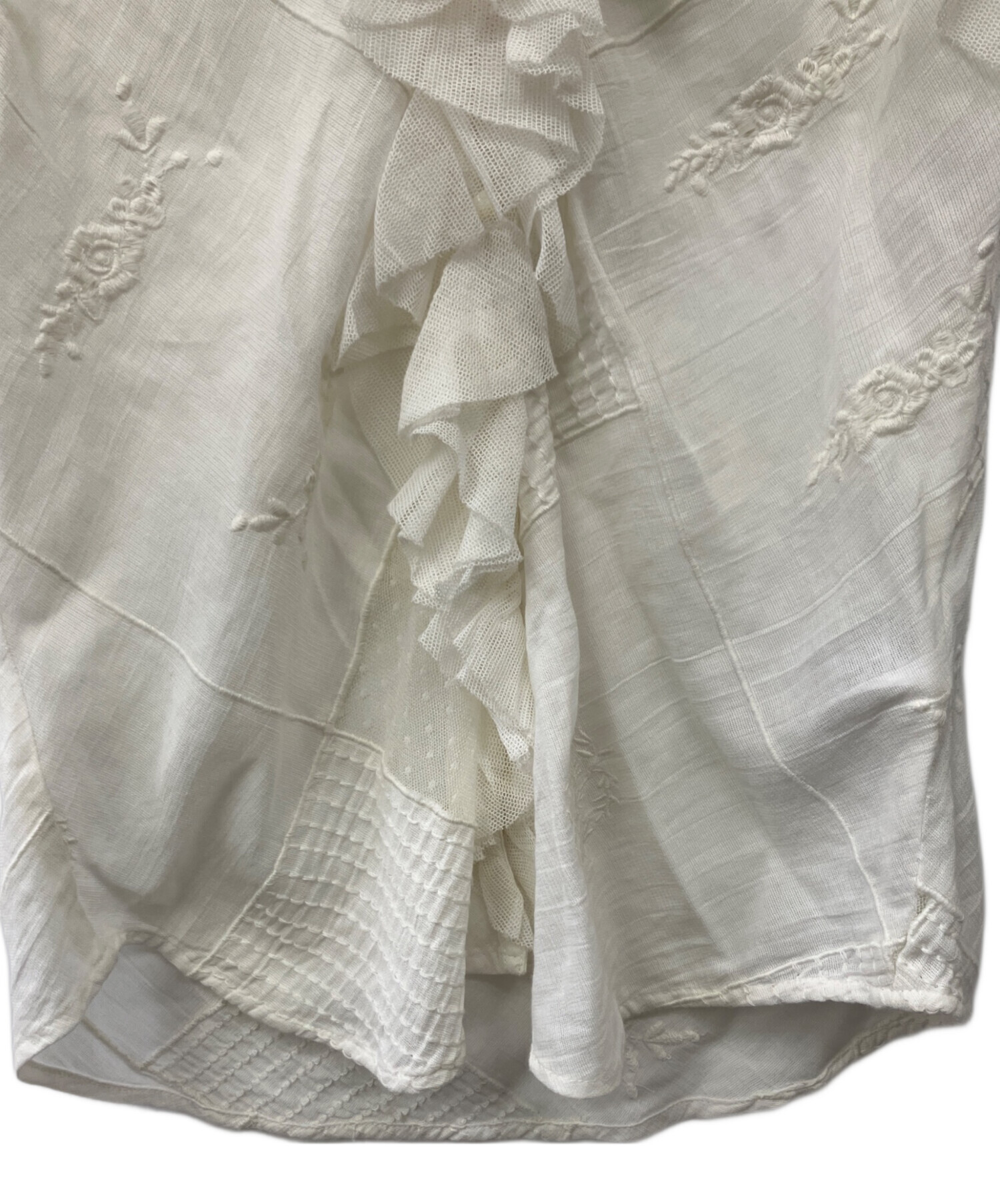 | 素材 | メッシュ部分:ナイロン 100% 布帛/部分:綿 52% レーヨン 48% ラッフル部分:綿 60% ナイロン 40% 刺繍糸:ポリエステル 100% 裏地:ポリエステル 100% |