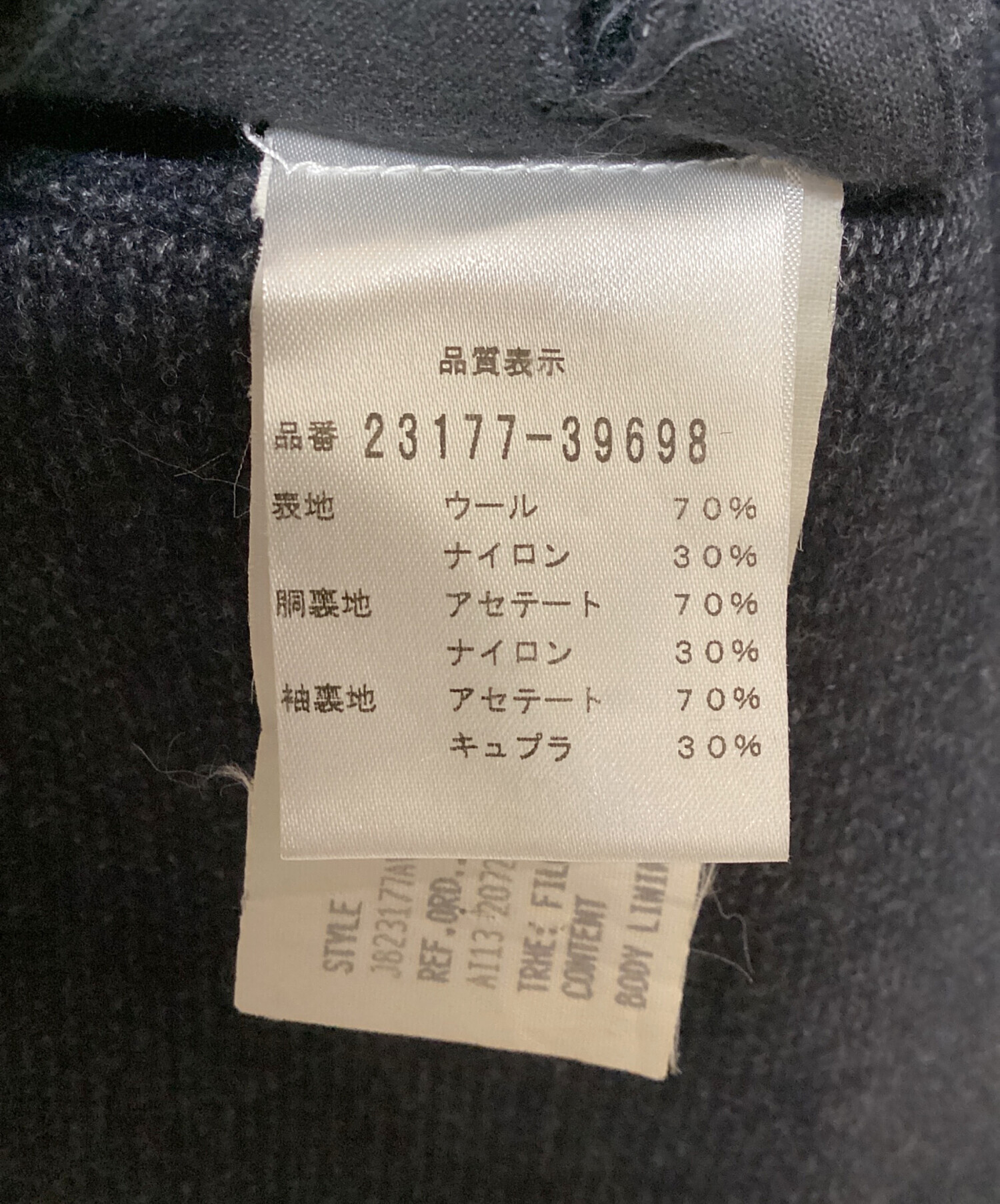 | 素材 | 表地: ウール 70% ナイロン 30% 胴裏地: アセテート 70% ナイロン 30% 袖裏地: アセテート 70% キュプラ 30% |