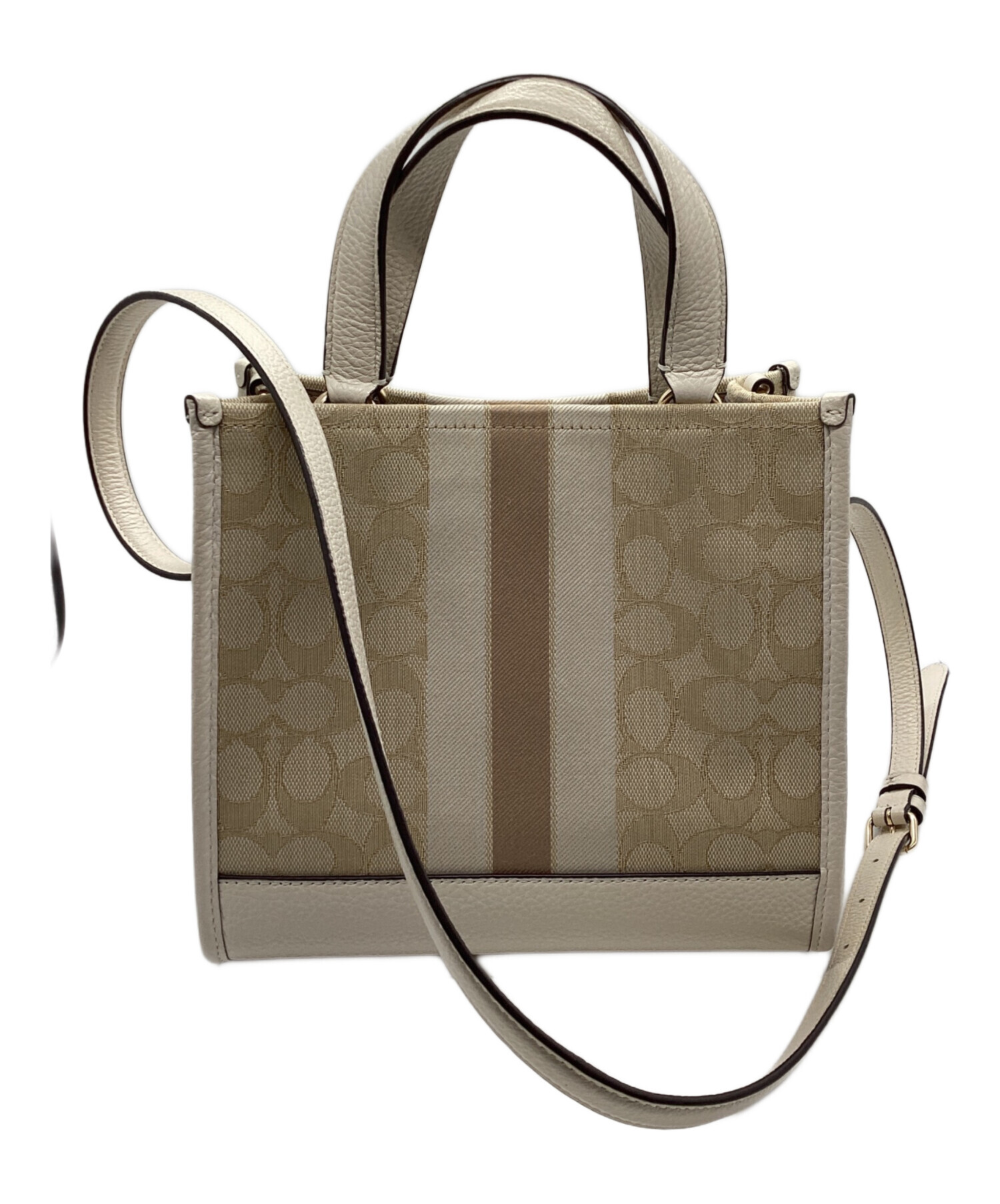 • COACH(コーチ)COACH (コーチ) デンプシートート22 シグネチャー ジャカード・ストライプ アンド コーチ パッチ ベージュの古着・服飾アイテム 側面にホツレ有