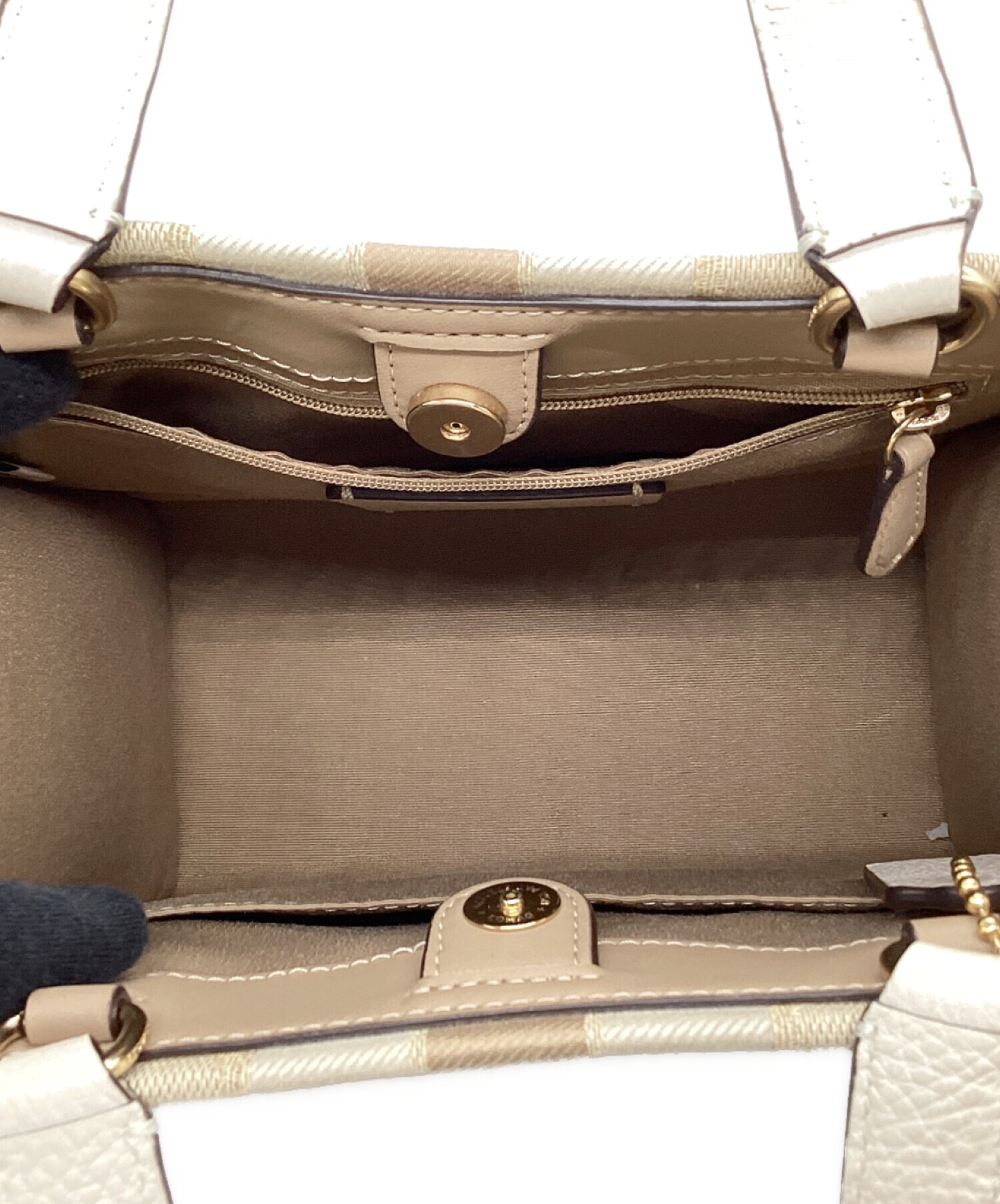 • COACH(コーチ)COACH (コーチ) デンプシートート22 シグネチャー ジャカード・ストライプ アンド コーチ パッチ ベージュの古着・服飾アイテム 内部状態