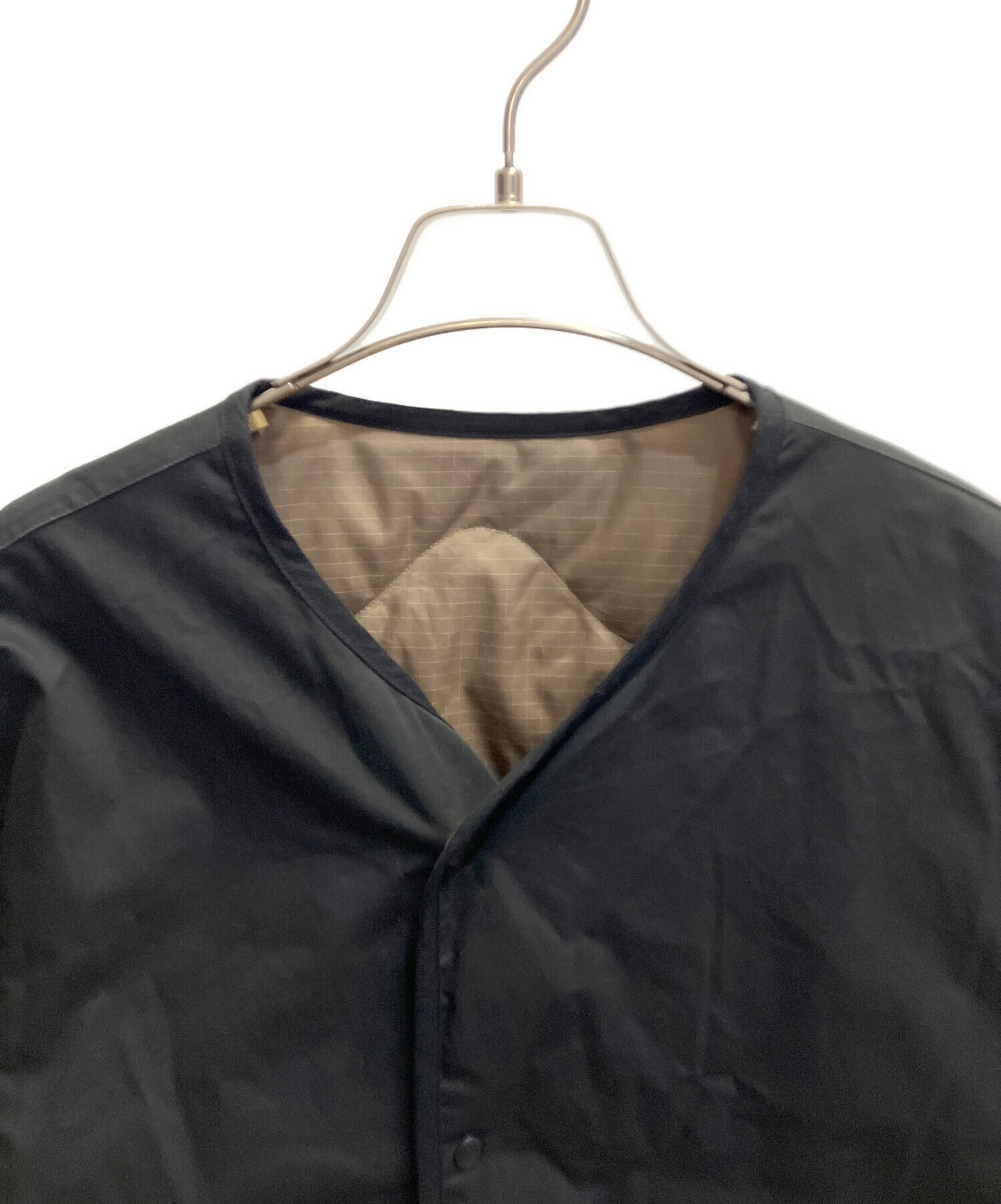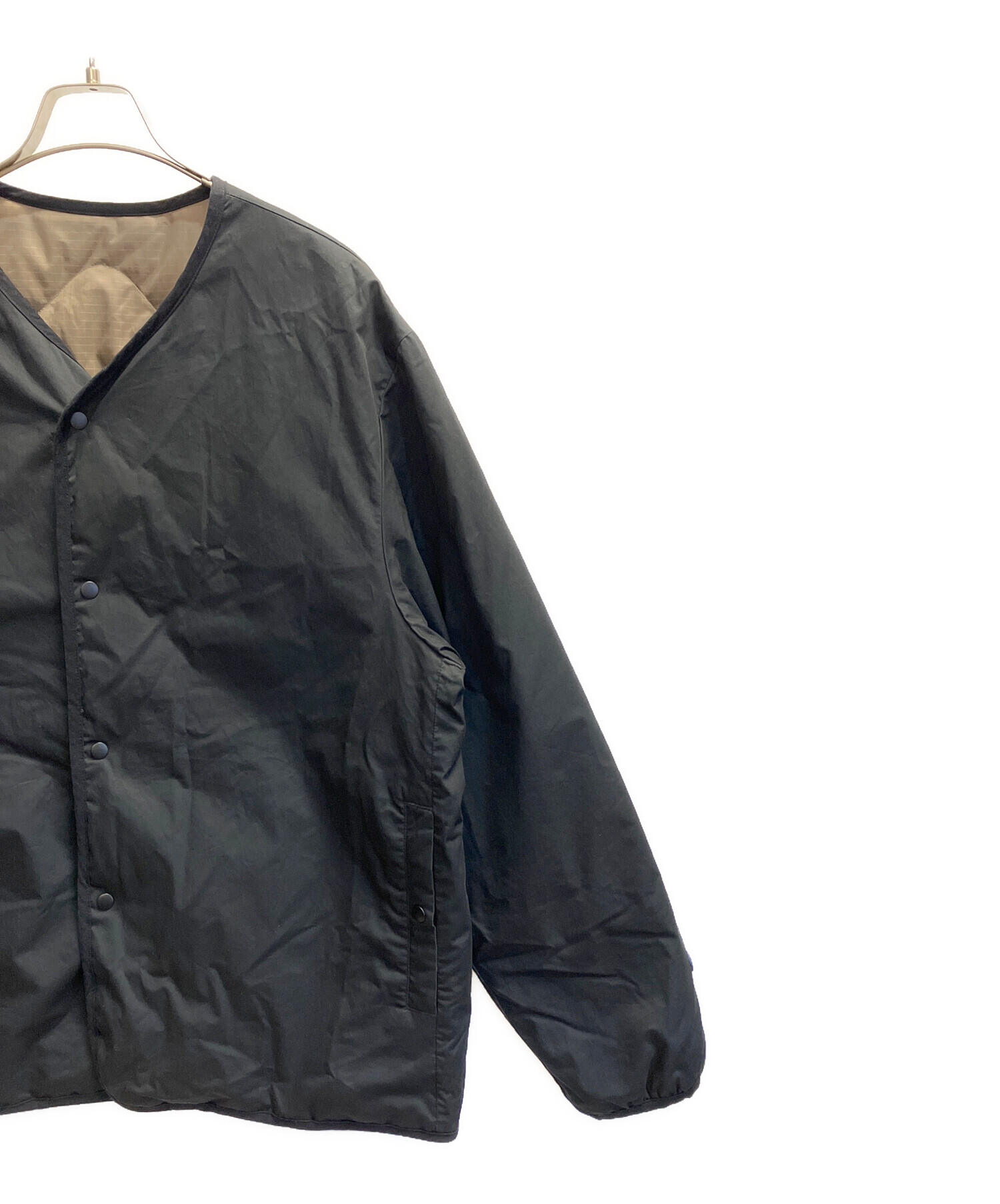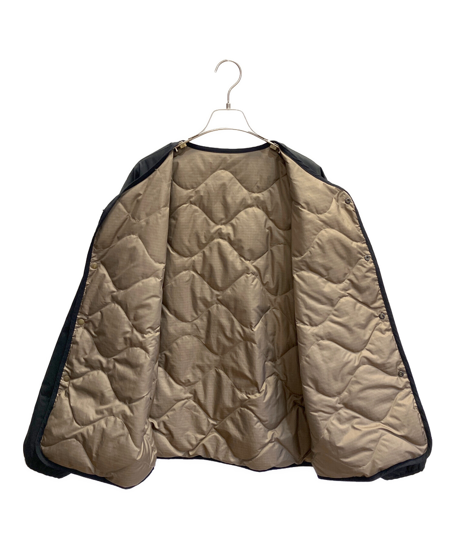 ミリタリーライナーをデザインベースにしたリバーシブル仕様のダウンカーディガンです。スナップボタンが2つあしらわれ、フォルムを絞ることも可能です。