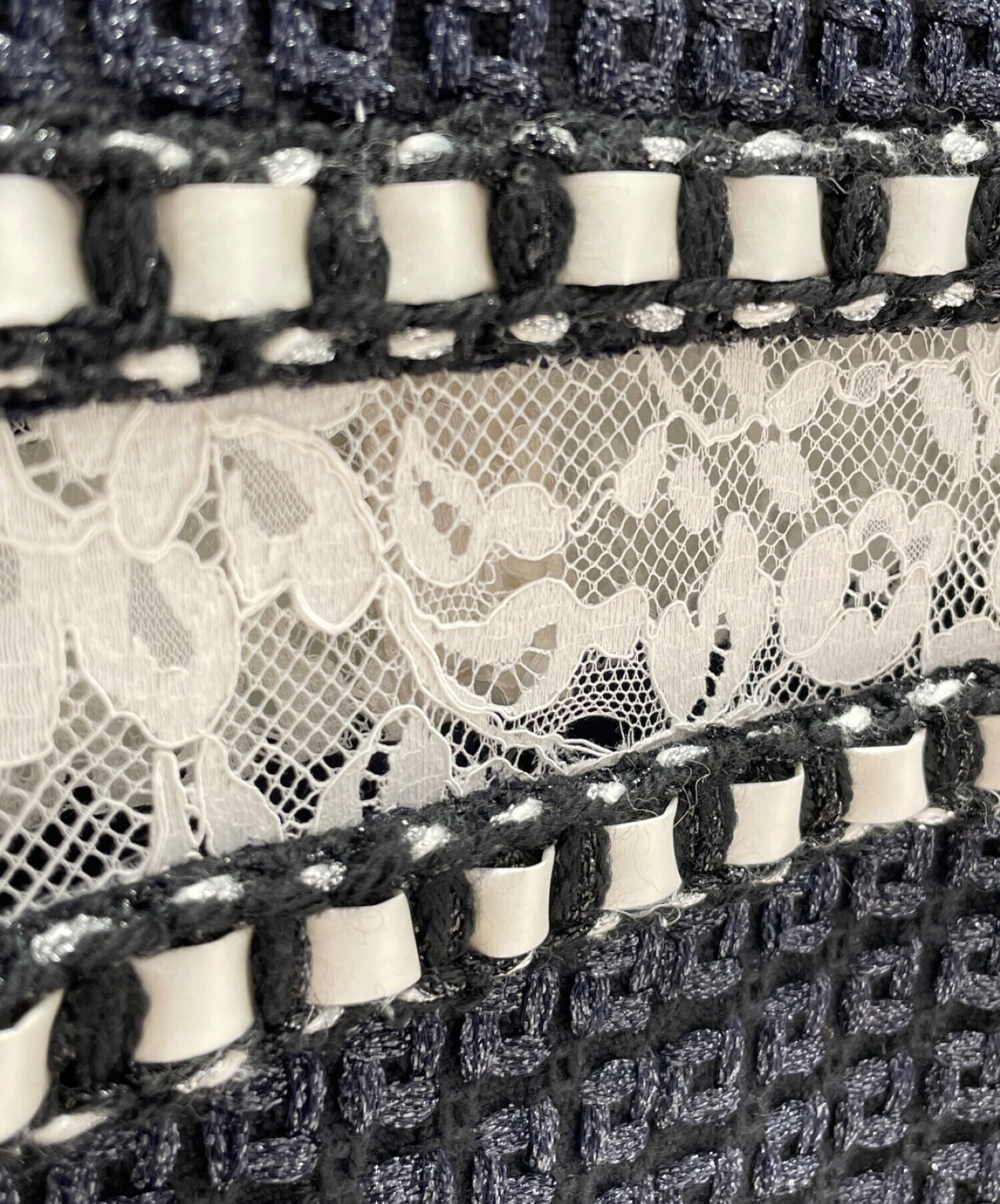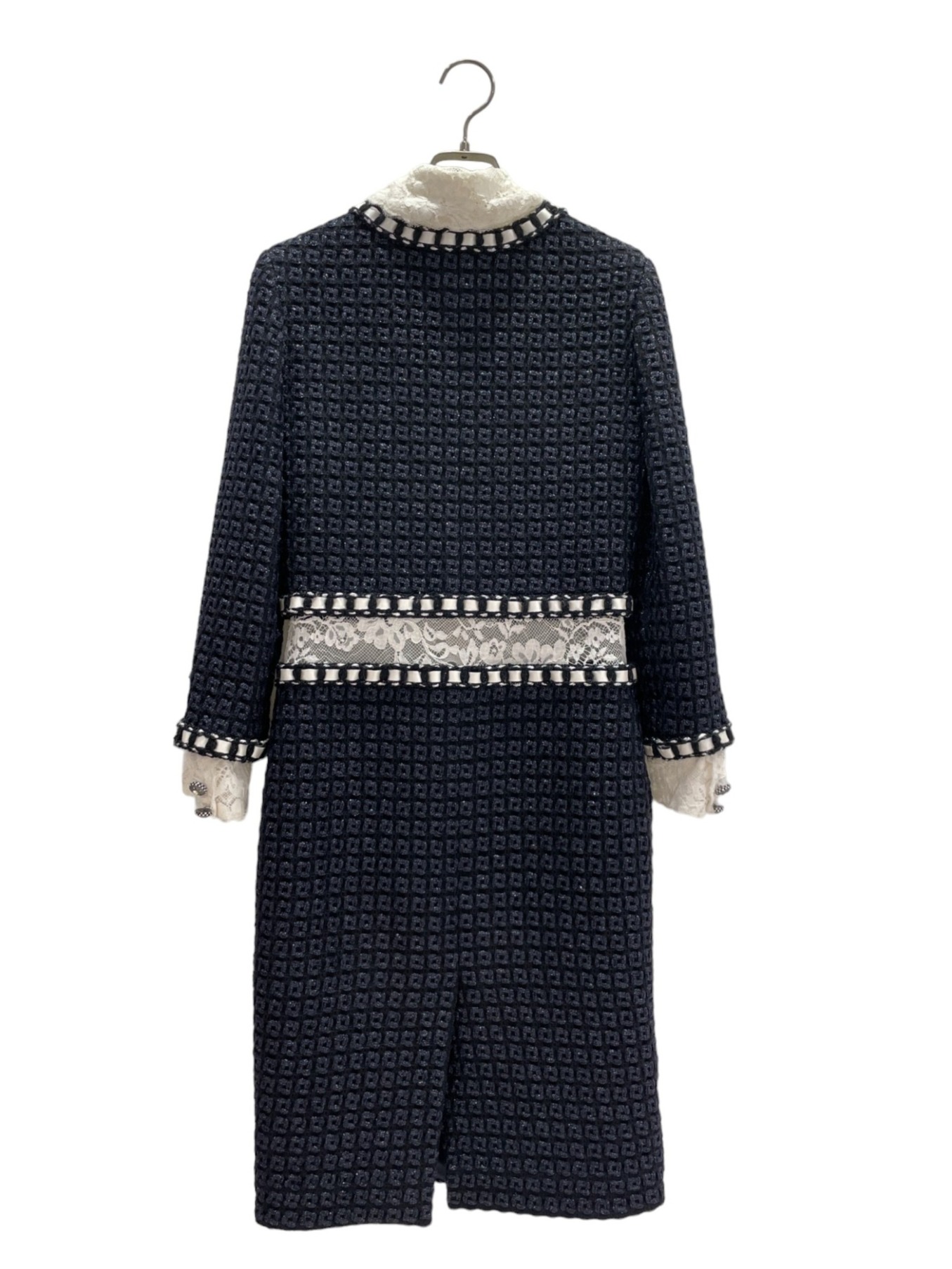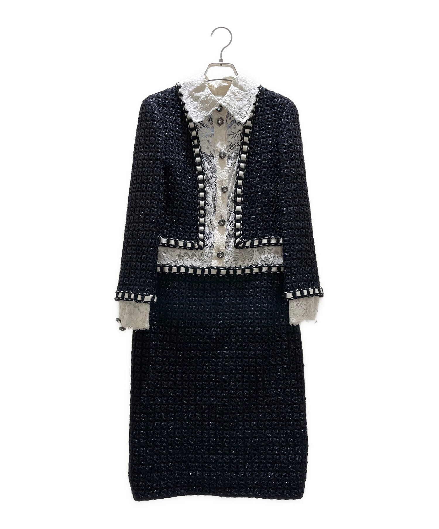 | スタッフコメント | CHANELを象徴するツイード生地で出来たのネイビーのワンピースでございます。セットアップのように見えますがレース素材で繋がっており、デザイン性の高さもありつつCHANELらしいエレガントさのある仕上がりとなっております。 |