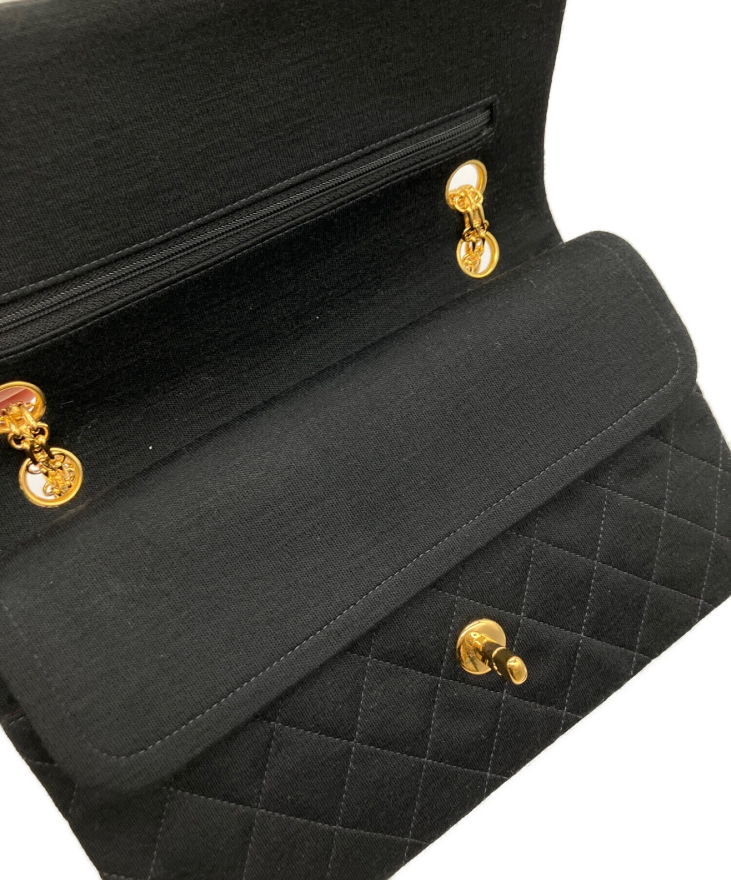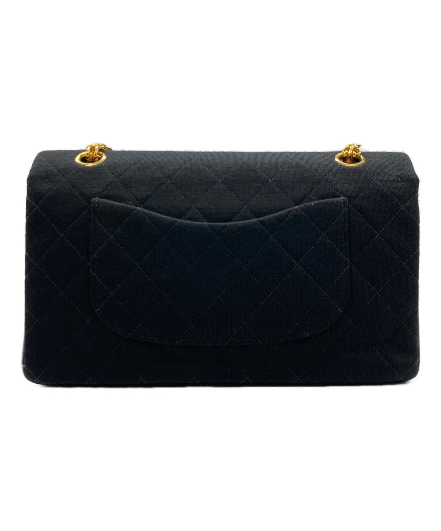 スタッフコメント ジャージー素材を使用したダブルフラップチェーンショルダーバッグでございます。レザー素材のチェーンショルダーバッグよりも軽量でカジュアルなデザインでございます。チェーンは2.55チェーンのゴールドカラーで、カジュアルなデザインの中に品を感じる逸品です。