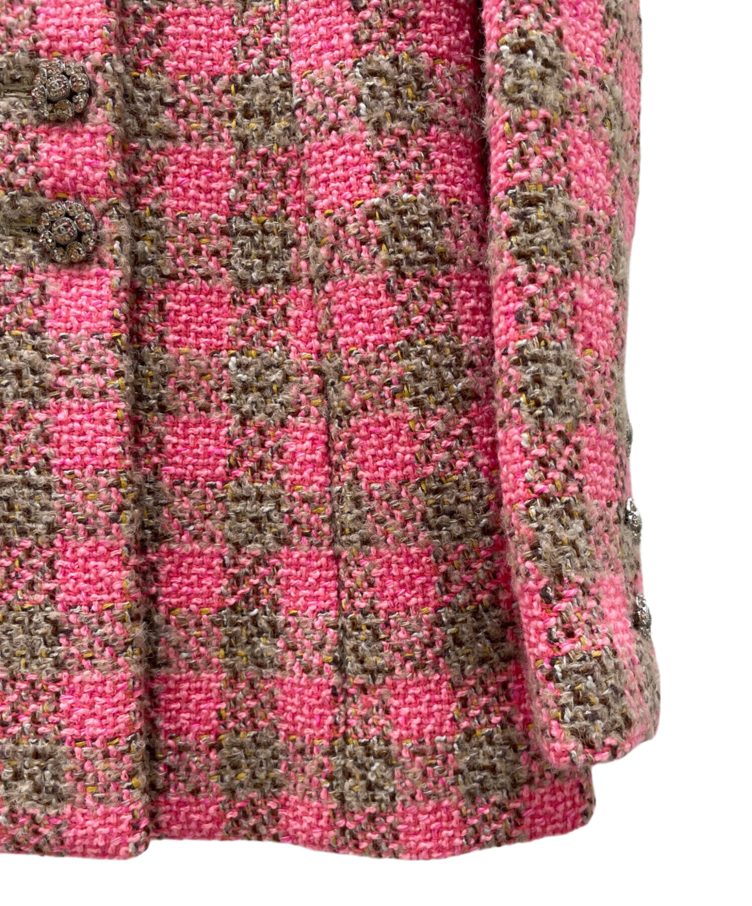 | スタッフコメント | シャネルのロングツイードジャケットでございます。鮮やかなピンクとブラウンのチェック柄とココマークとカラーストーンの組み合わせのボタンが、華やかで上品な仕上がりとなっております。ウエストラインの絞りがすっきりとした印象にしてくれます。 |
