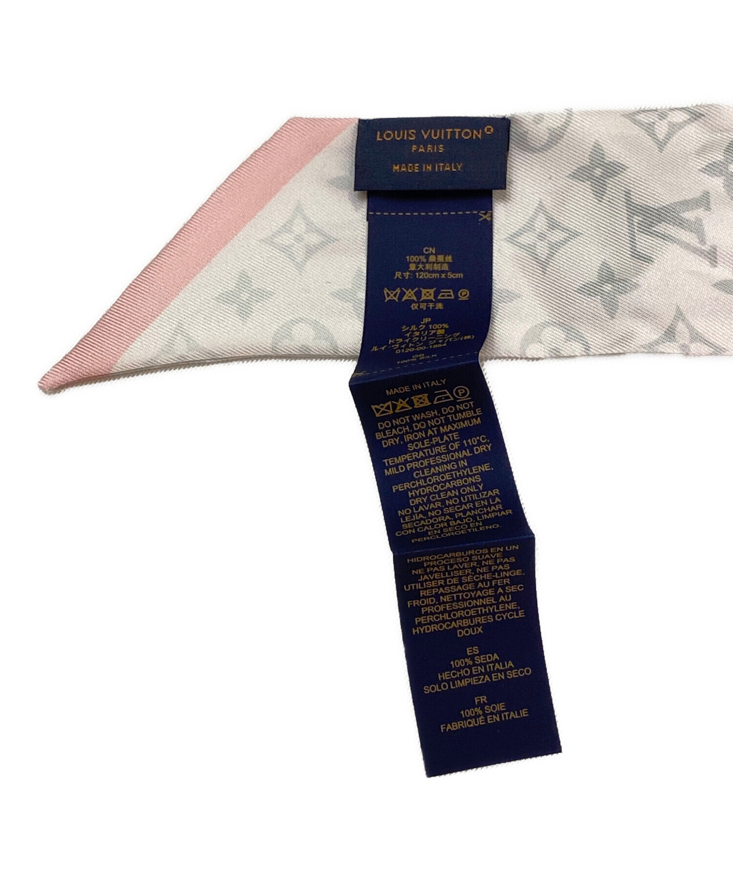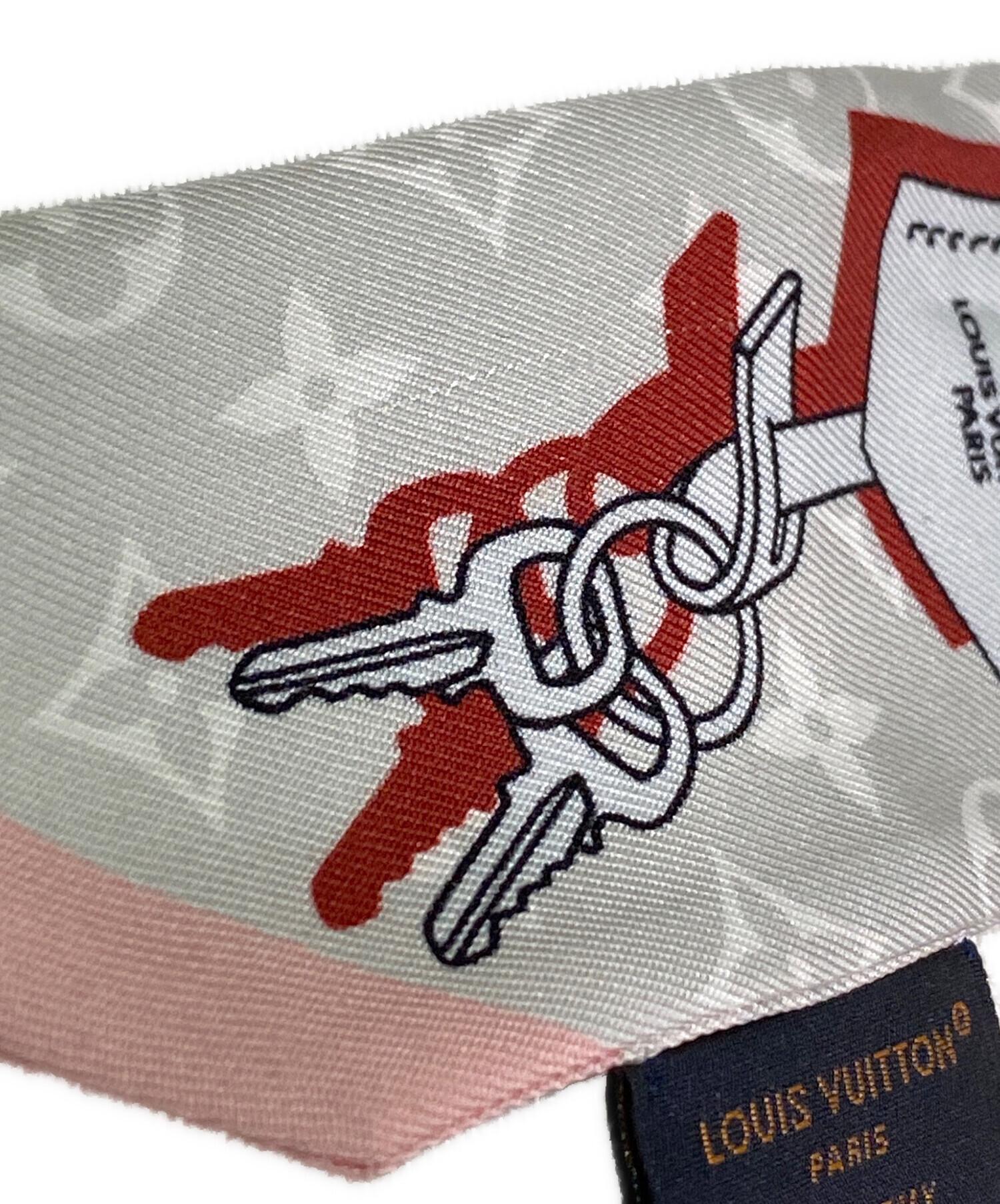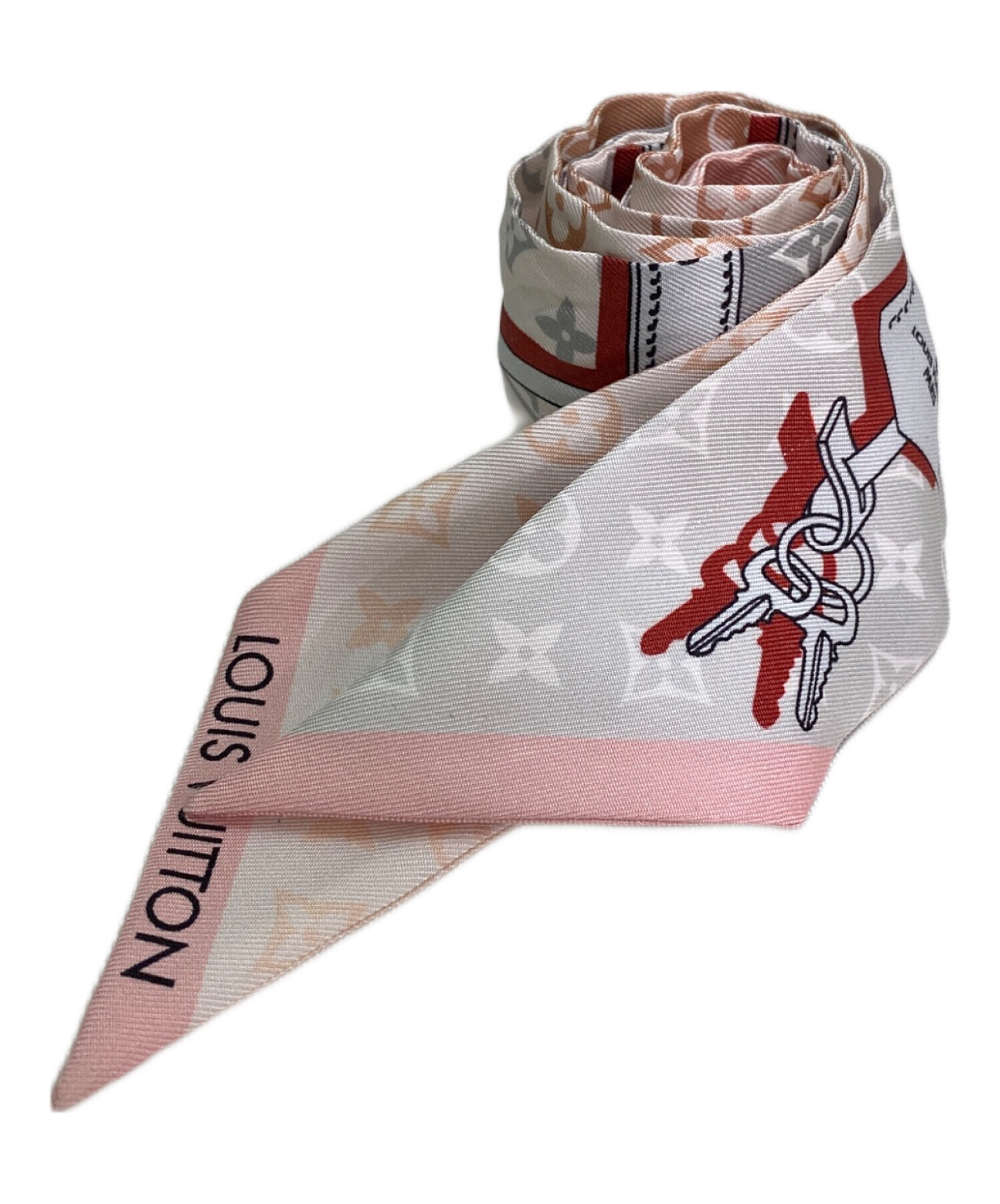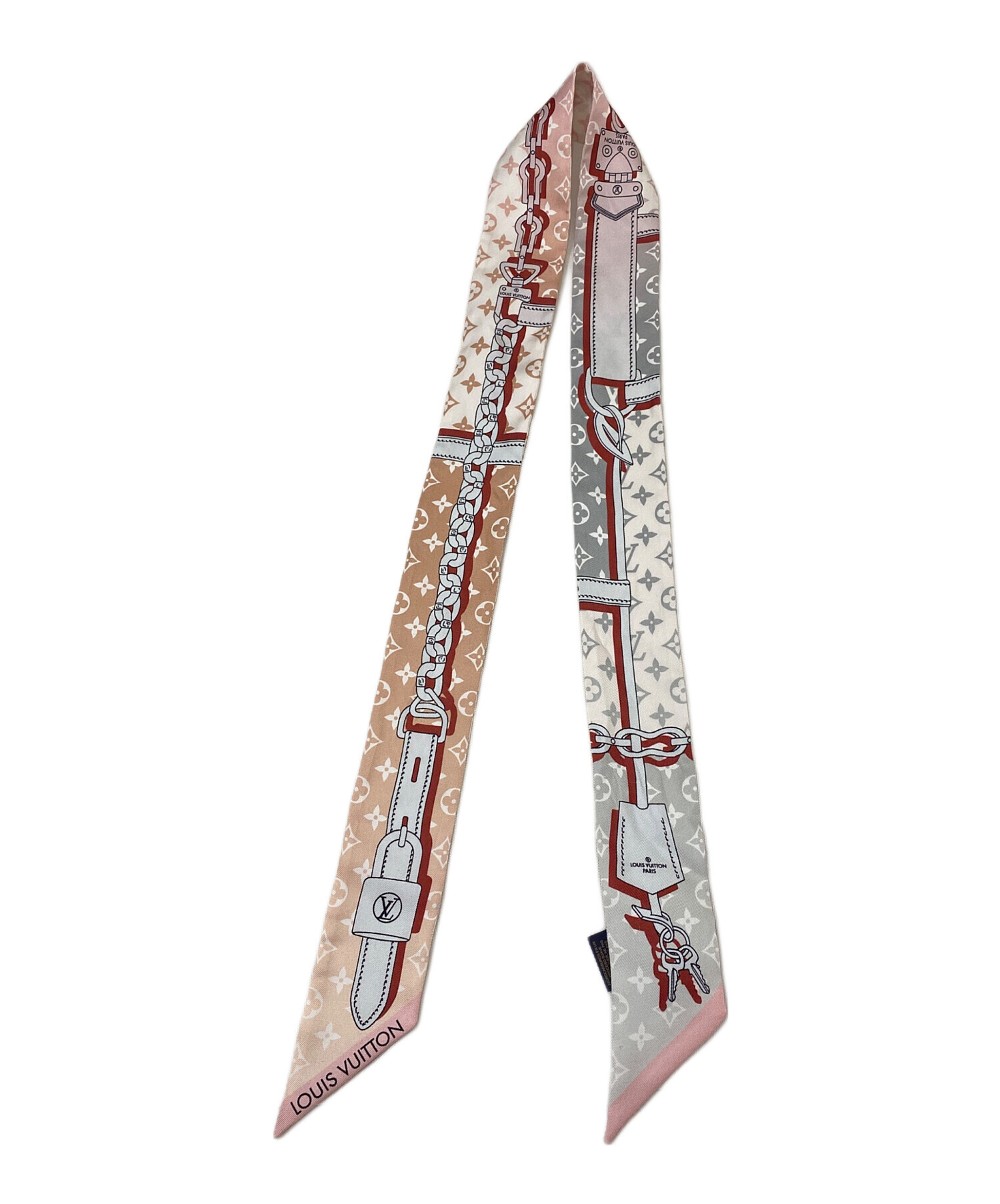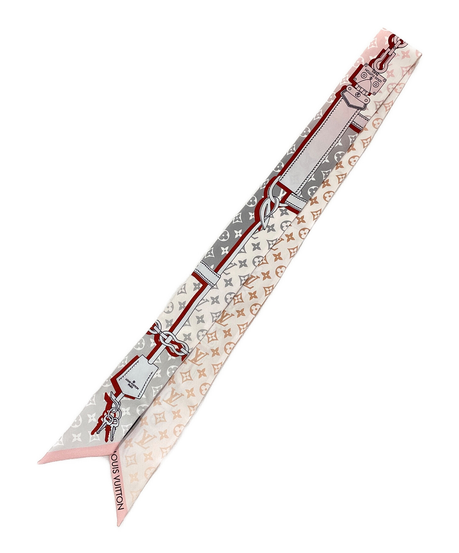 | スタッフコメント | Louis Vuittonのツイリースカーフでございます。ストラップとロックのモチーフでユニークなパターンが遊び心のあるデザインです。優しいピンクのお色味はバッグと合わせるだけでなく、ベルトやヘアアクセサリーとしてのご使用もオススメです。 |