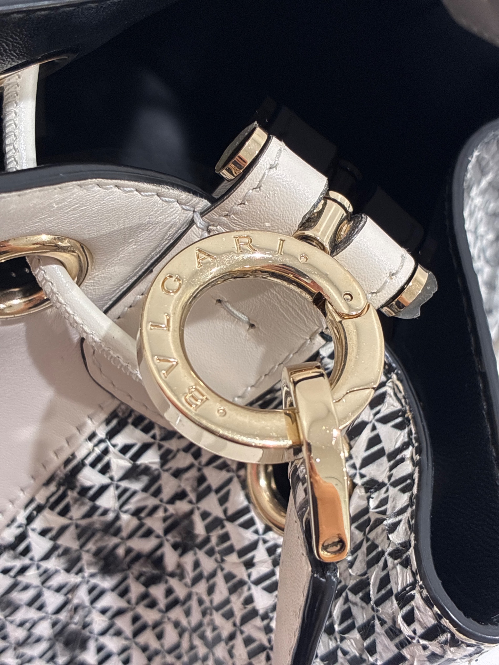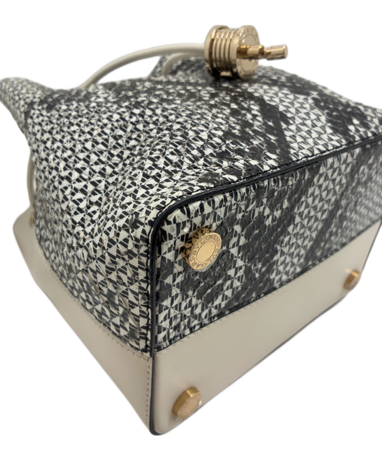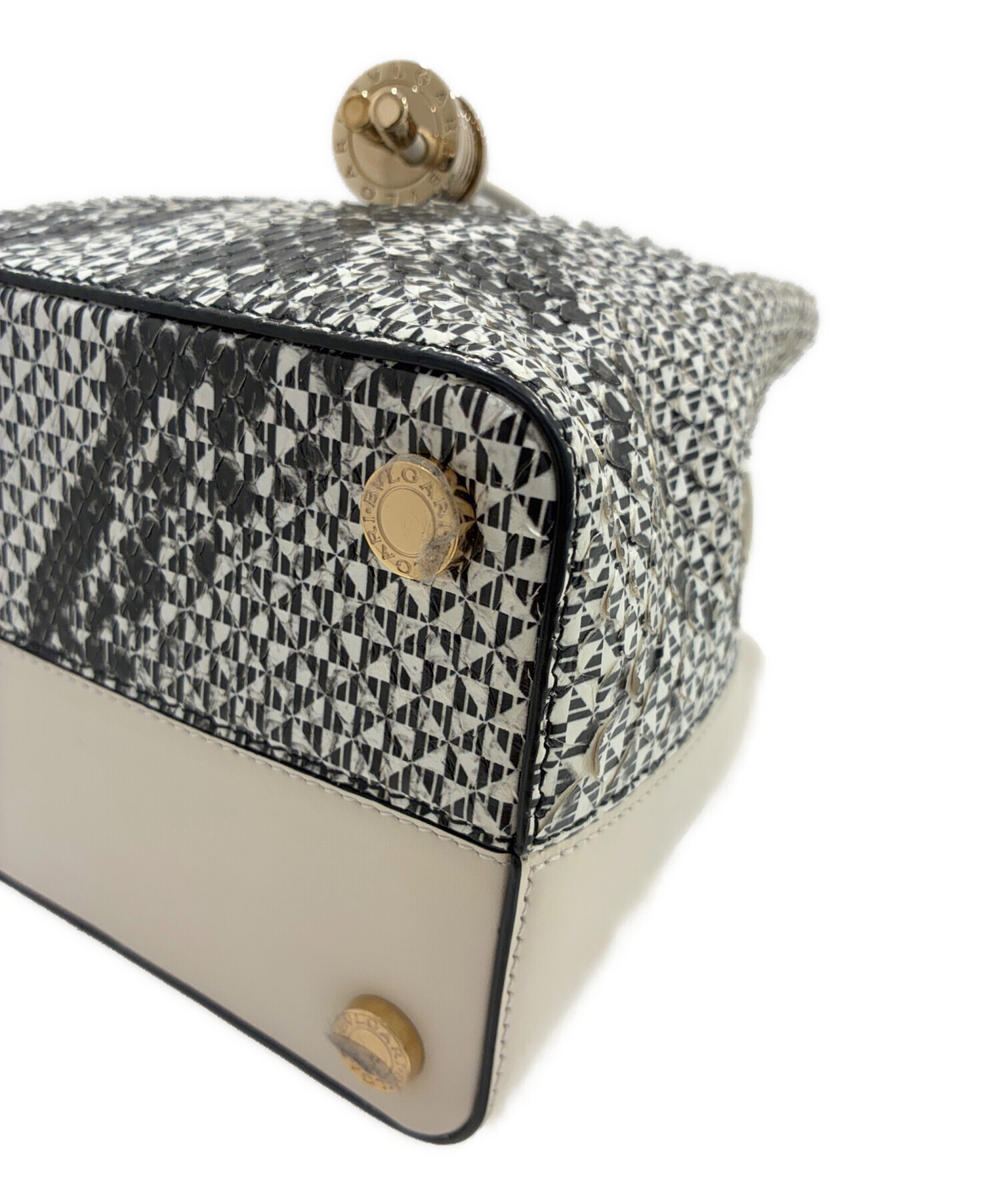 | スタッフコメント | 留め具がブルガリのB-zero1になったバケットショルダーバッグでございます。パイソン柄とのバイカラーデザインが目を引きます。マチがしっかりとあるため、小さいサイズのペットボトルなども入り、容量もあるため、見た目以上に収納可能です。コーディネートのワンポイントにおすすめのバッグになります。 |