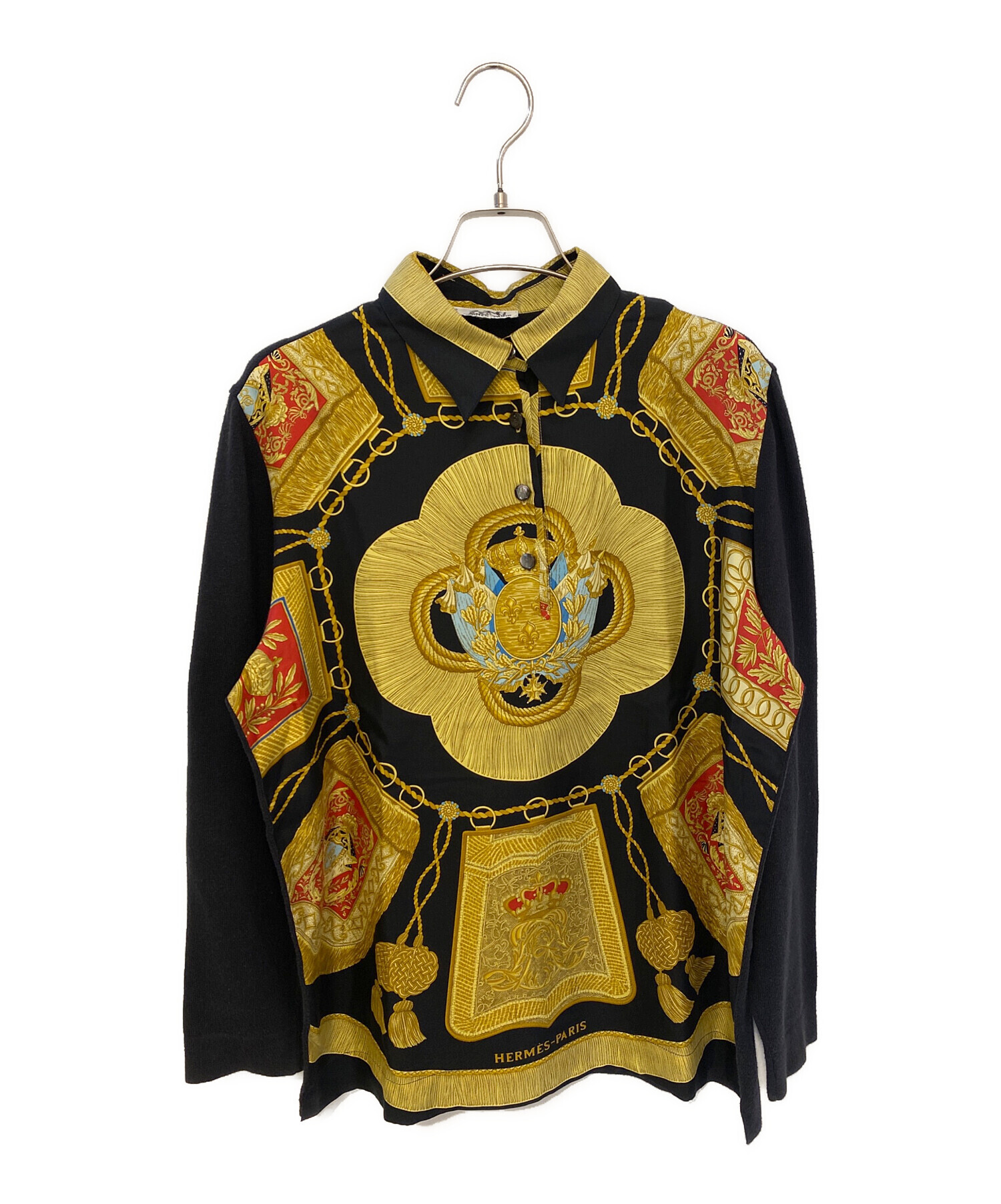 スタッフコメント HERMESならではの上質さが際立つ、シルクスカーフ切替デザインのニットポロシャツ。ニットの落ち着いた表情に、シルク素材の切替が加わることで、奥行きのあるエレガントな印象に仕上がっています。ブラックカラーで全体を引き締めつつ、さりげない華やかさも兼ね備え、パンツにもスカートにも好相性。一枚で品のあるスタイリングが完成するアイテムです。
