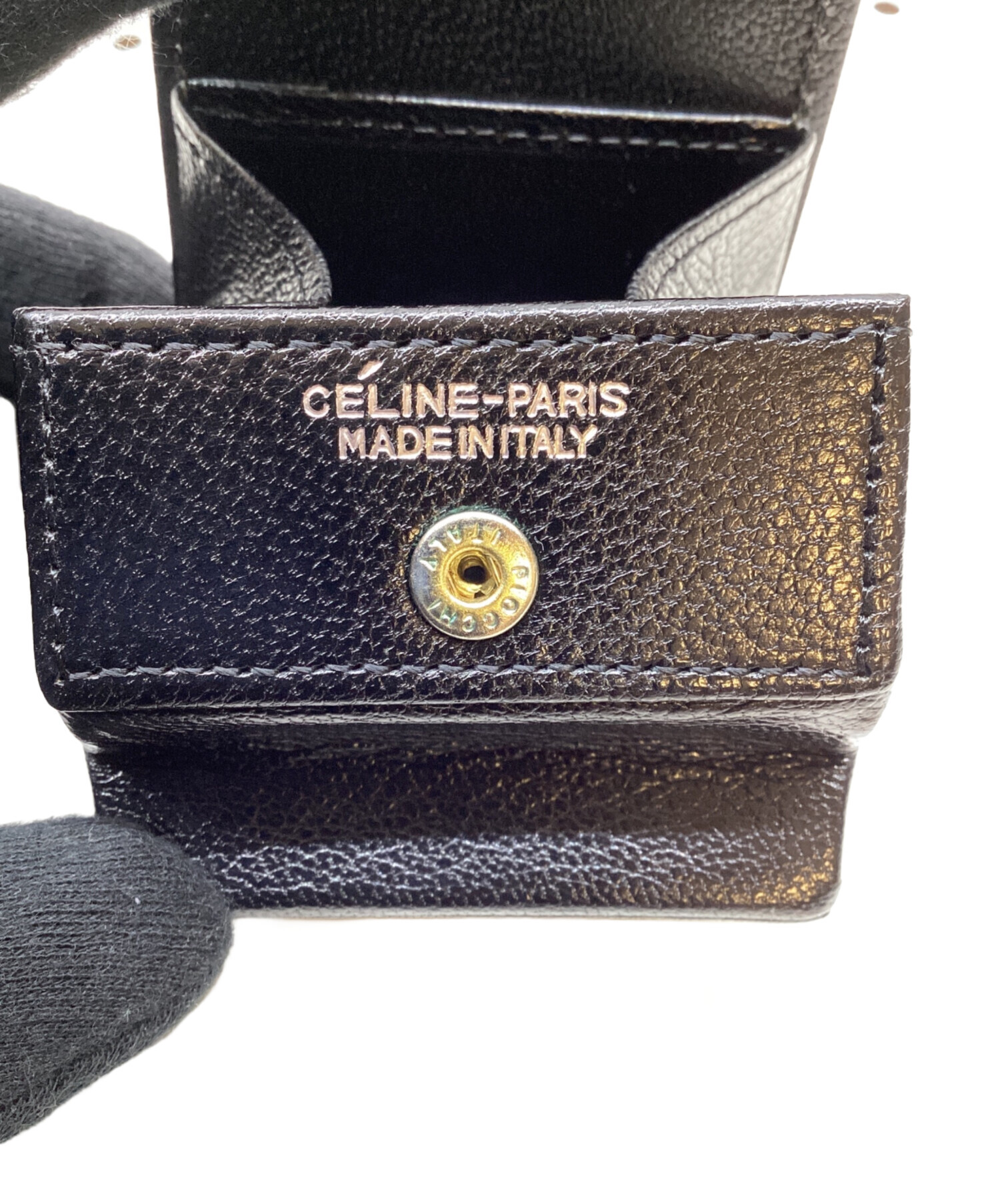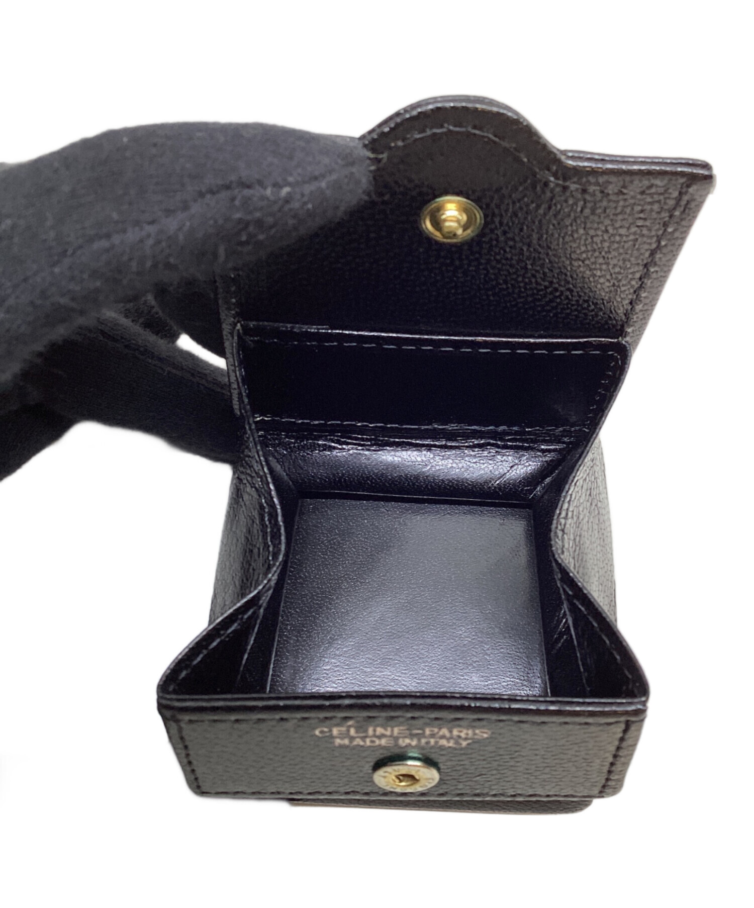| スタッフコメント | CELINE(セリーヌ)のコインケース。 ボタンを開くと、折り畳まれたマチが広がり想像以上の収納力に驚かされます。 シンプルなデザインかつ男女問わず使用できるブラックなので、日常使いにおすすめです。 |