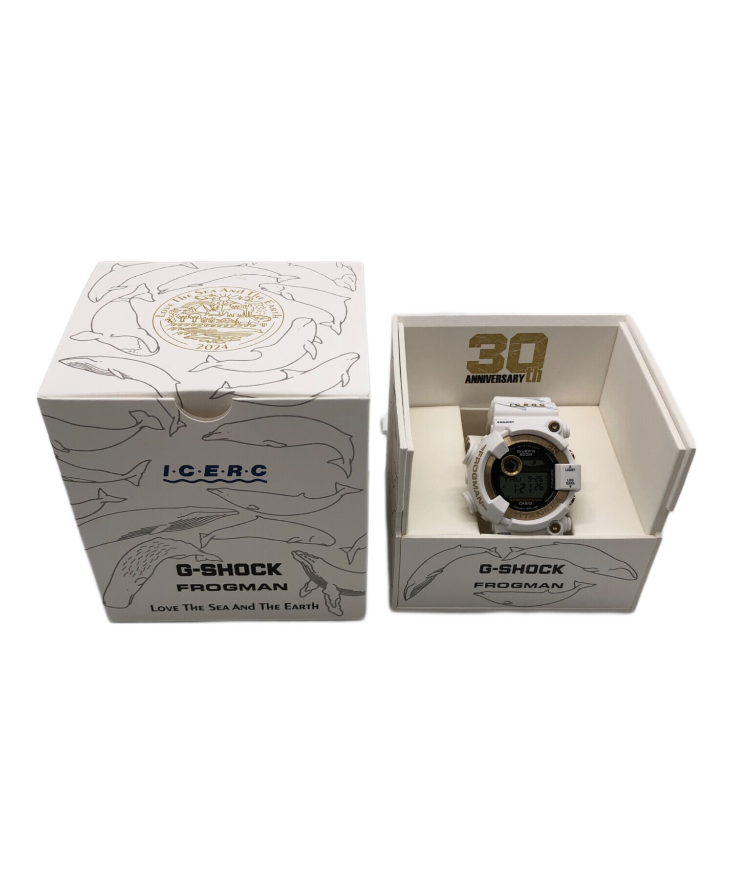 | スタッフコメント | 「ICERC Japan」とのコラボレーション30周年記念モデルの腕時計になります。 LEDバックライト点灯時、液晶にシロナガスクジラのシルエットが浮かび上がります。 |