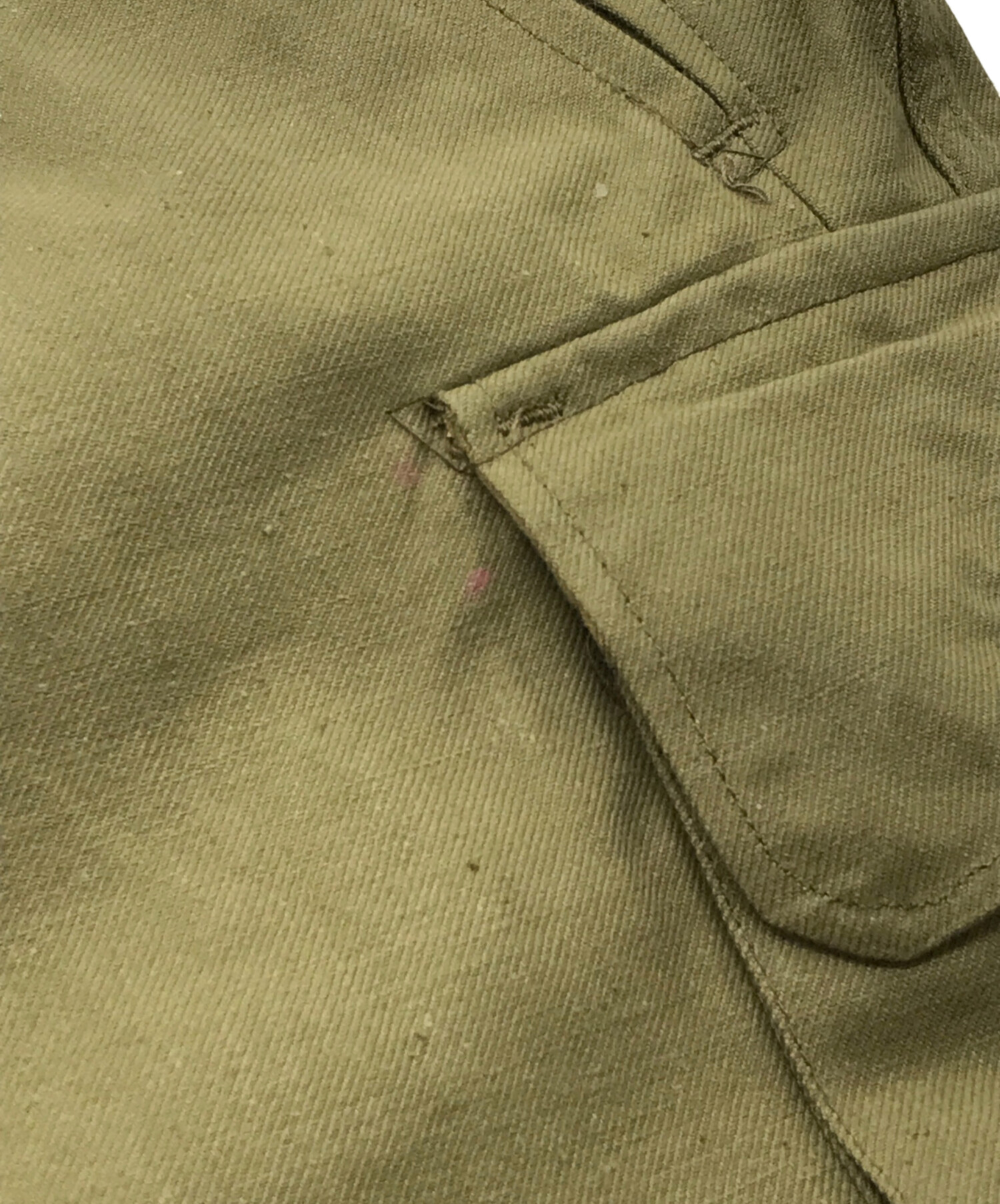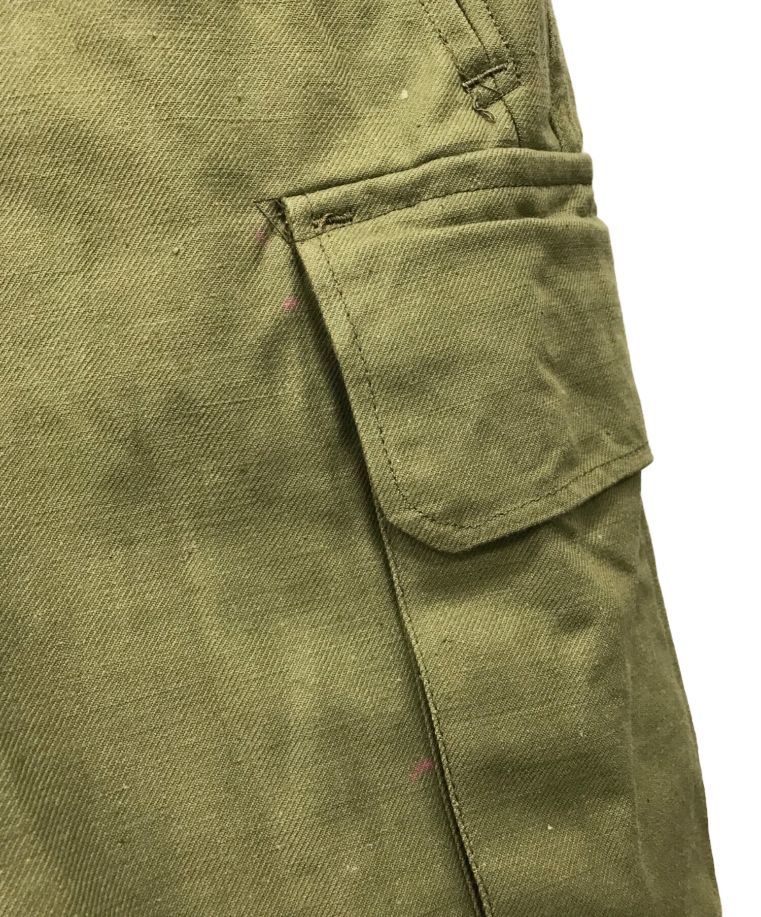 | 状態 | サイドポケット部分を中心に細かなヨゴレがございます(写真5・6枚目参照) 膝部分に補修跡がございます(写真7枚目参照) 写真8・9枚目のように糸のほつれ箇所が多数ございます。 写真10枚目のようにヤケ・変色がございます。 こちらの商品は中古品の為、使用に伴いますキズ、汚れが各所に見受けられます。店頭にて展示販売を行っている為、記載に無い細かなキズ、汚れが見受けられる場合がございます。 |
