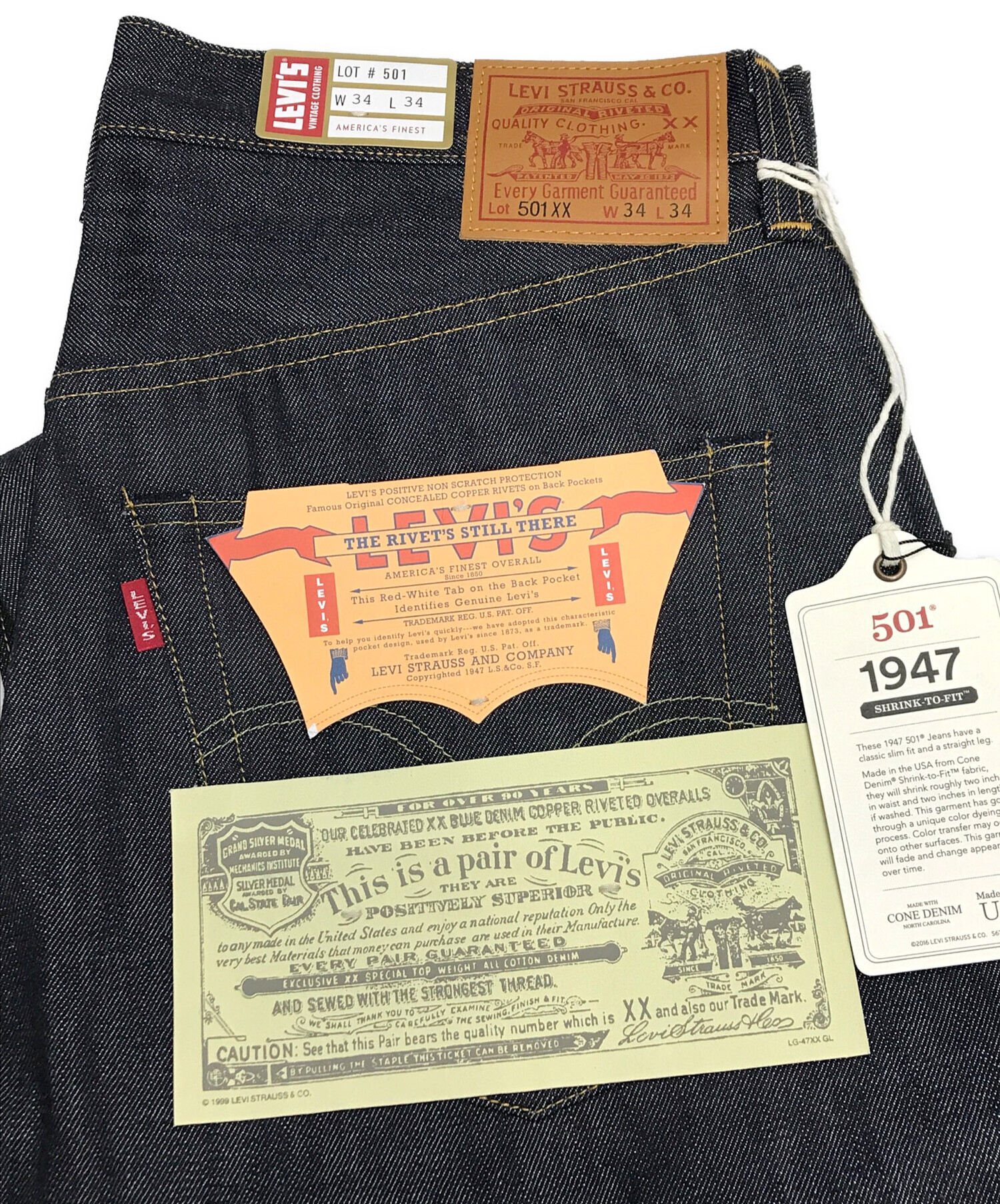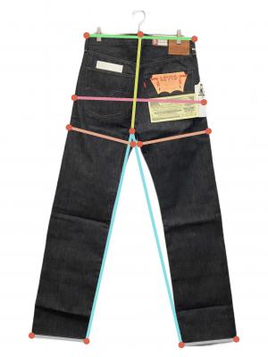 | 備考 | ホワイトオーク最終 ボタンフライ 赤耳付きウォッチポケット レザーパッチ 隠しリベット 片面BigE ダイヤモンドポイントアーキュエットステッチ |