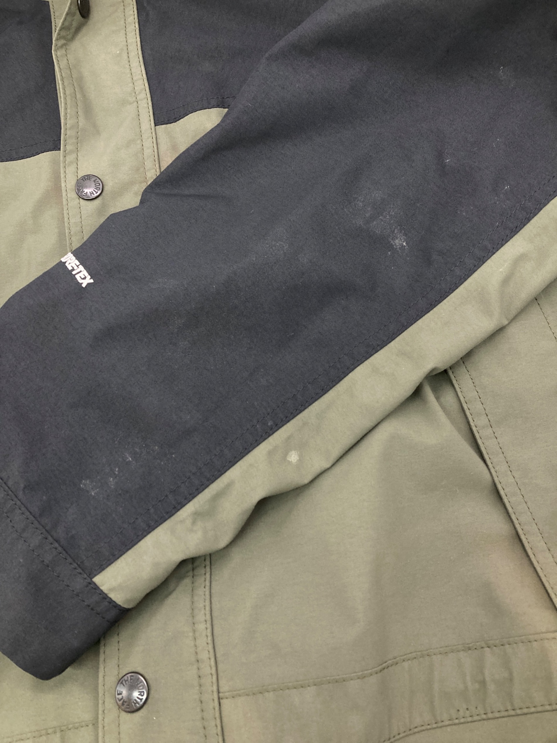 • THE NORTH FACE(ザ ノース フェイス)THE NORTH FACE (ザ ノース フェイス) Mountain Light Jacket カーキ×ブラック サイズ:XLの古着・服飾アイテム ヨゴレ