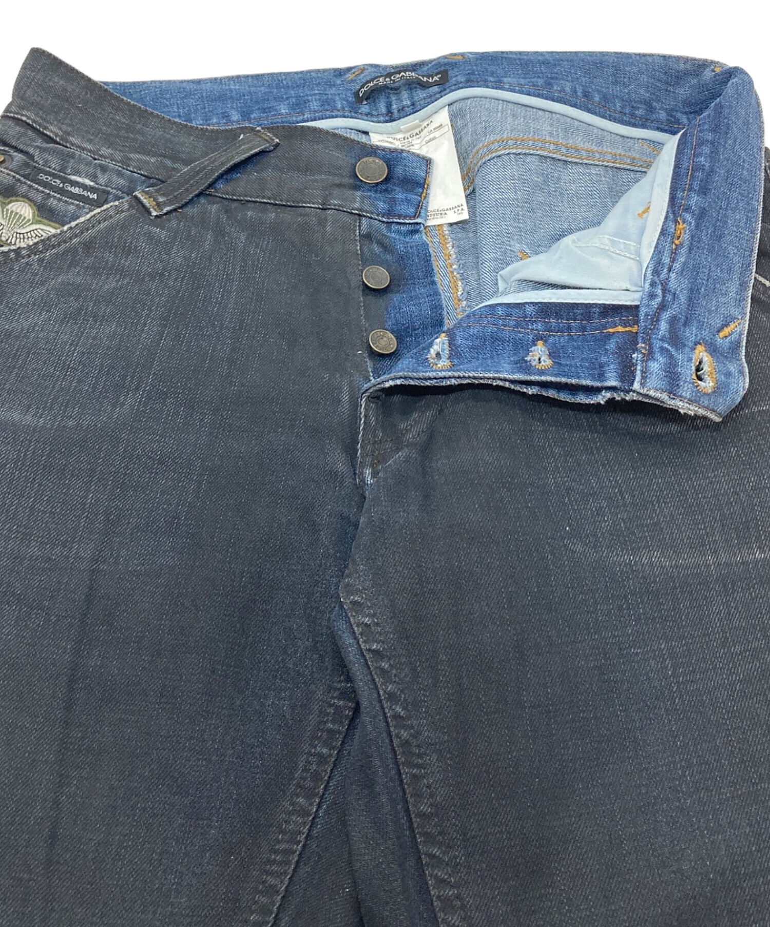 • DOLCE & GABBANA(ドルチェ&ガッバーナ)DOLCE & GABBANA (ドルチェ&ガッバーナ) ミリタリーワッペンサイドロゴ後染デニムパンツ ブラック サイズ:48の古着・服飾アイテム 裾スレやダメージあり